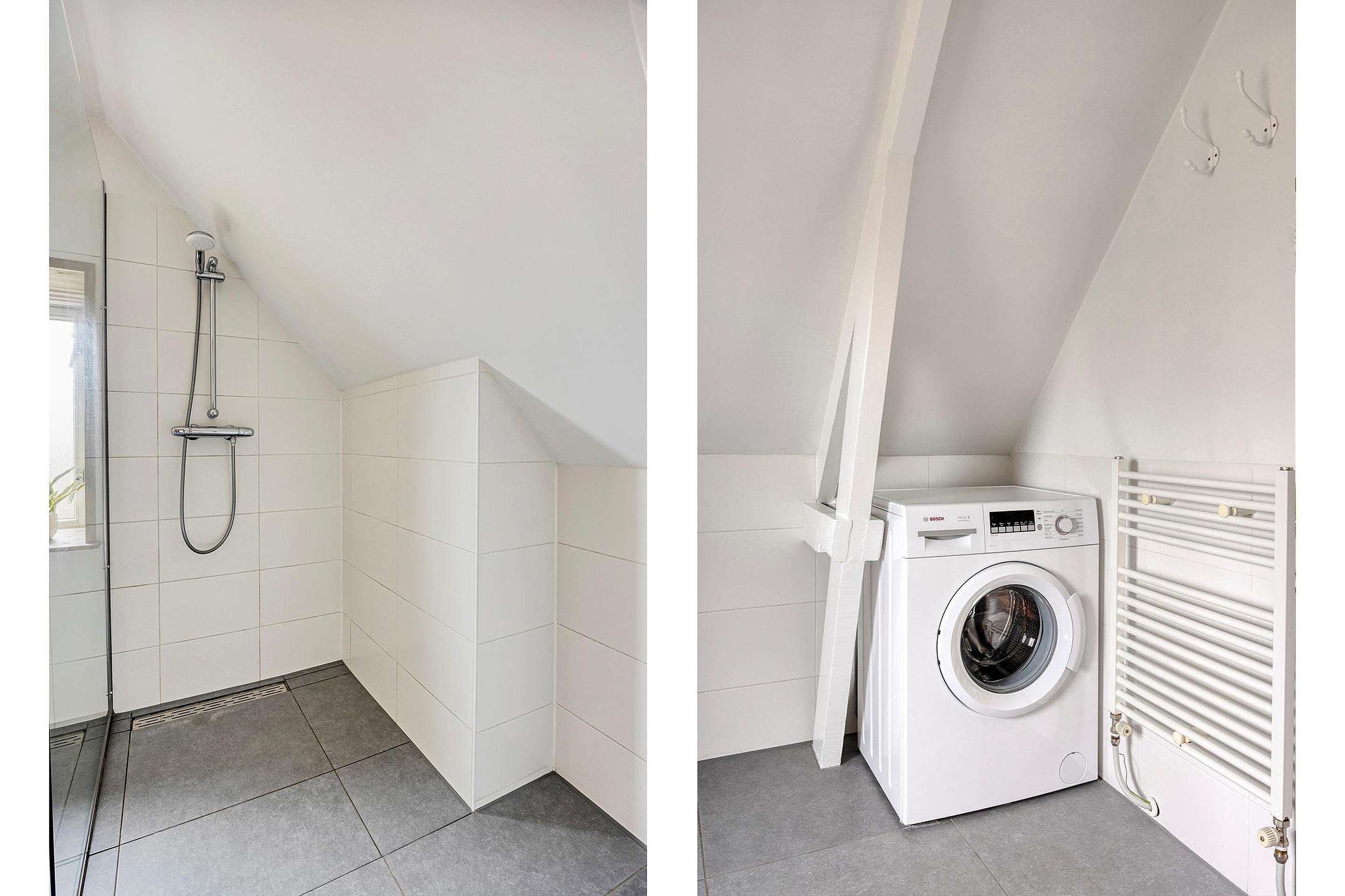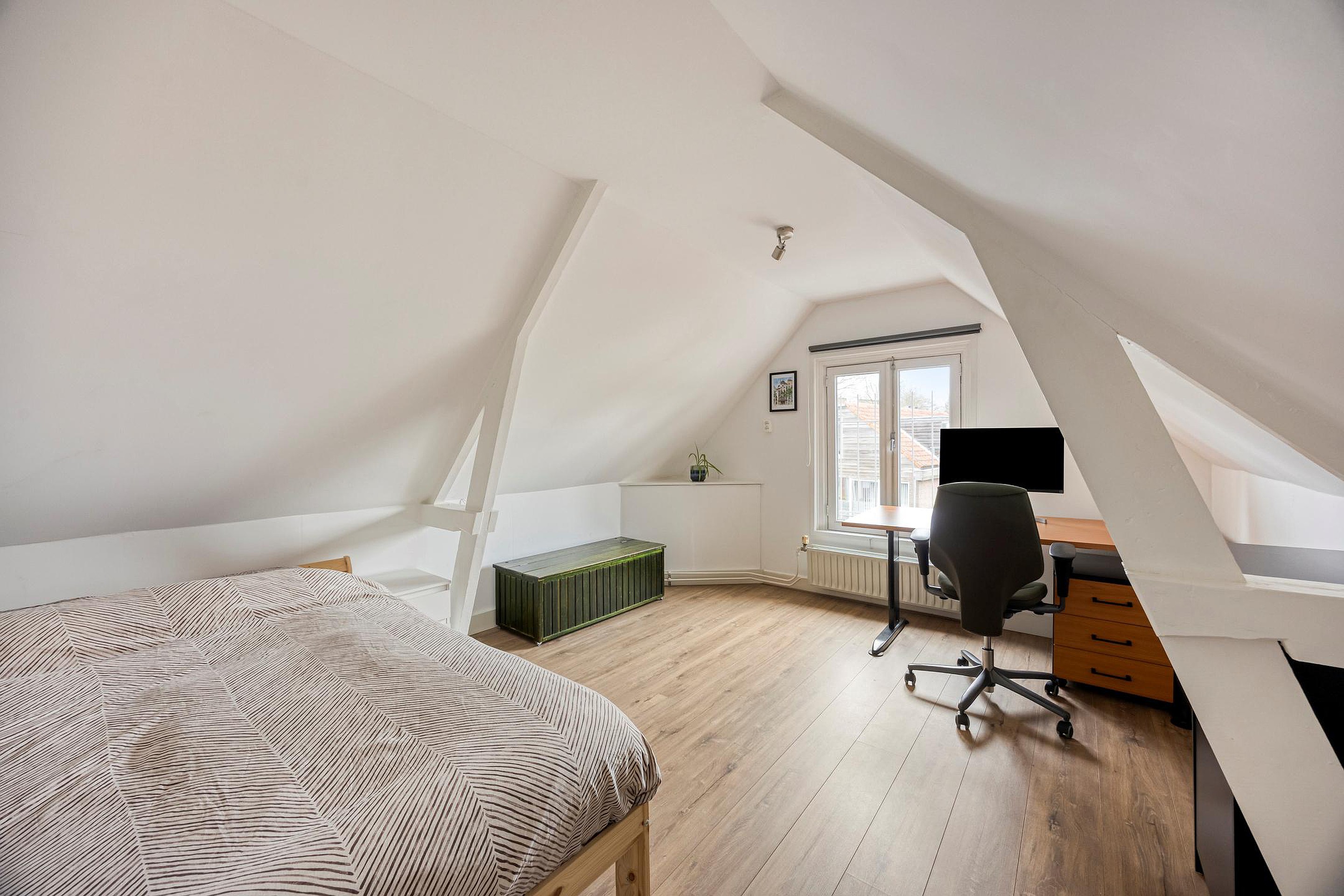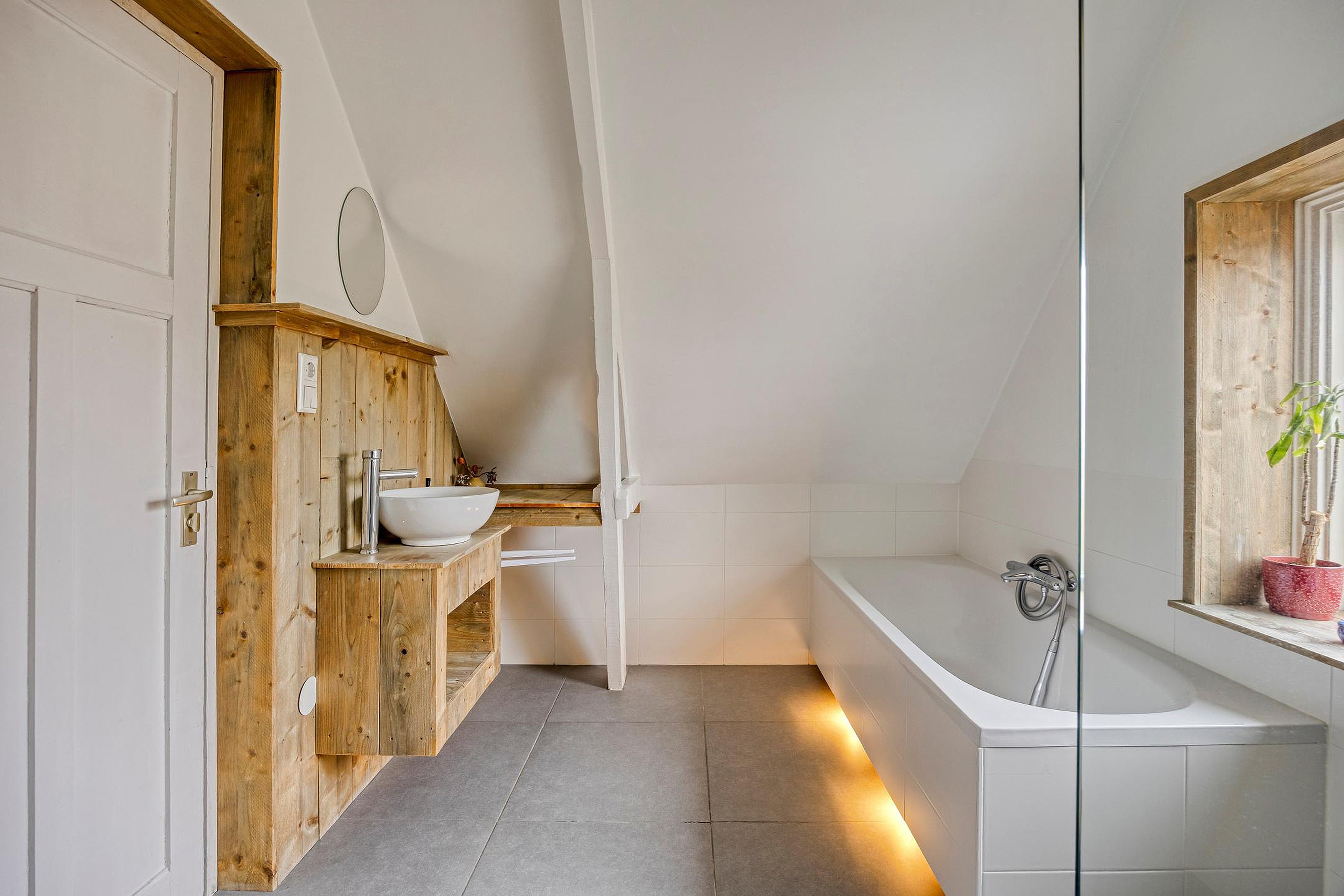 De tweede verdieping biedt een royale derde slaapkamer met een sfeervolle kapconstructie en houten balken. Daarnaast bevindt zich aan de achterzijde de rustgevende badkamer met houten accenten, compleet uitgevoerd met een ligbad, inloopdouche, wastafel met steigerhouten wastafelmeubel en wasmachineaansluiting. Op de overloop is er ruimte voor bijvoorbeeld een droger en een extra vriezer of koelkast. Vanuit de hal is tevens een L-vormige bergruimte te bereiken, waar de cv-installatie (Intergas HR eco 2015) is te vinden.