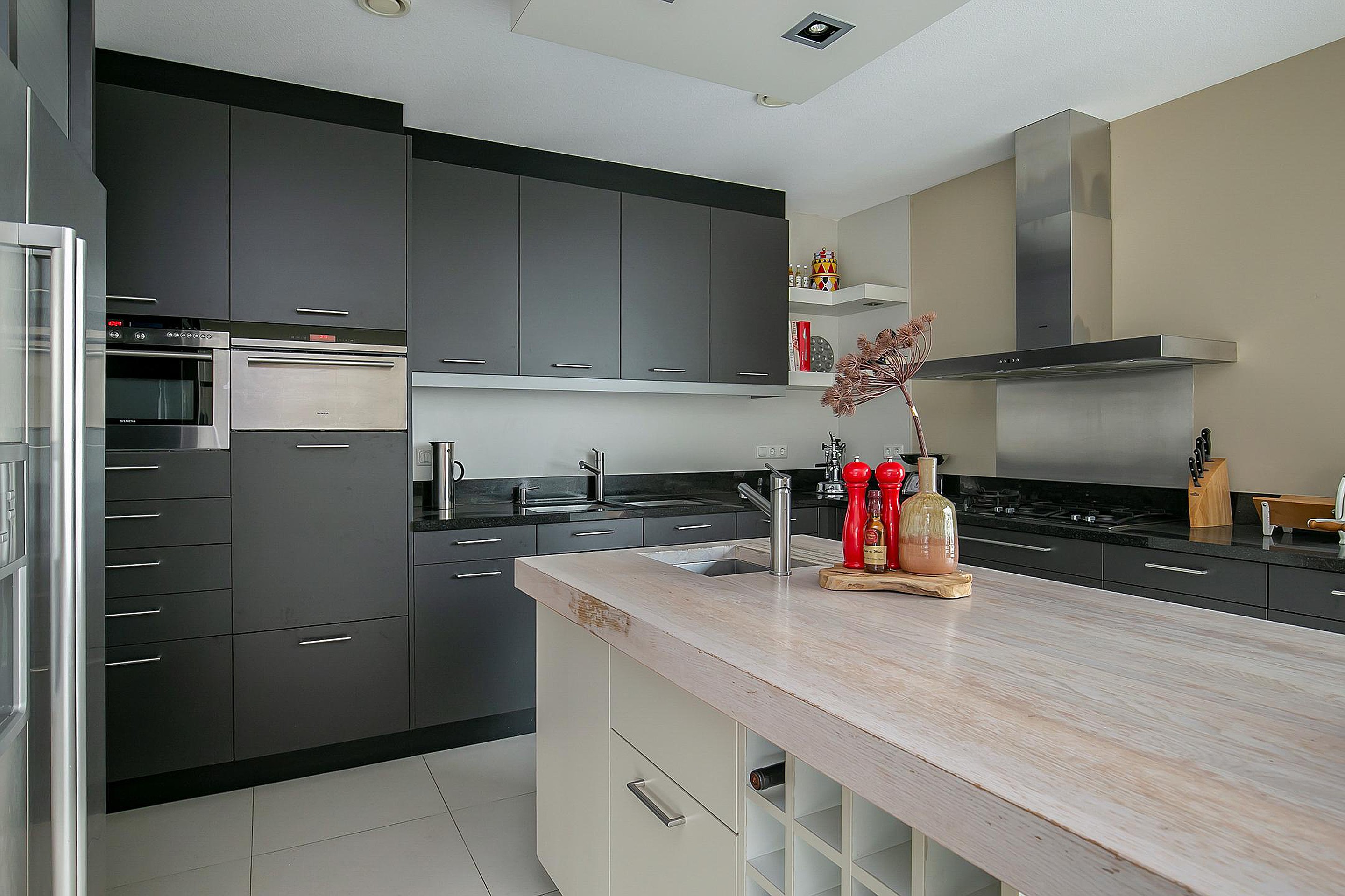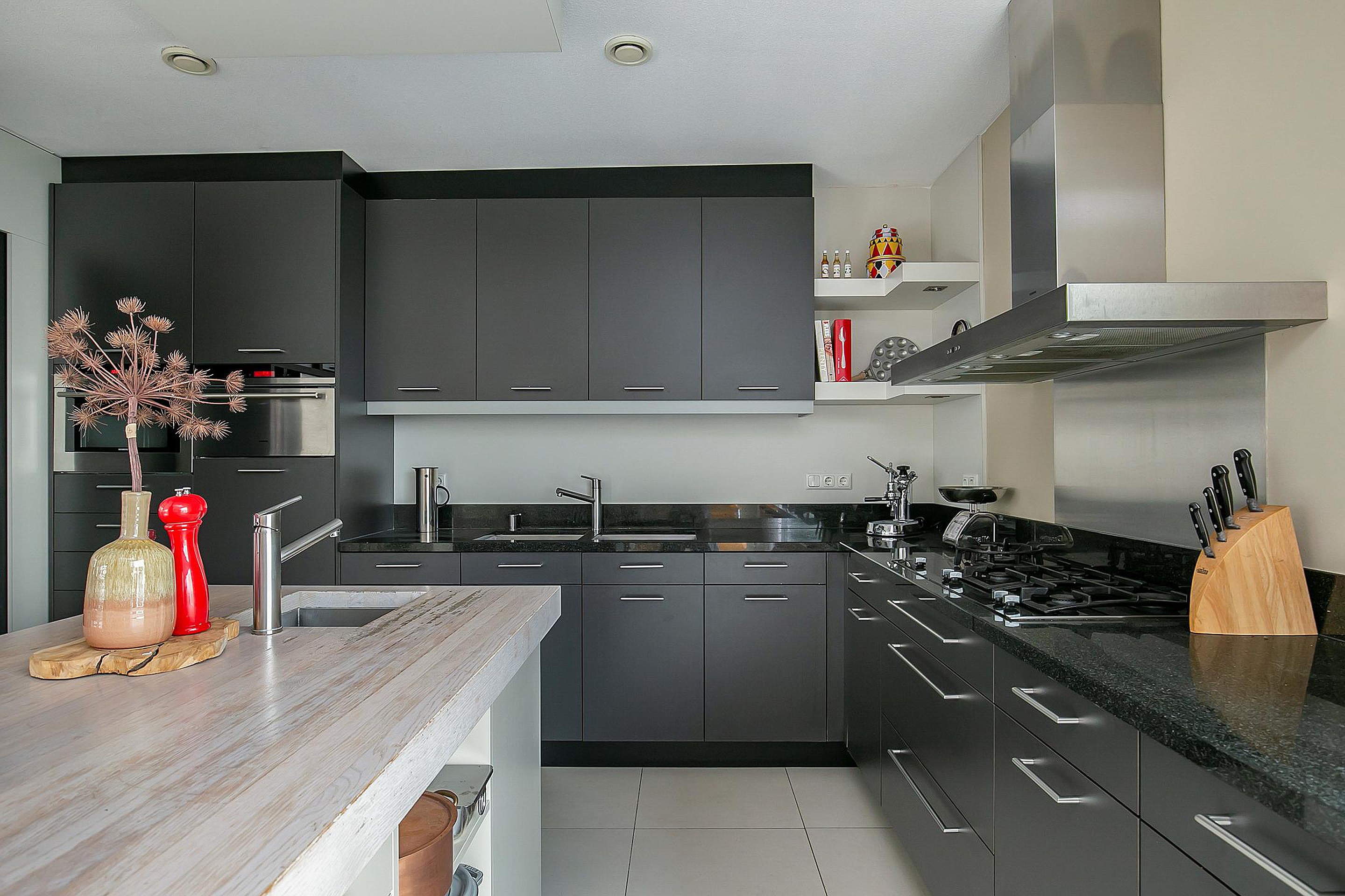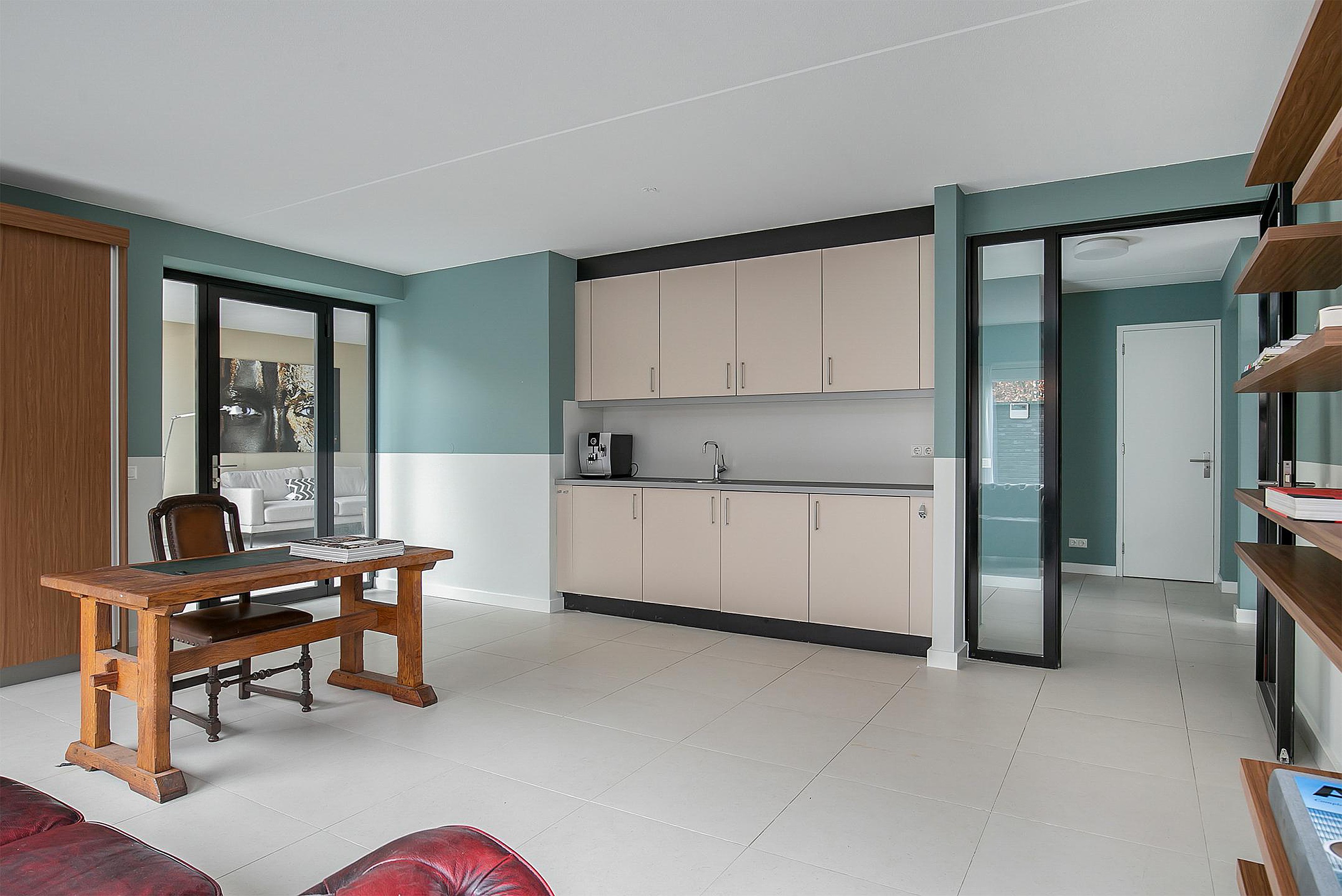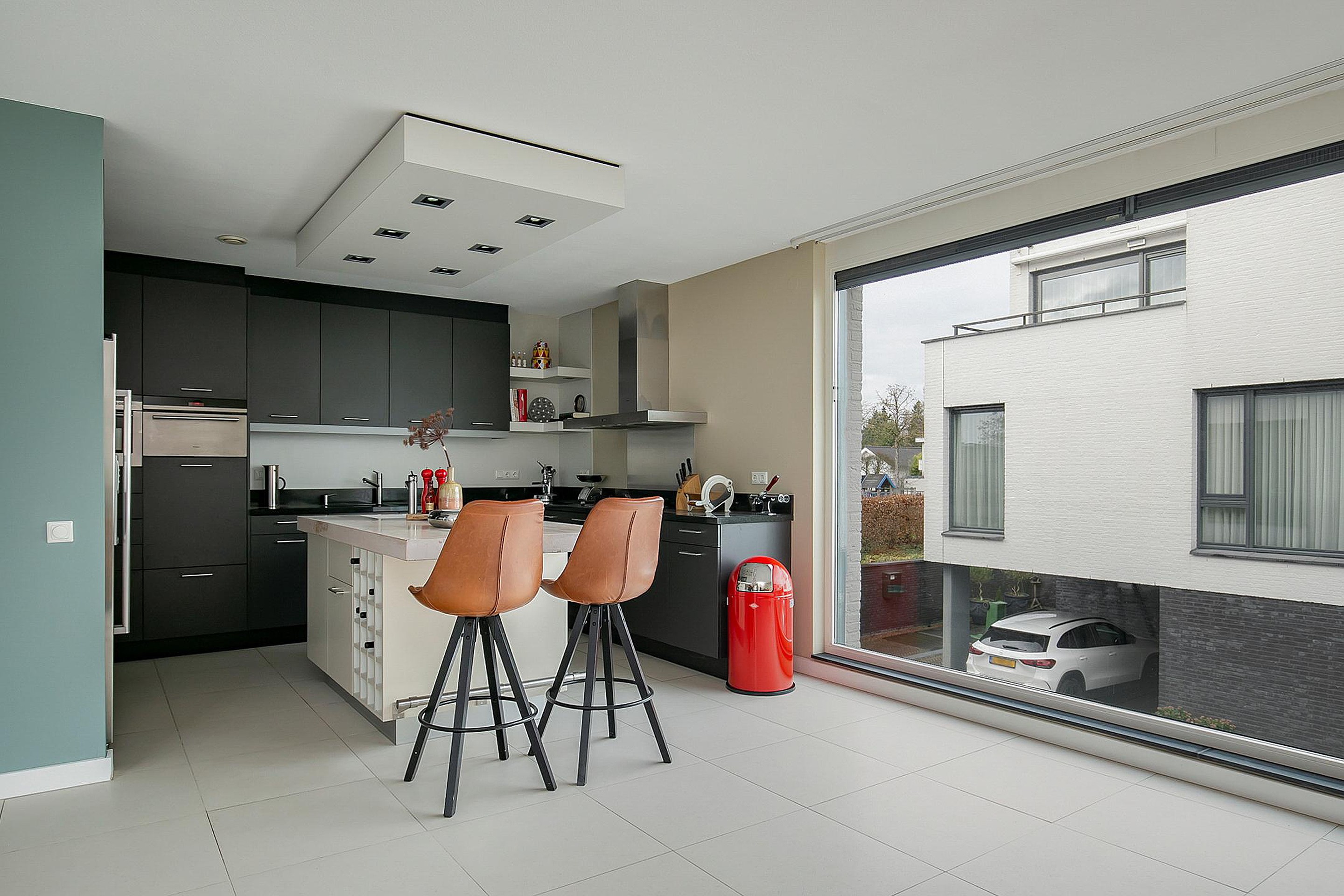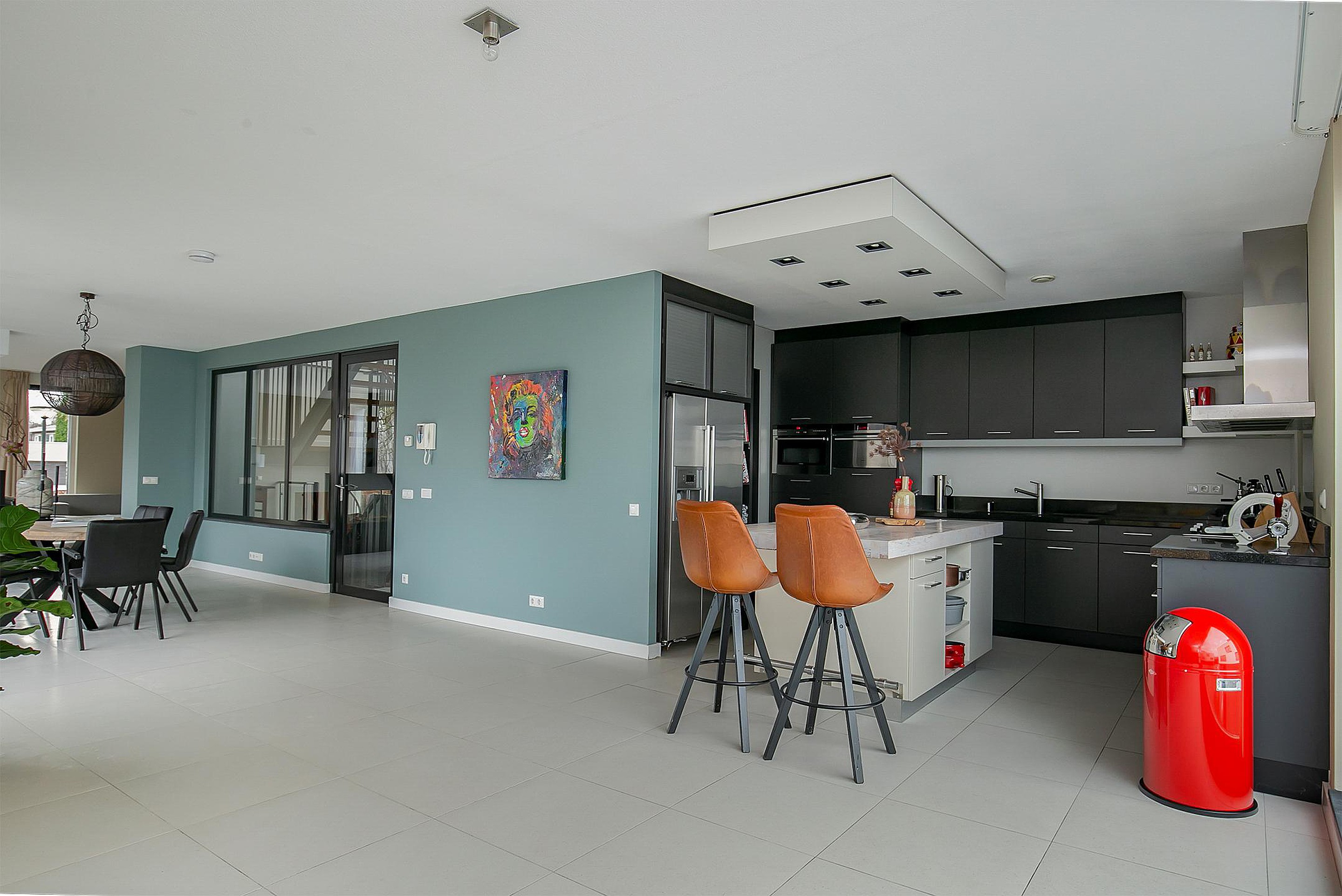 Eerste verdieping Op de eerste verdieping vindt u een toilet, berging, eetkamer en aansluitend de woonkamer en keuken. De ruime eetkamer heeft een sfeervolle doorkijkgashaard en een brede schuifpui naar een royaal dakterras van ca. 21 m2. De luxe maatwerkkeuken is uitgevoerd in hoekopstelling met spoeleiland en provisiekast en voorzien van hoogwaardige inbouwapparatuur, waaronder een combi-oven, stoomoven, 5-pits gaskookplaat, vaatwasser, Amerikaanse koelkast en afzuigkap. De lichte woonkamer beschikt over hoge raampartijen, een vide en een spiltrap die in verbinding staat met de tuinkamer.