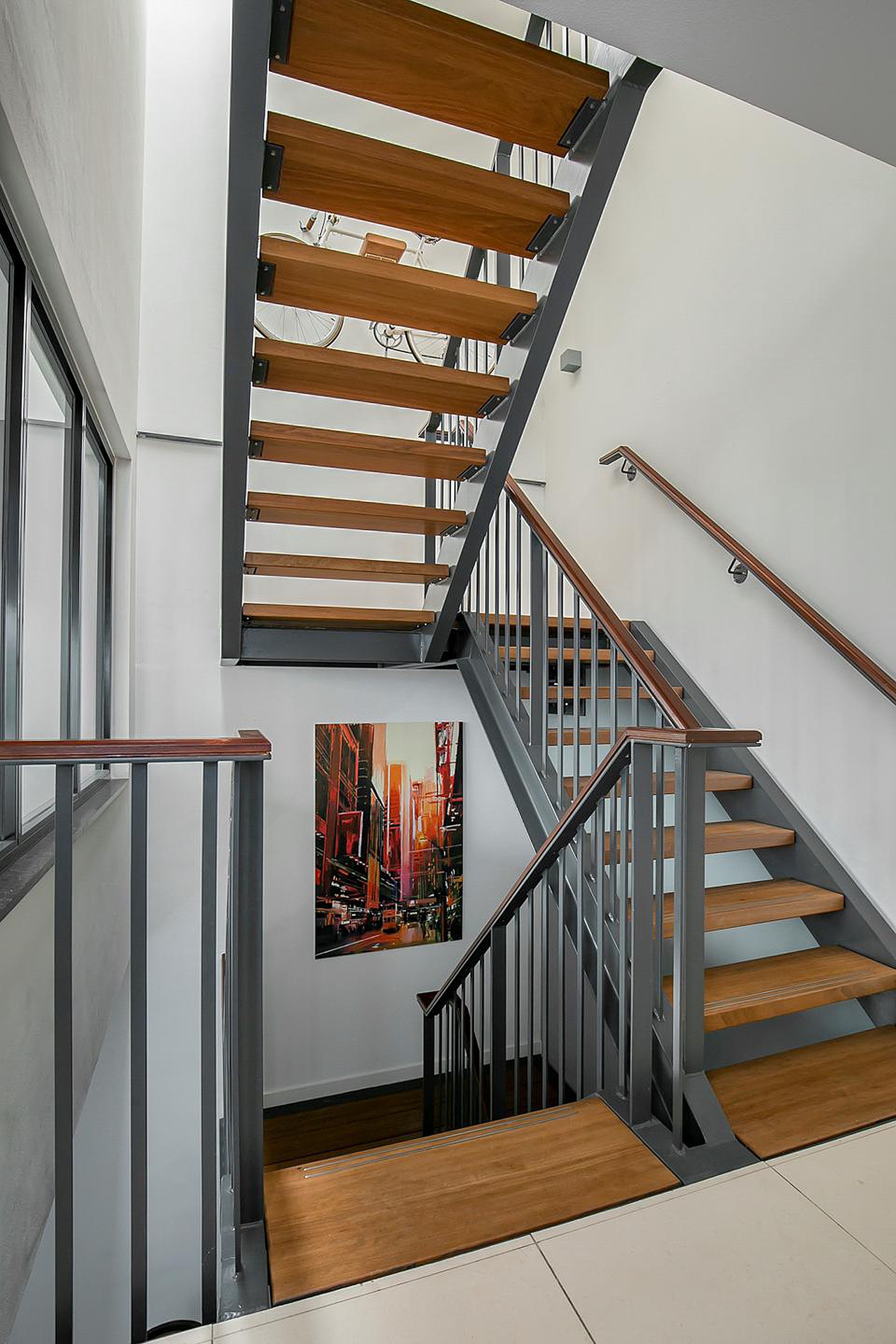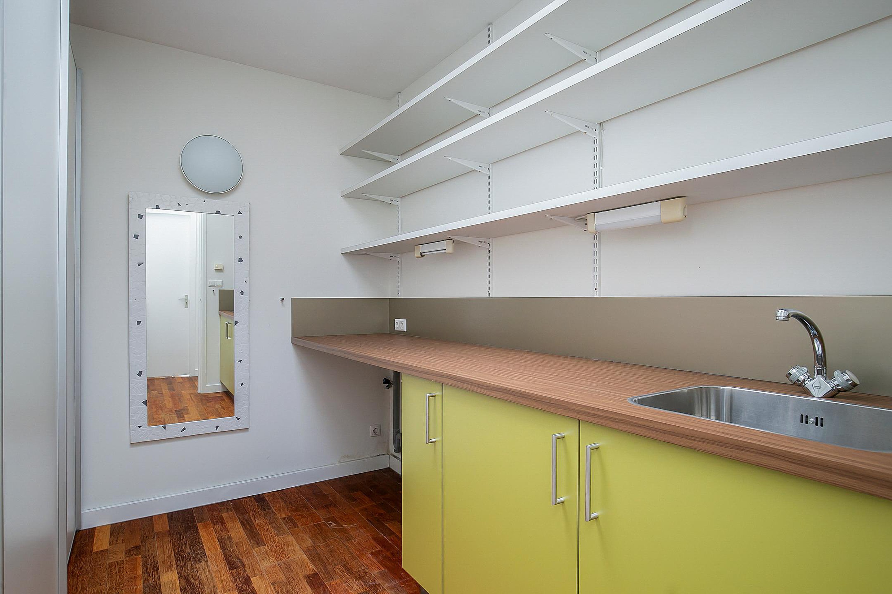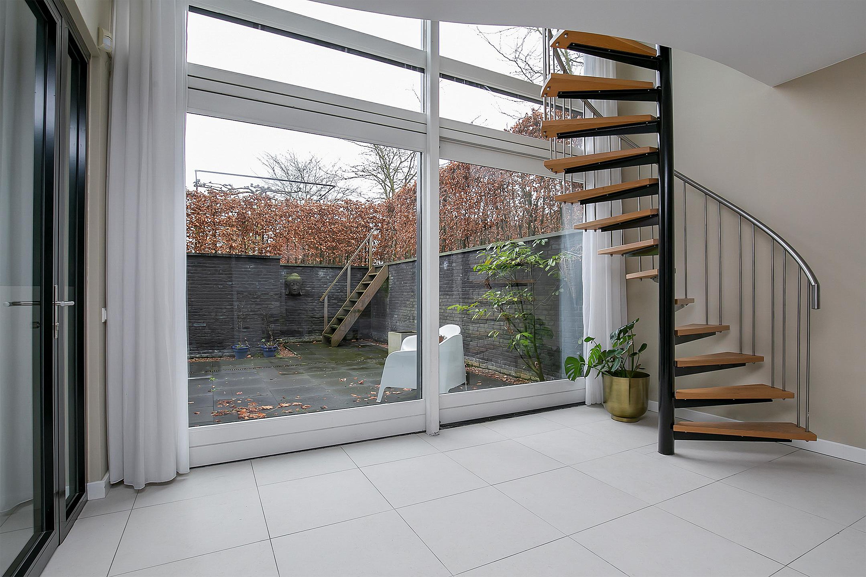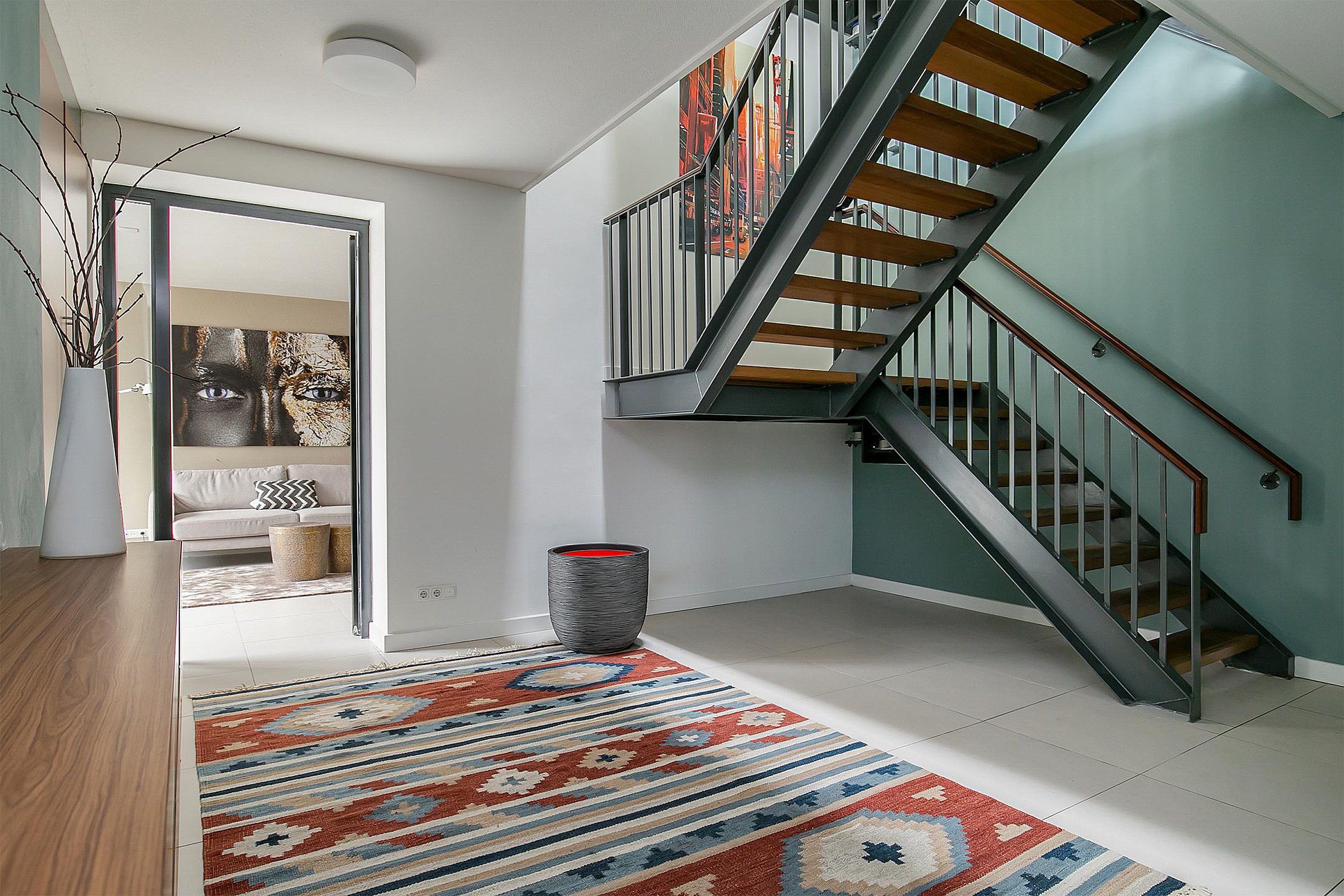 Begane grond Via de overdekte entree bereikt u de ruime hal met inbouwkasten en toegang tot het toilet, de bijkeuken/berging, studeer-/werkkamer en tuinkamer. De moderne bordestrap vormt een echte eyecatcher en verbindt alle verdiepingen. De berging/bijkeuken is uitgerust met witgoedaansluitingen en heeft een directe toegang tot de straatzijde. De werkkamer beschikt over een pantry en schuifpui naar de patiotuin. Aansluitend vindt u de tuinkamer, eveneens met schuifpui naar de patio. Via een moderne spiltrap is de eerste verdieping bereikbaar.