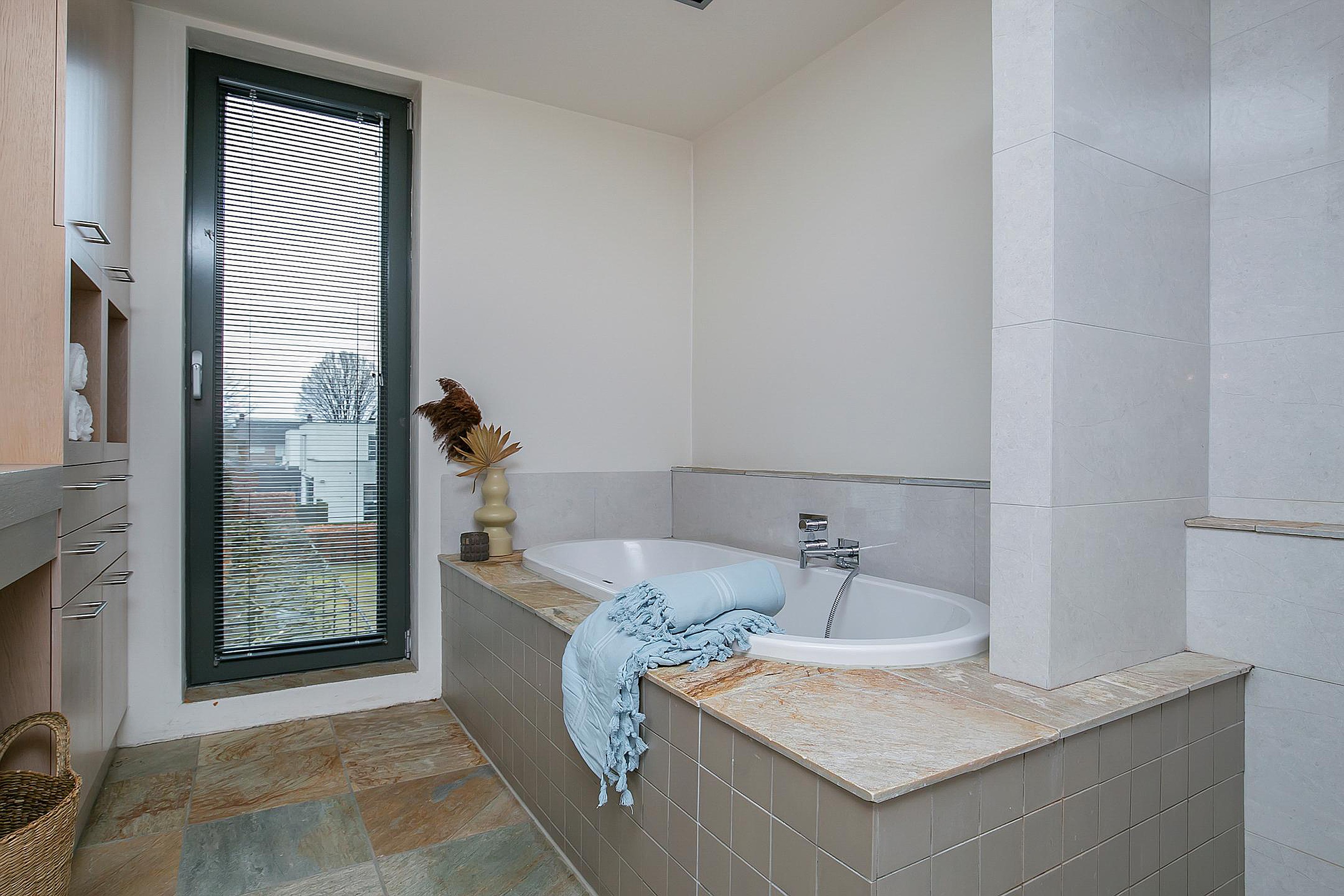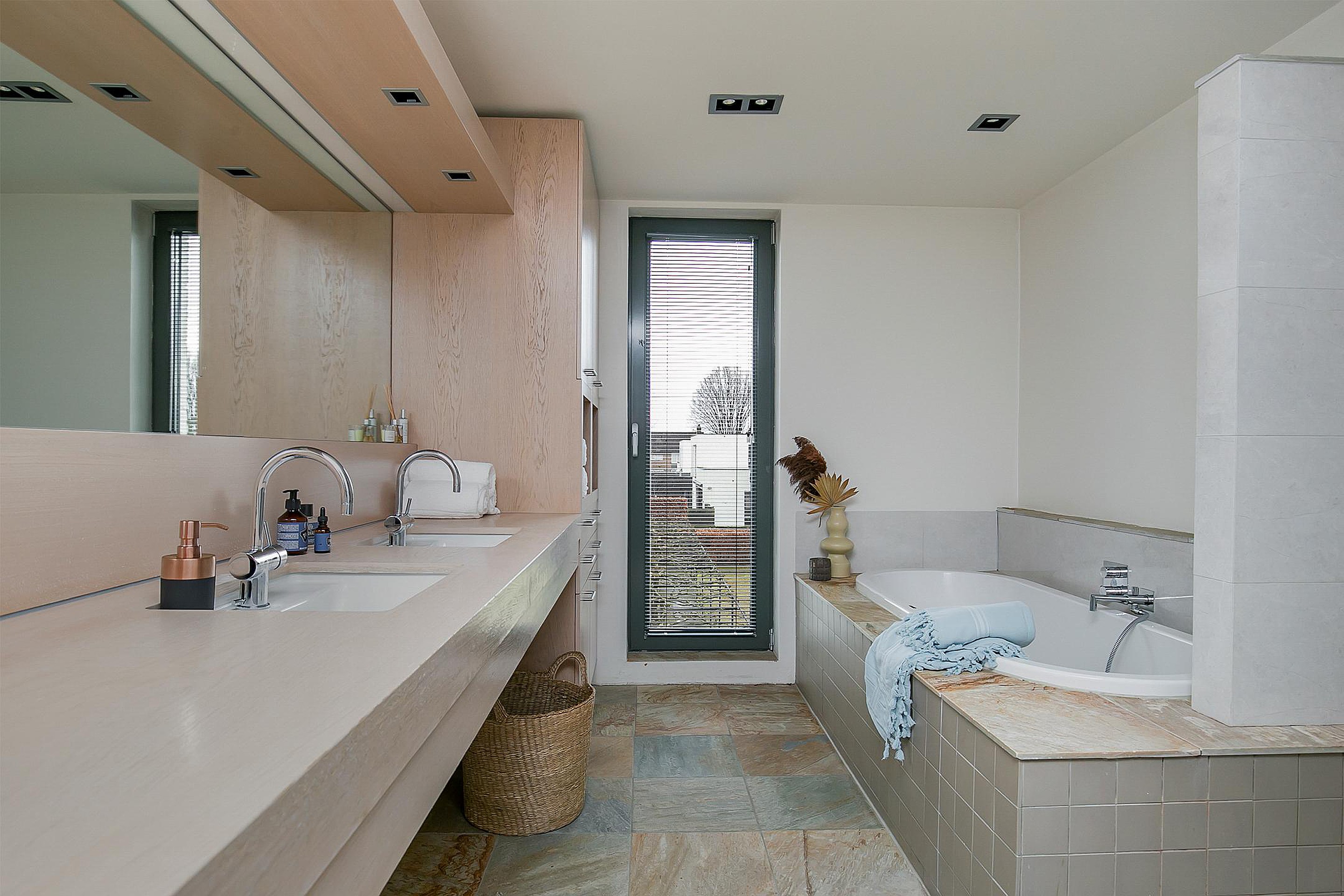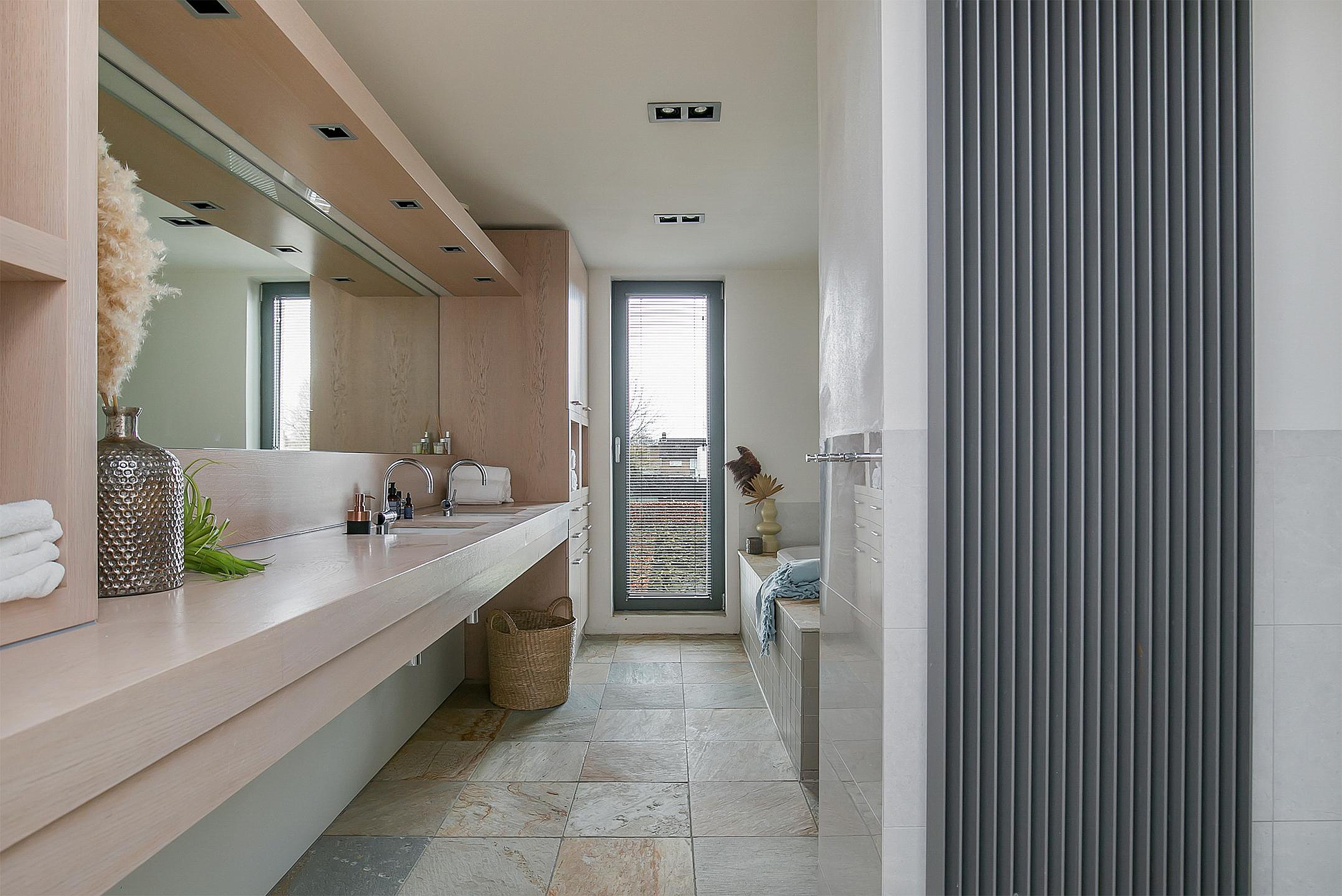 Tweede verdieping De royale overloop geeft toegang tot drie slaapkamers, een luxe badkamer, wasruimte en een tweede dakterras. Twee slaapkamers hebben direct toegang tot dit terras. De moderne badkamer is uitgerust met een inloopdouche met regendouche, ligbad, op maat gemaakt dubbel wastafelmeubel, designradiator en wandcloset. De praktische wasruimte beschikt over een lichtkoepel, vaste kast, pantry en witgoedaansluitingen.
