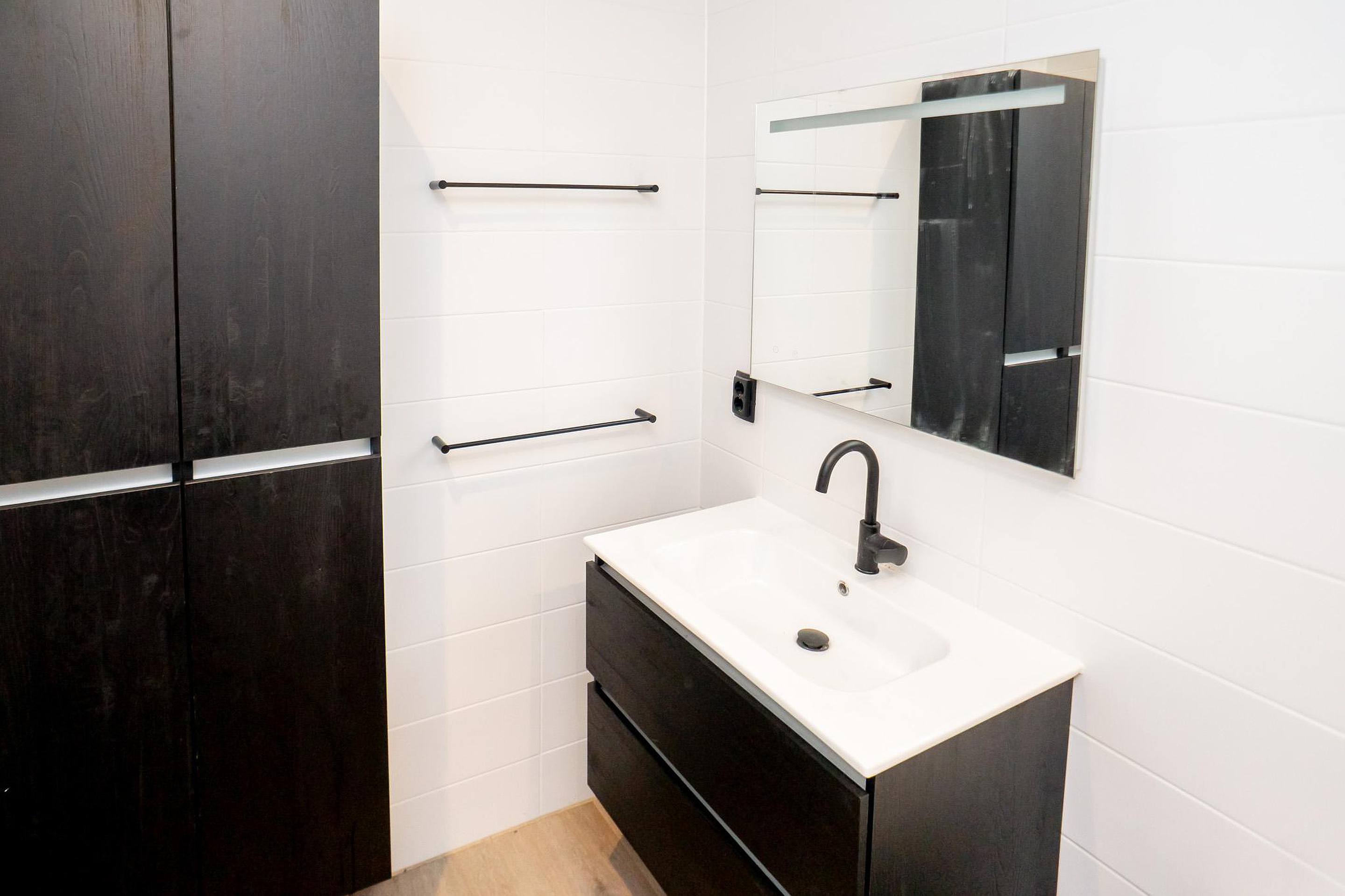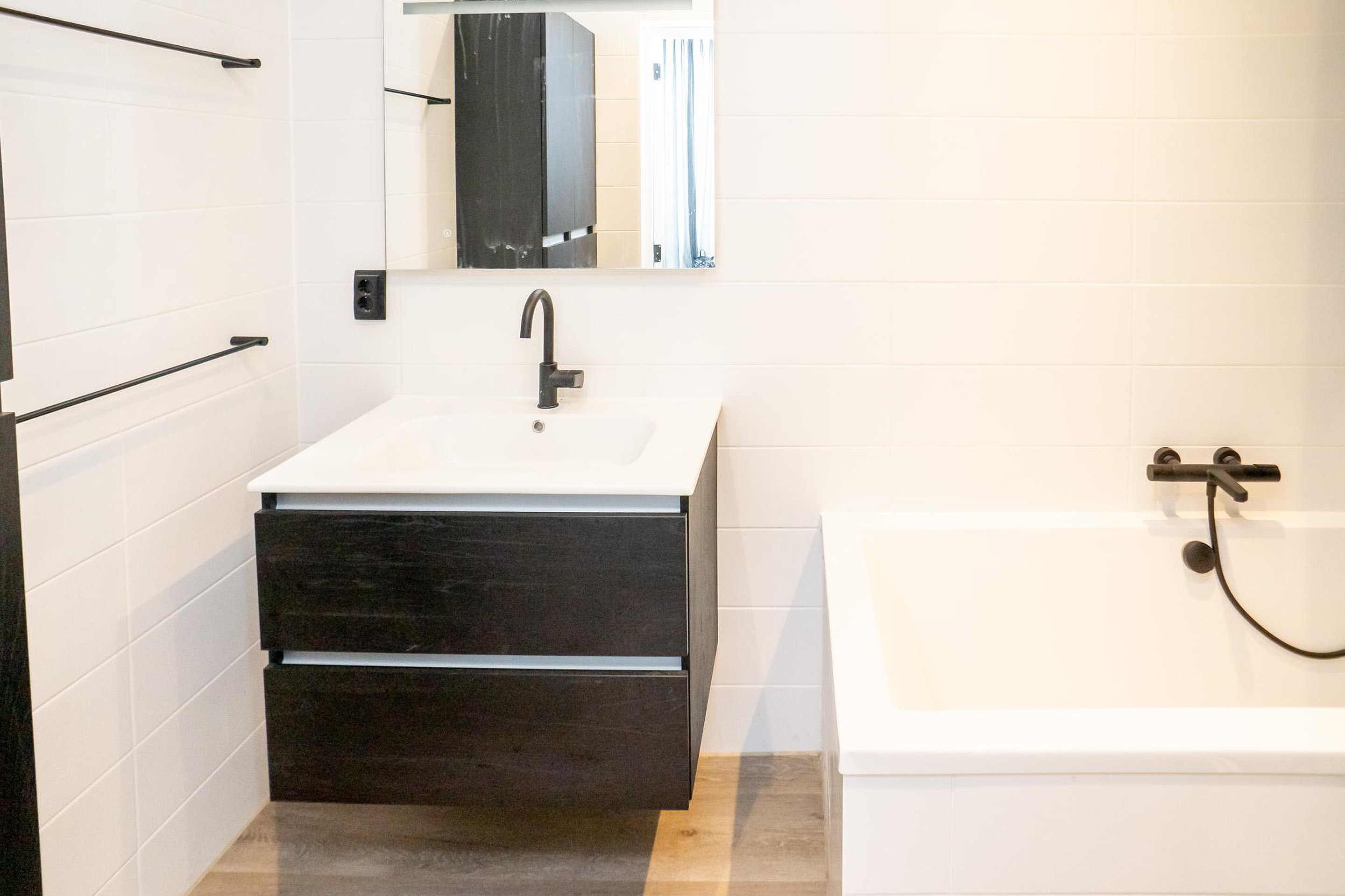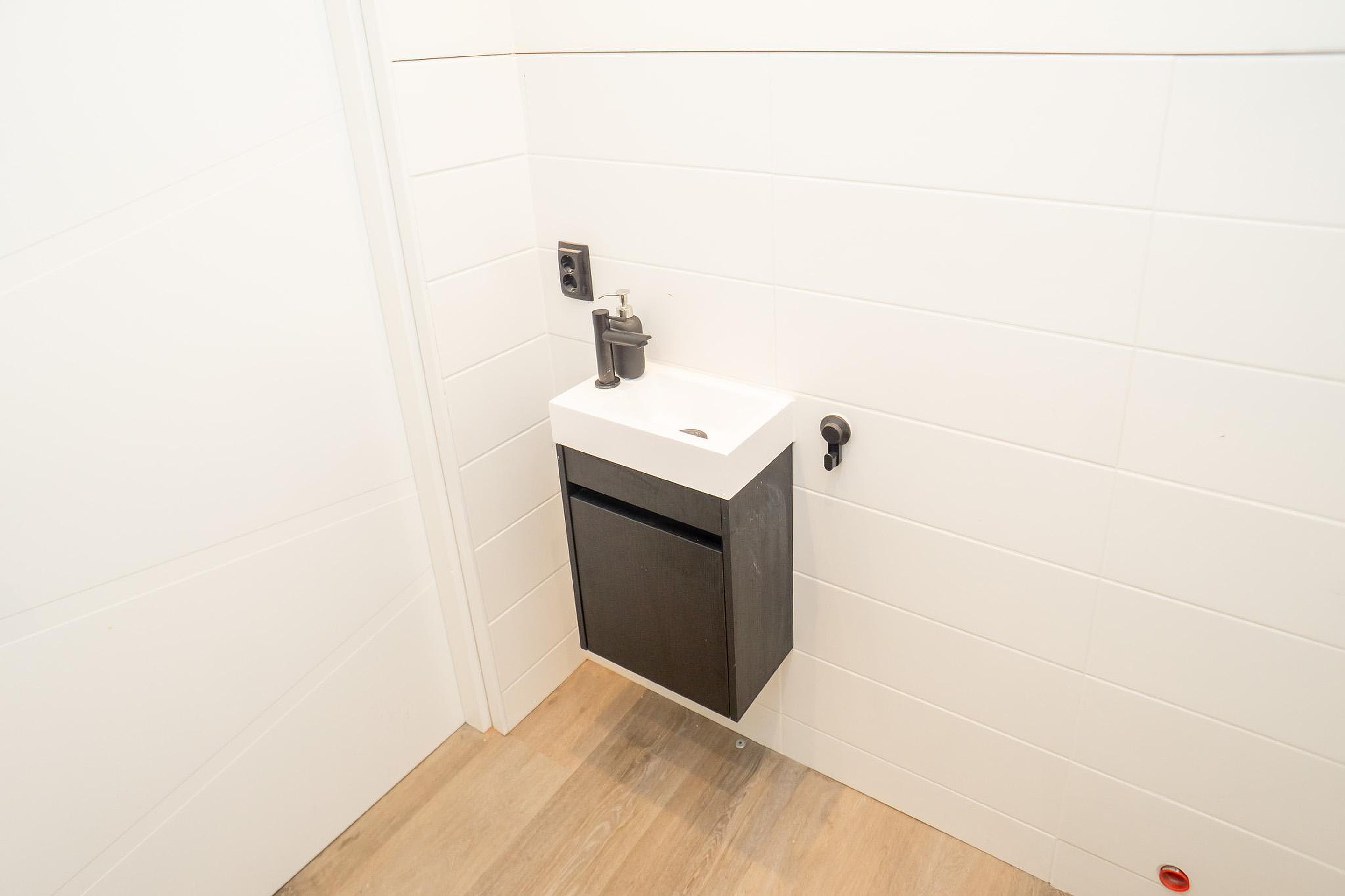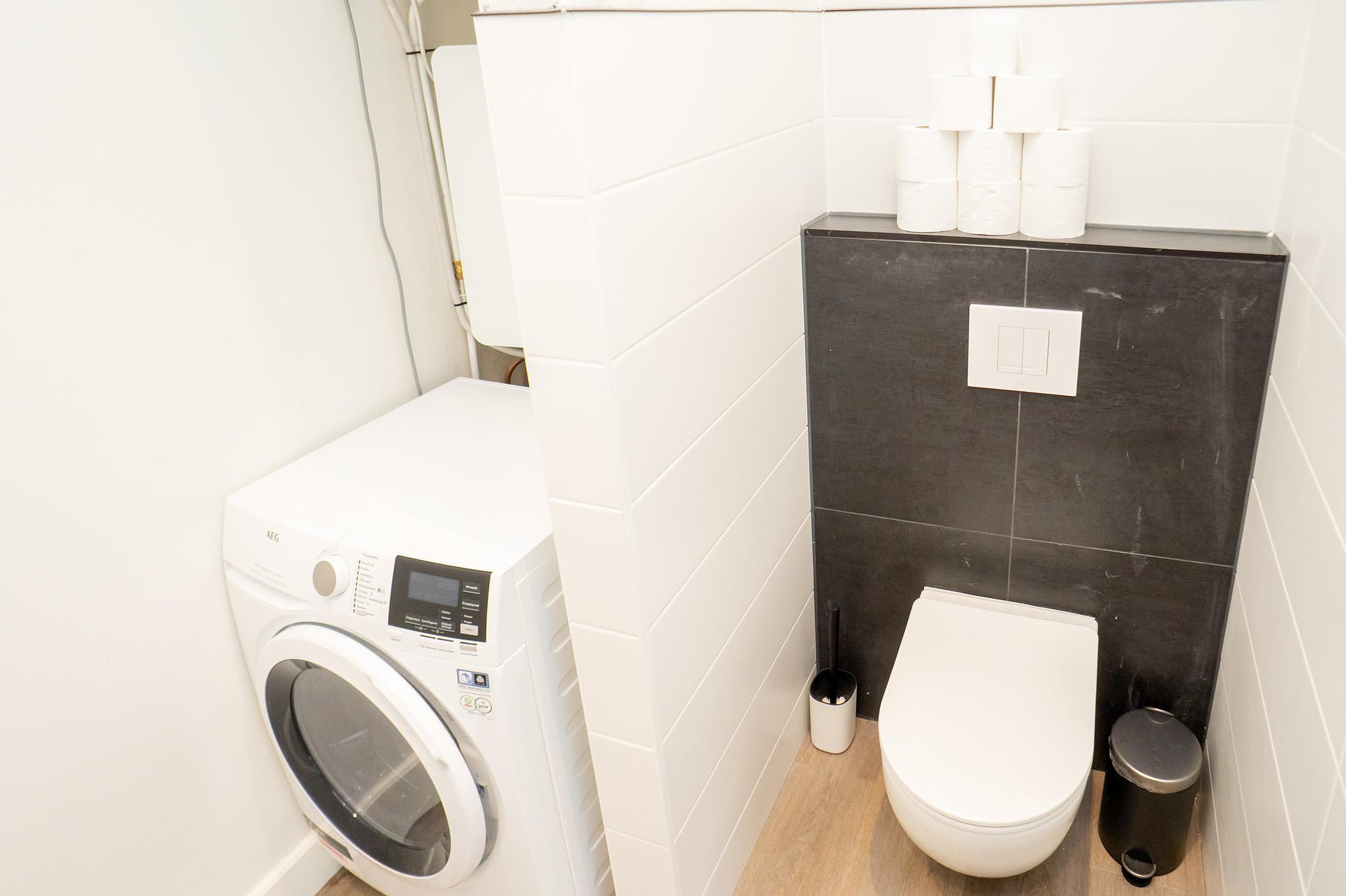 De woonkamer geeft toegang tot het toilet, waar tevens een afscheiding is gemaakt voor het plaatsen van de wasmachine en of droger. Ook bereik je via de woonkamer de Slaapkamer met een praktische vaste kast voor extra opbergruimte. Vanuit de slaapkamer kom je in de Badkamer met ligbad, aparte douche en wastafel – een plek om heerlijk te ontspannen na een lange dag.
