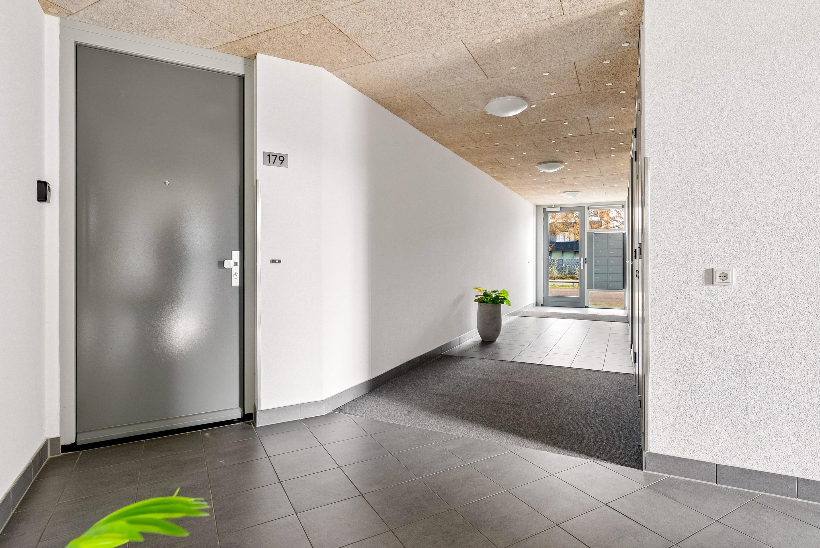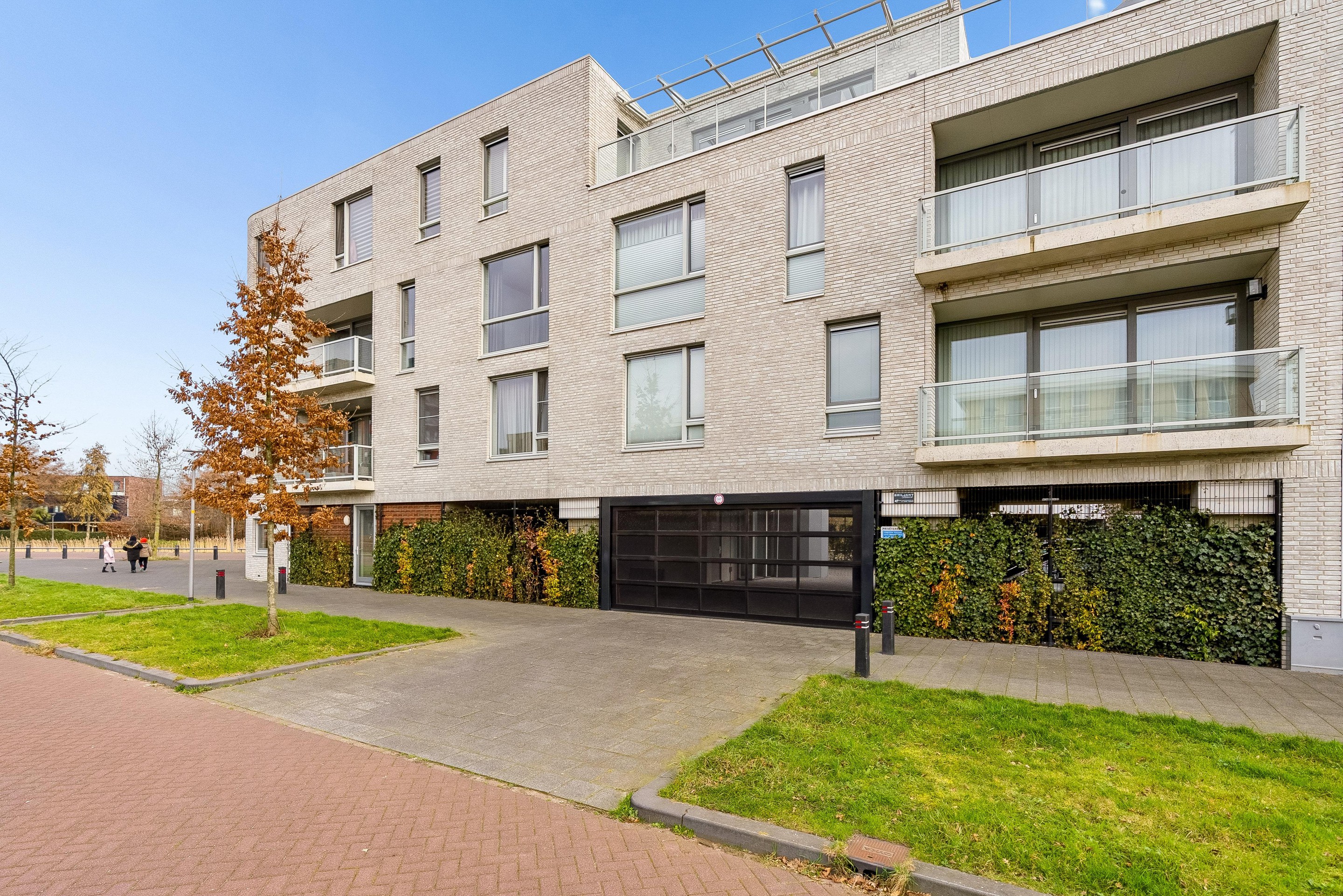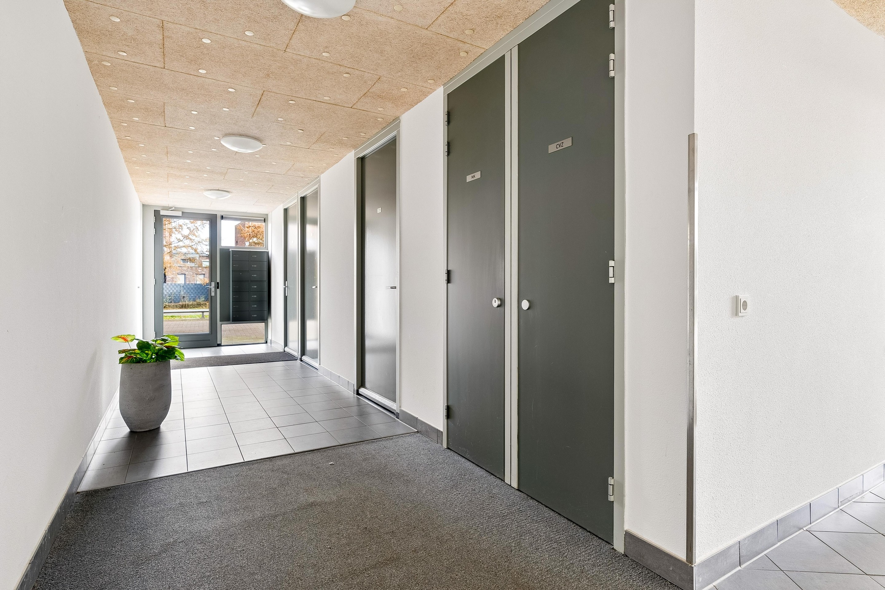Op de begane grond bevindt zich de hoofdentree met brievenbussen en bellentableau (met camera). De hoofdentree geeft toegang tot de lift en de trapopgang naar de diverse verdiepingen. Aan de achterkant kan je ook de centrale hal verlaten, hier bereik je de privé parkeerplaatsen behorend bij de appartementen en de bergingen. Dit terrein is volledig afgesloten met een roldeur, dit geeft een erg veilig gevoel.