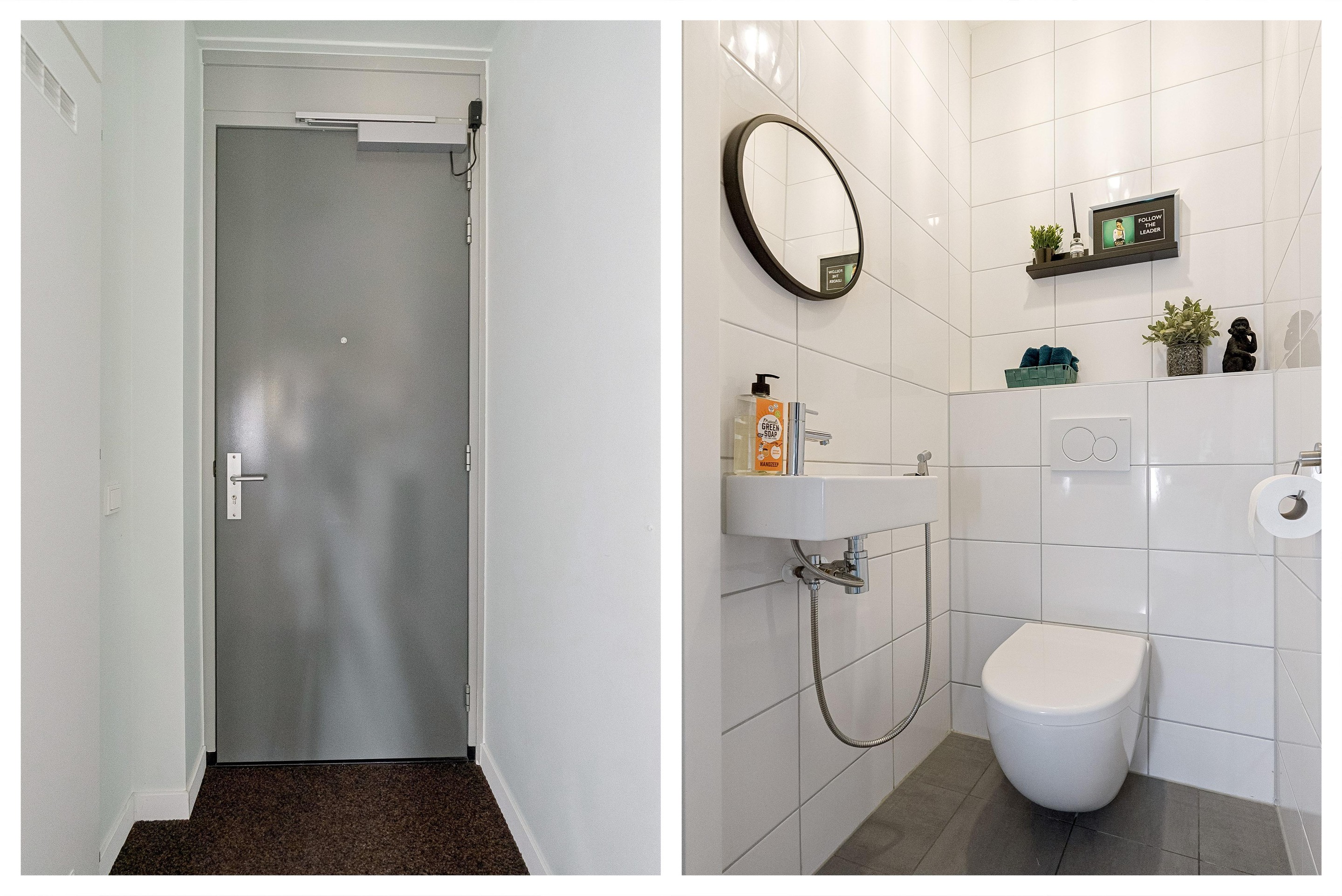De badkamer is voorzien van een inloopdouche, wastafel met groot wastafelmeubel en een designradiator. Er is gekozen voor een prachtig stoer maar neutrale afwerking. De badkamer is voorzien van vloerverwarming. Het toilet is separaat gelegen en bereikbaar vanuit de hal. Ideaal, dan hoeft bezoek niet door de badkamer. Vanuit de hal is ook een fijne bergkast bereikbaar, hier zijn tevens de wasmachine-/drogeraansluitingen gesitueerd.