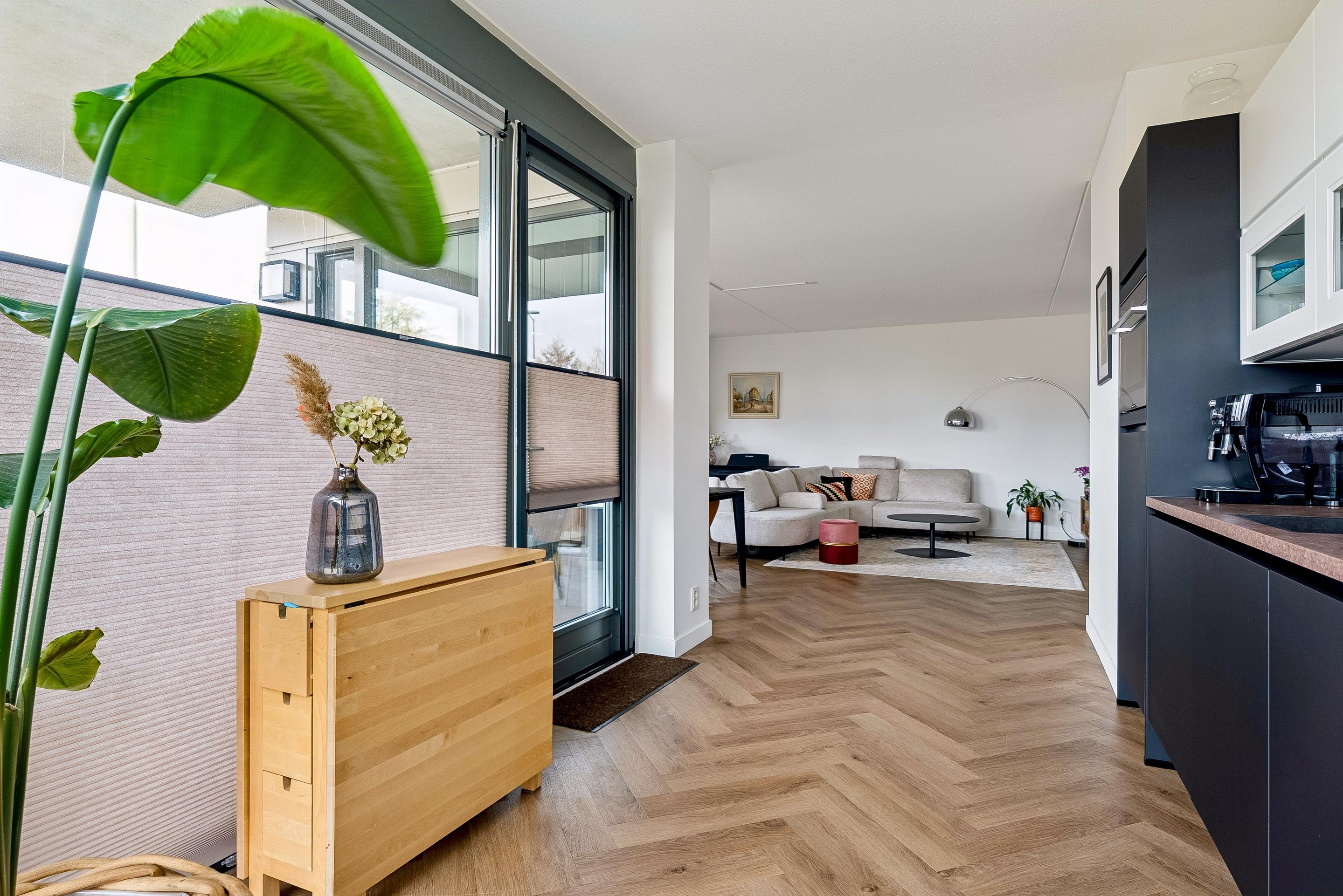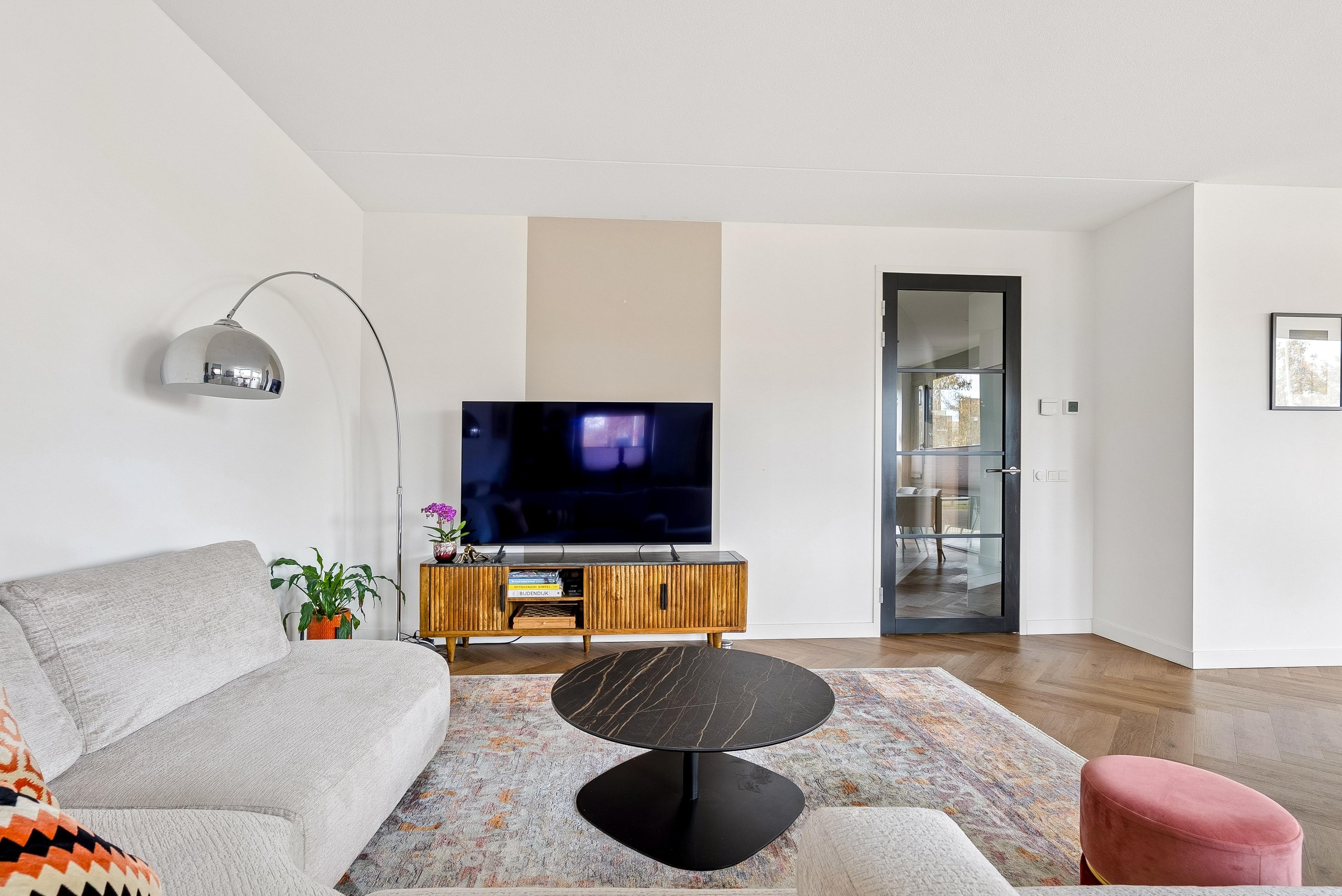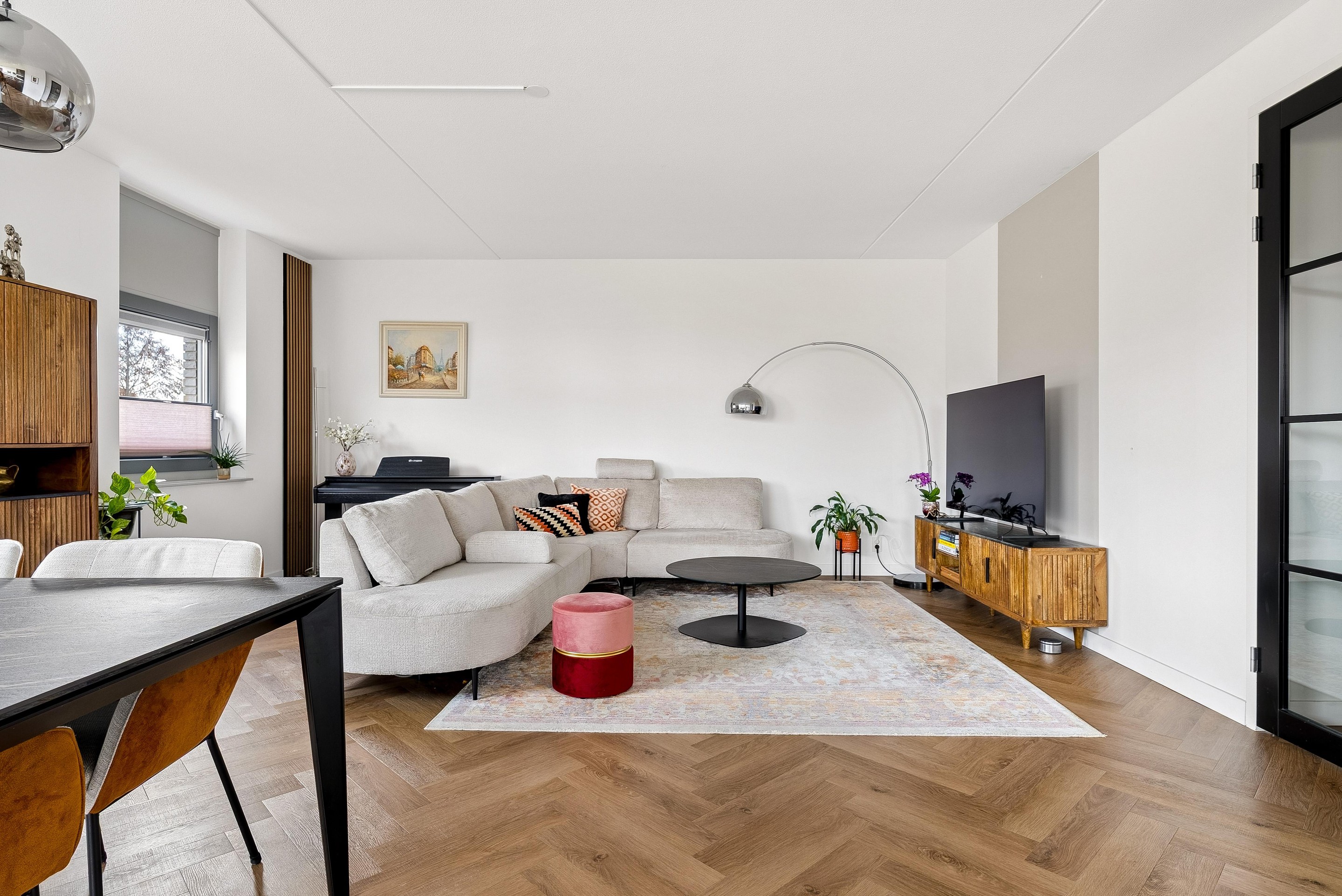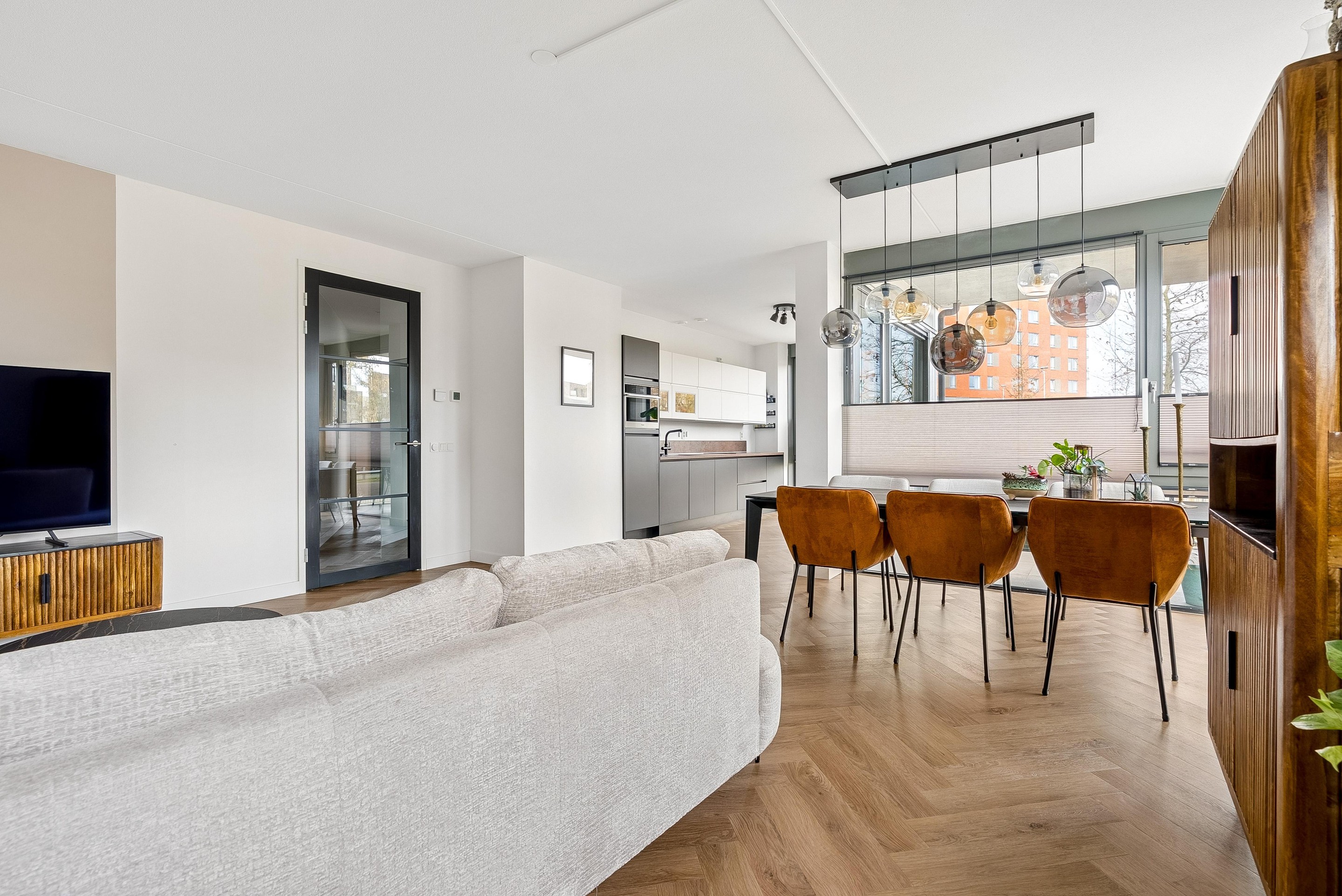De woonkamer biedt voldoende ruimte voor een gezellige zithoek en een eettafel, perfect voor sociaal samenzijn met vrienden en familie. De vele grote raampartijen zorgen dat er veel licht de woning kan binnentreden en dat je een leuk uitzicht hebt naar buiten.