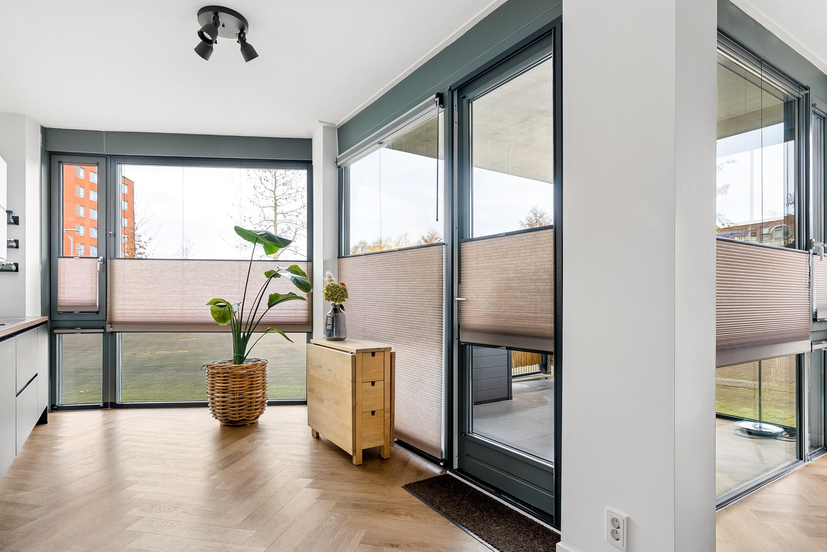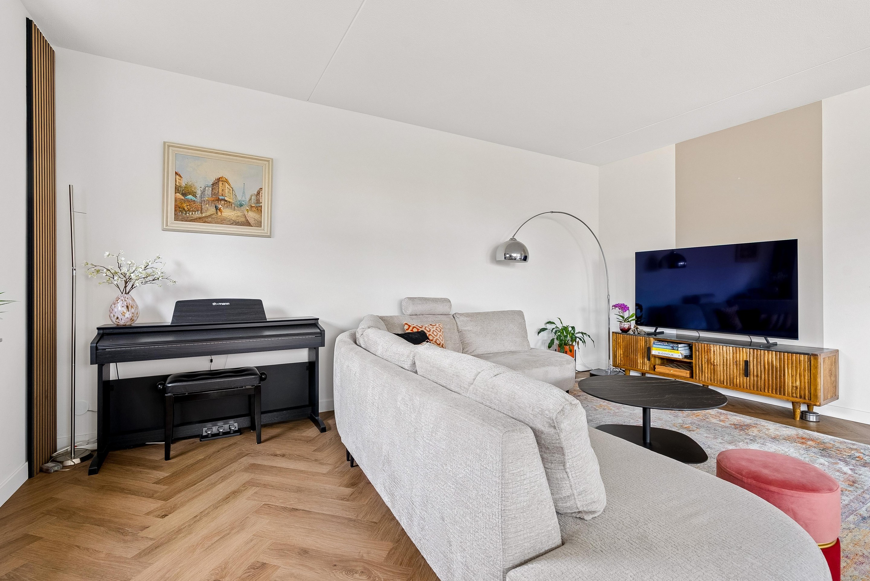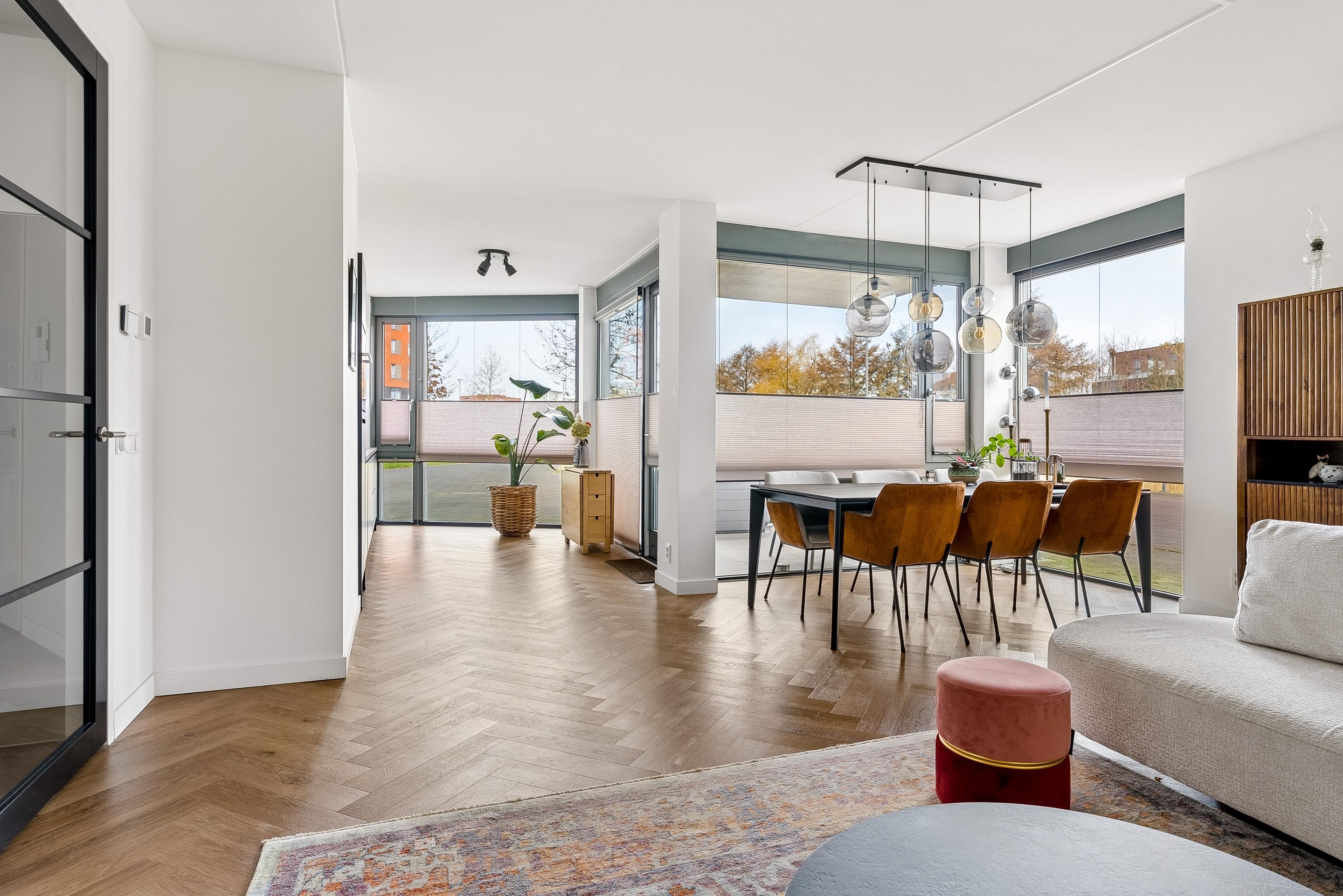 De woonkamer biedt voldoende ruimte voor een gezellige zithoek en een eettafel, perfect voor sociaal samenzijn met vrienden en familie. De vele grote raampartijen zorgen dat er veel licht de woning kan binnentreden en dat je een leuk uitzicht hebt naar buiten.