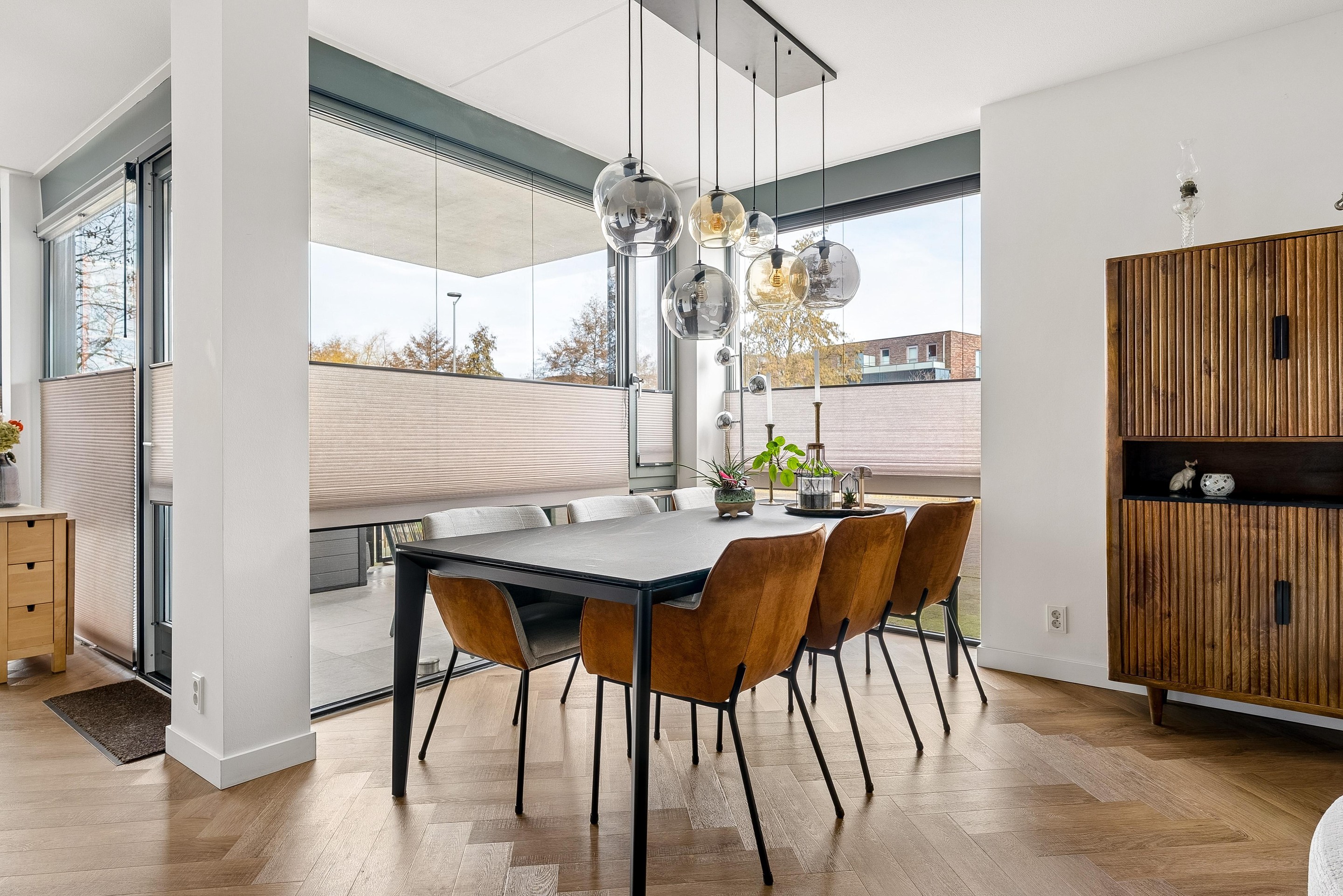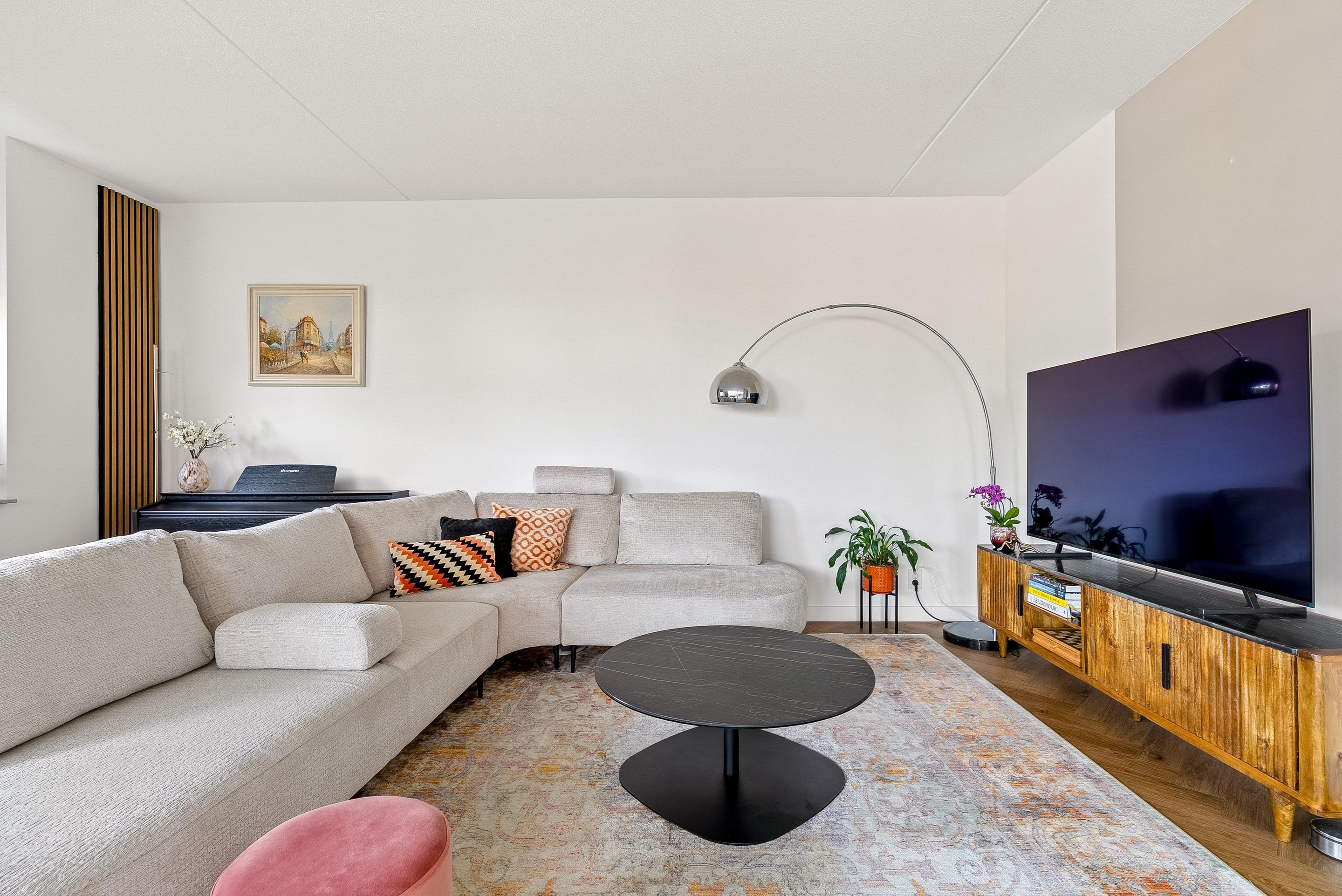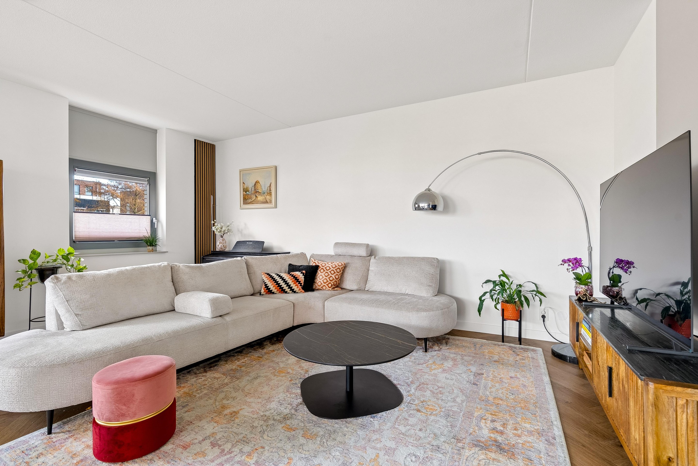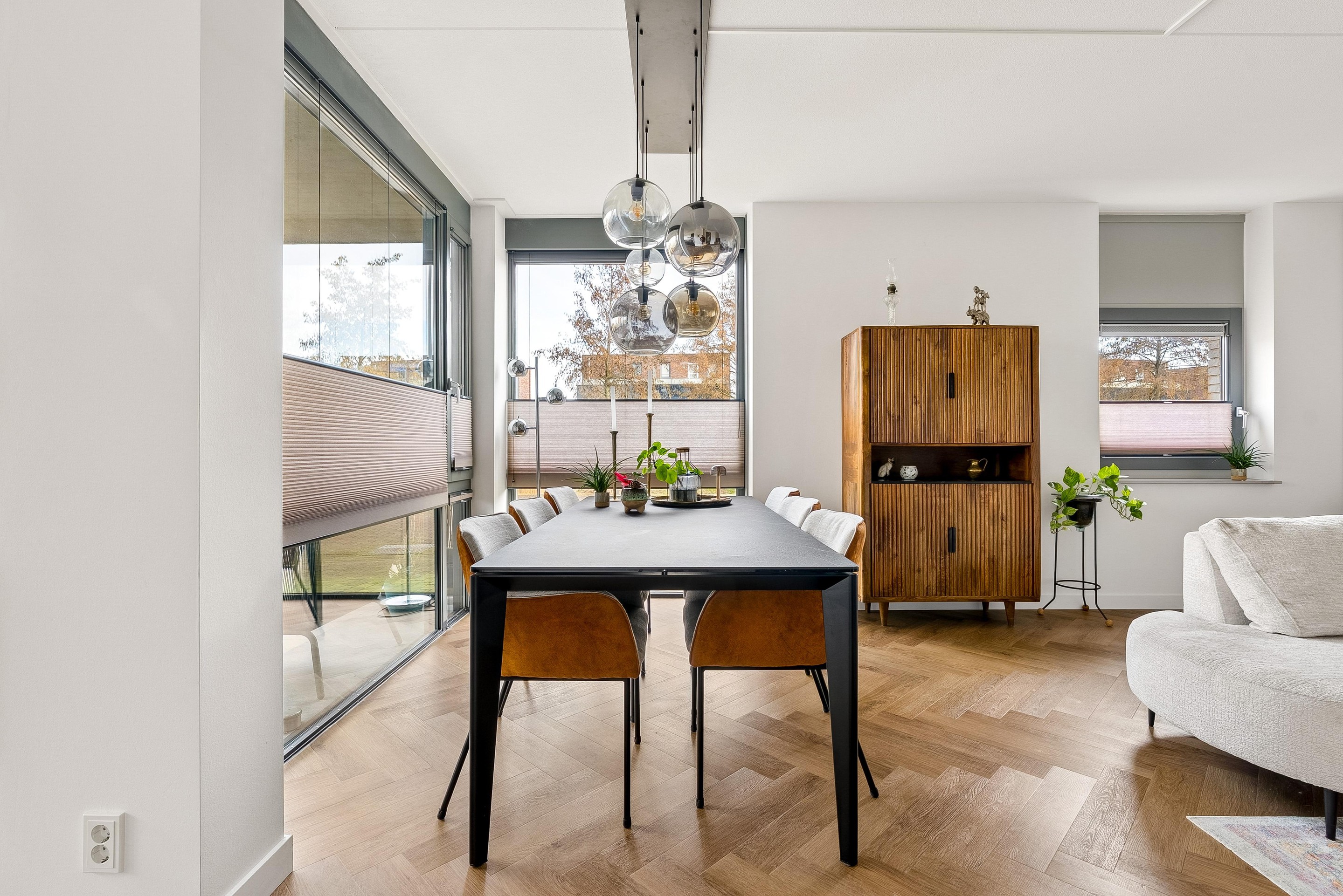 De woonkamer biedt voldoende ruimte voor een gezellige zithoek en een eettafel, perfect voor sociaal samenzijn met vrienden en familie. De vele grote raampartijen zorgen dat er veel licht de woning kan binnentreden en dat je een leuk uitzicht hebt naar buiten.
