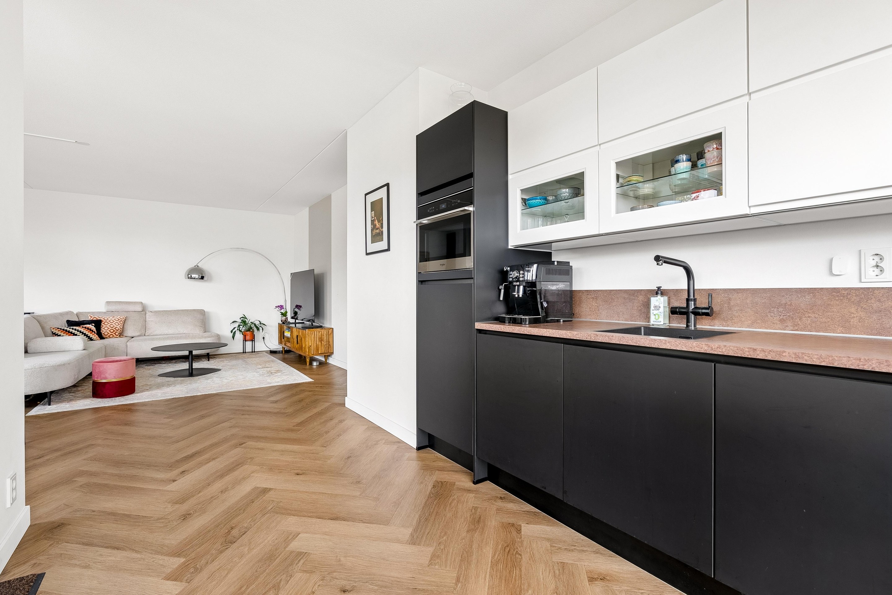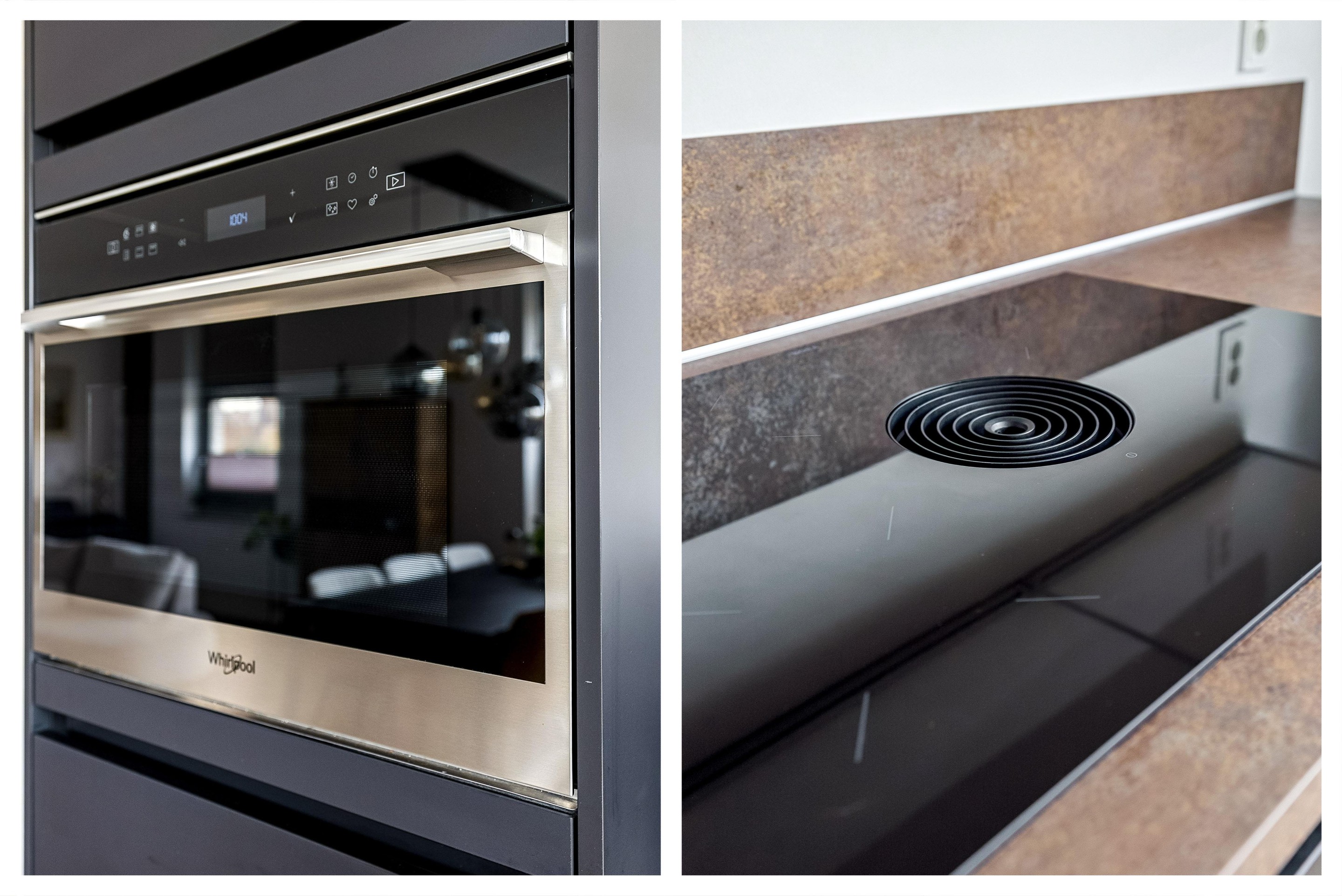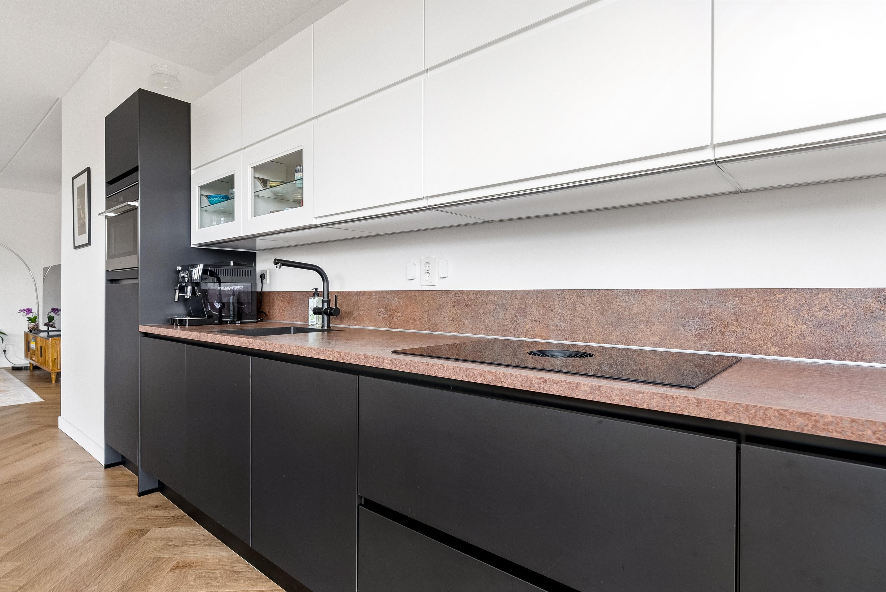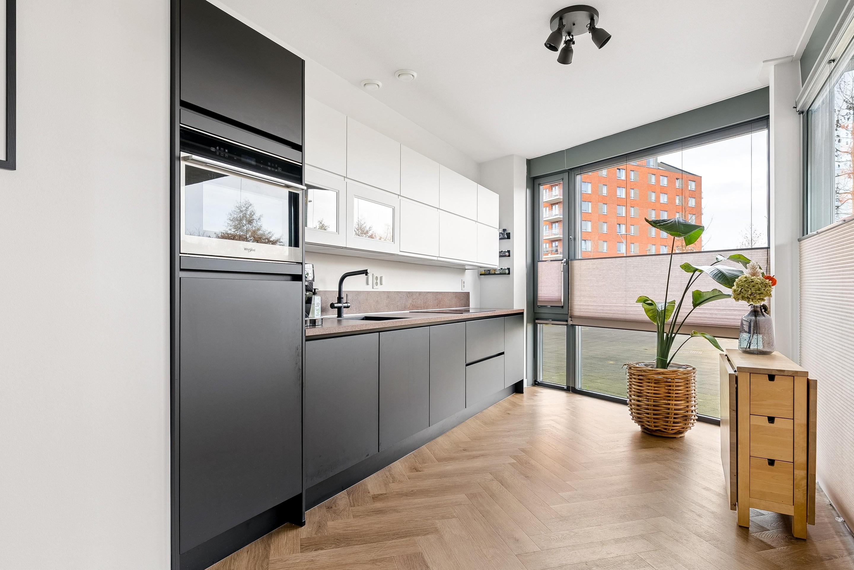 De strakke keuken is van alle moderne gemakken voorzien. In de keuken is de volgende inbouwapparatuur inbegrepen: koelkast met vriesvak, vaatwasser, combimagnetron, kokend waterkraan en inductiekookplaat met ingebouwde afzuigkap.