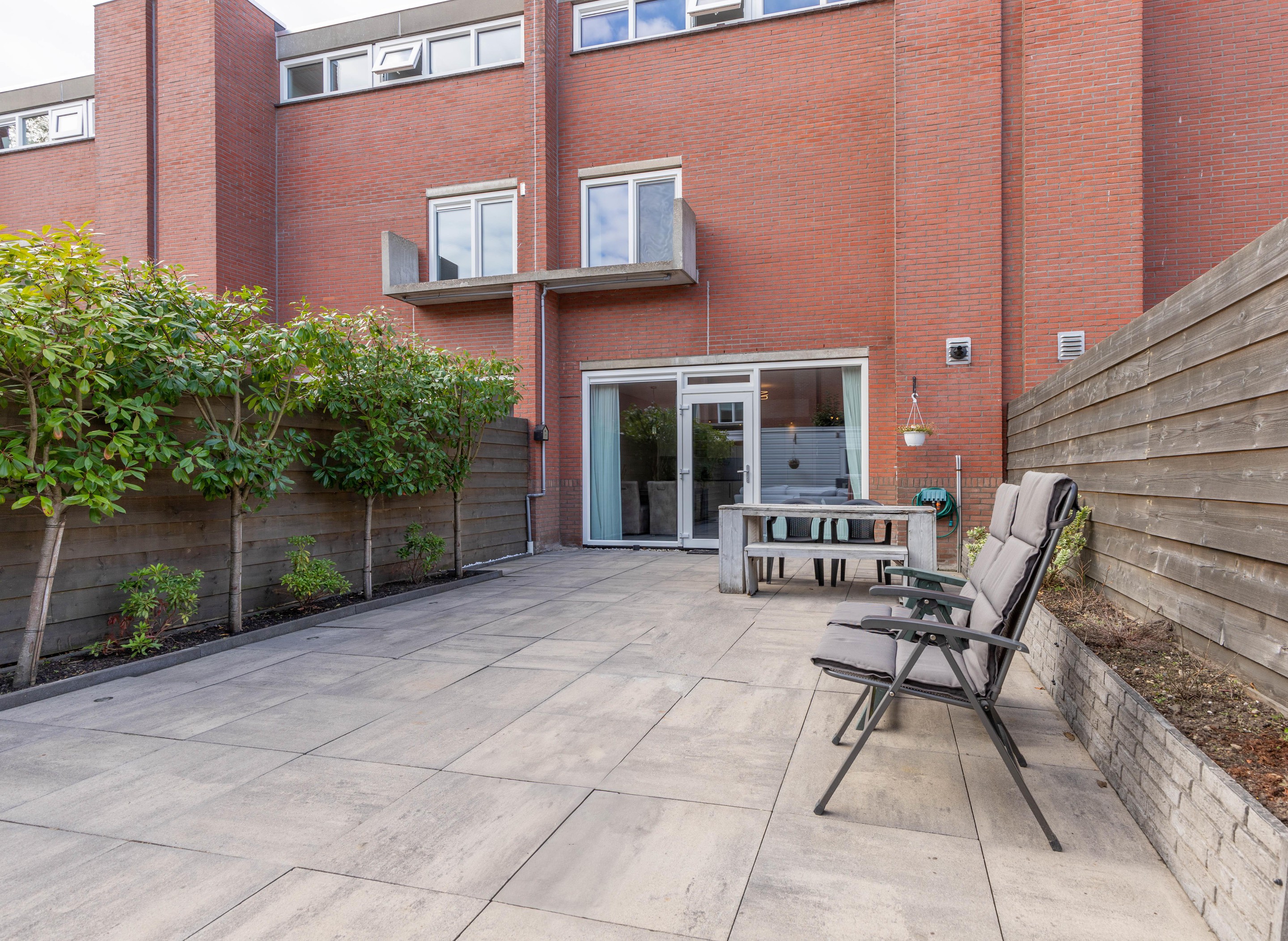 De lichte woonkamer met grote ramen biedt uitzicht en toegang tot de achtertuin. Deze zonnige tuin (zuidoosten) is een echte plus: voorzien van sierbestrating, buitenkraan, berging met elektra en achterom. Hier kun je de hele dag door van de zon genieten!