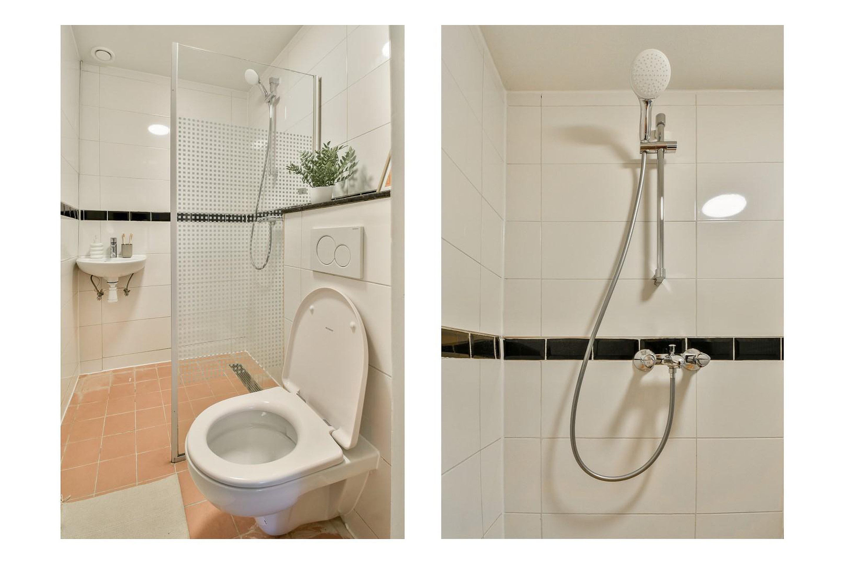 Aan de achterzijde vind je de eerste slaapkamer (ca. 8 m2) en de badkamer, uitgerust met een douche, toilet en wastafel.