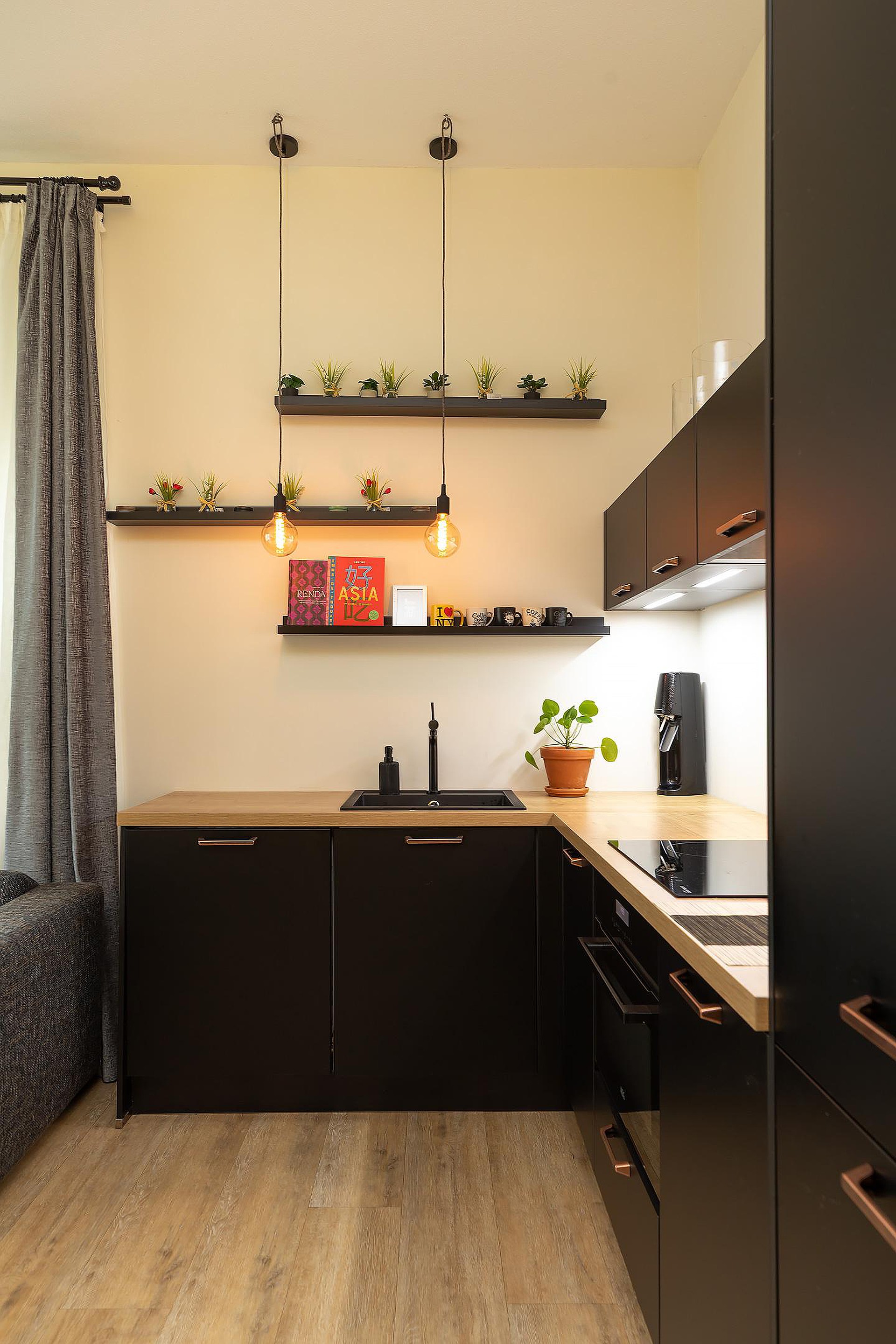 The open kitchen is modern and practical. Its L-shaped layout provides plenty of workspace and storage. It comes fully equipped with a fridge, freezer, combi-oven, dishwasher, and induction hob.