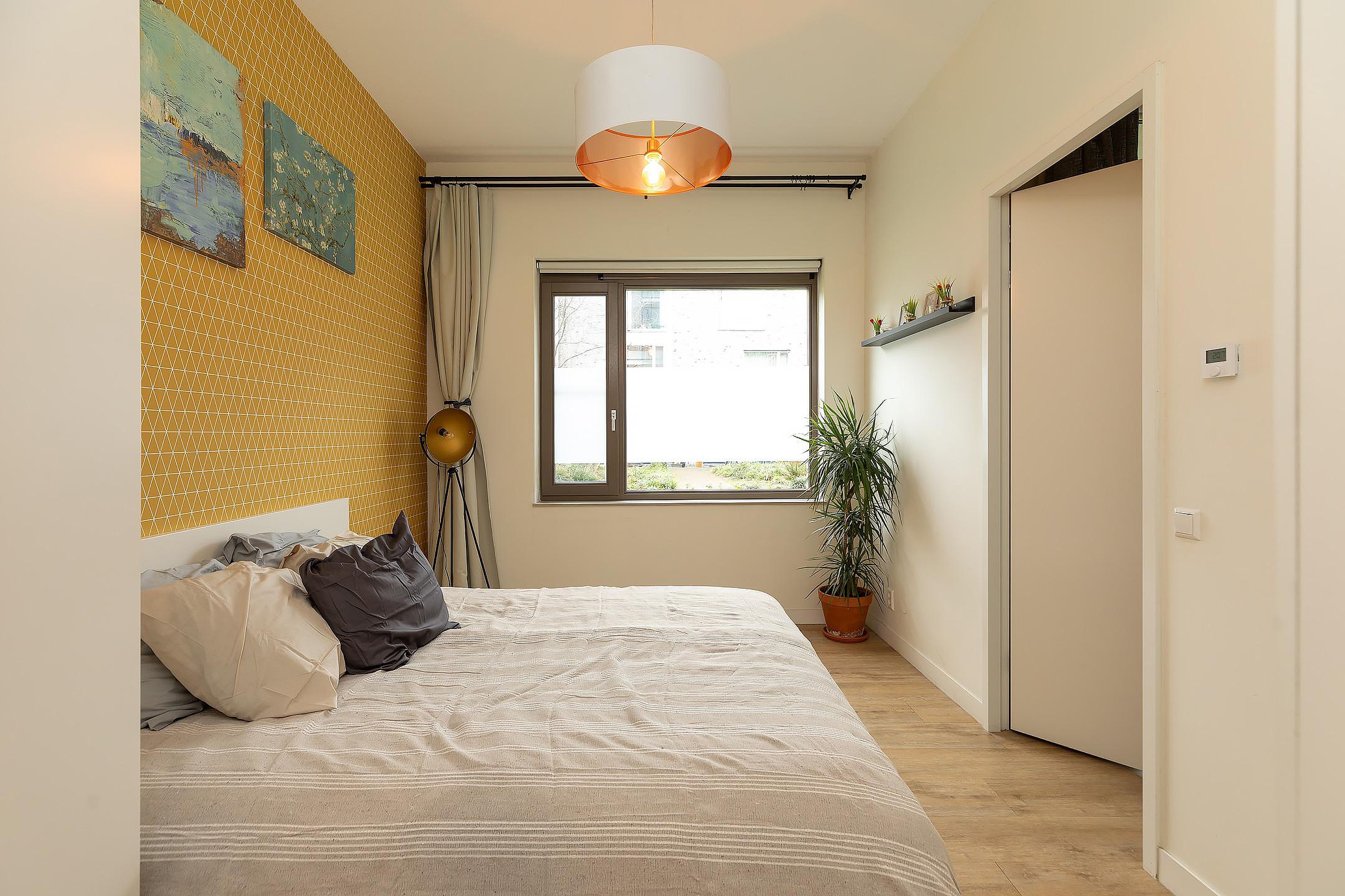 De slaapkamer is opvallend ruim en licht. Voor thuiswerkers is er voldoende ruimte om een bureau te plaatsen naast een tweepersoonsbed en de nodige kasten. In de slaapkamer ligt eveneens vloerverwarming met een PVC-vloer.