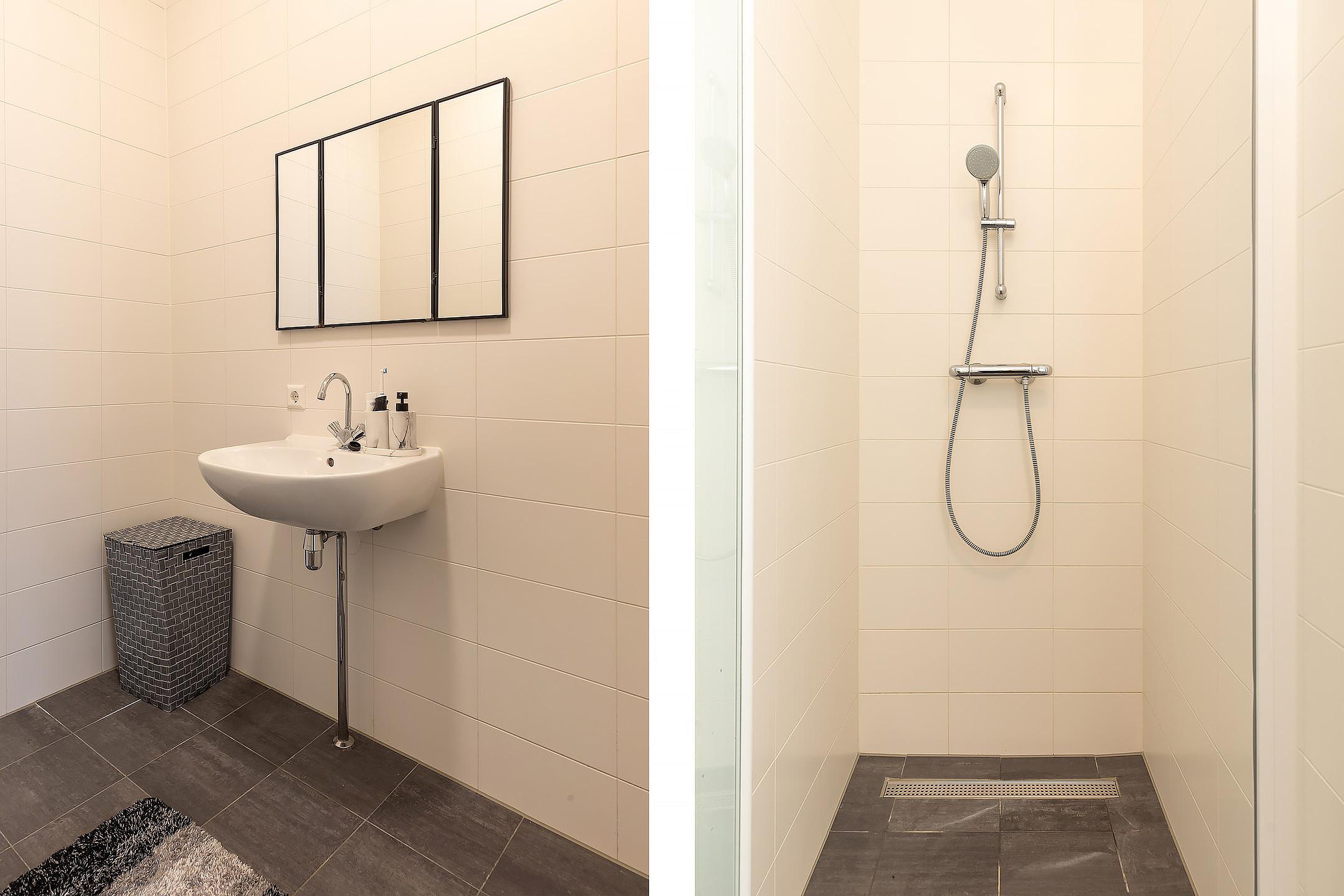 De badkamer is modern en netjes afgewerkt met een inloopdouche en wastafelmeubel. De vloerverwarming maakt het aangenaam en de mechanische ventilatie -die door het gehele appartement is aangelegd- zorgt voor een fris gevoel.