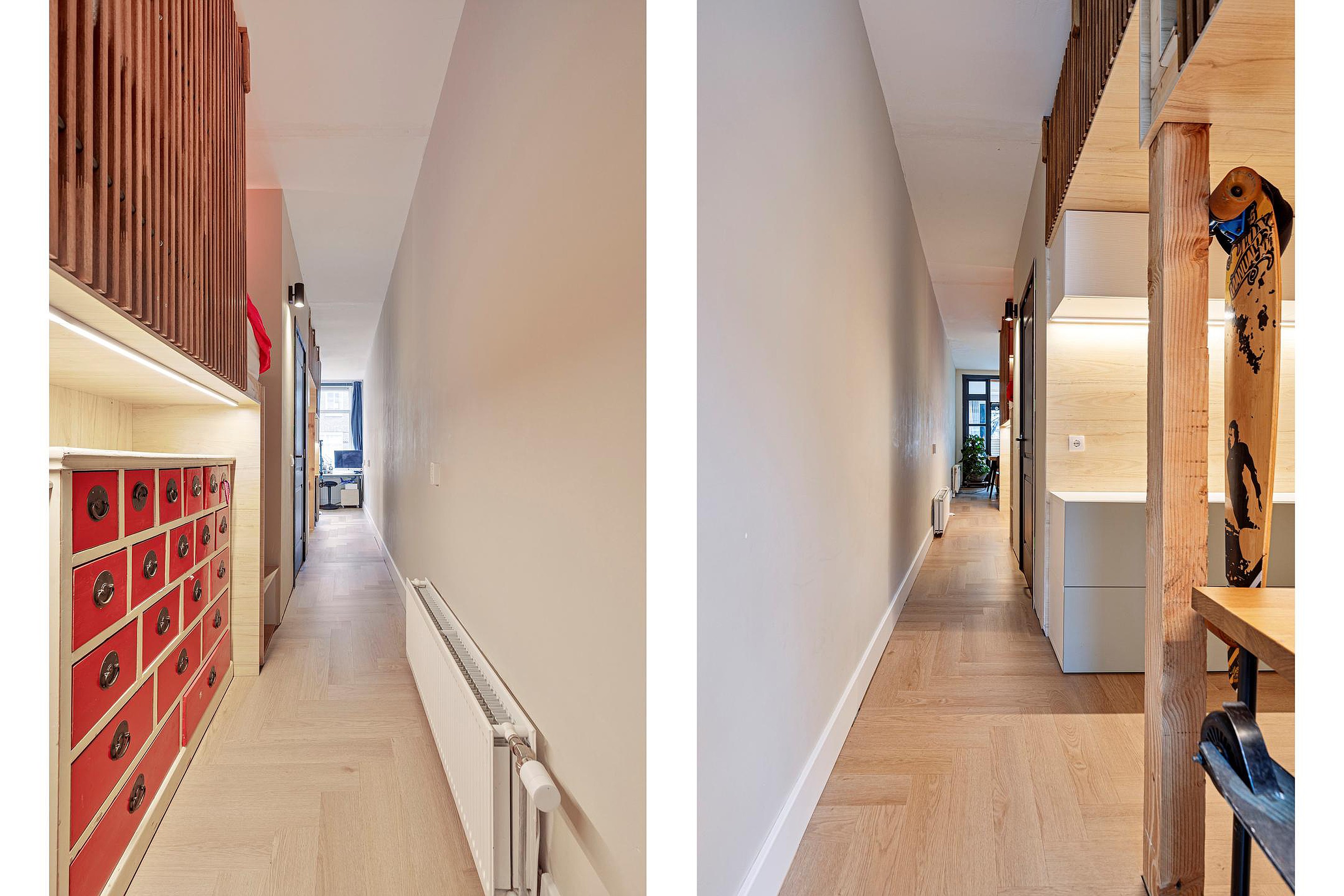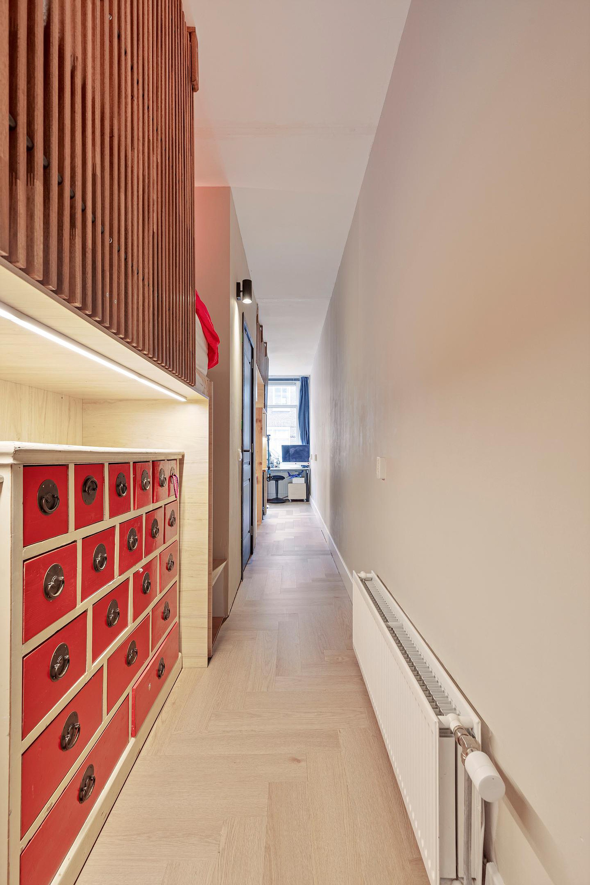 Via de eetkamer bereikt u het rustig gelegen slaapgedeelte. Hier bevinden zich twee sfeervolle en speels ingedeelde slaapruimtes met een slim split-level ontwerp. De verhoogde slaapplaatsen zijn bereikbaar via een charmant trappetje en geven de ruimtes een knus en uniek karakter. Onder de ene slaapruimte is extra bergruimte gerealiseerd, terwijl onder de andere een praktische en rustige werkplek is ingericht. Grenzend aan een van de slaapruimtes, aan de voorzijde van de woning, bevindt zich tevens nog een extra lichte ruimte direct aan het raam. Deze kamer kan gebruikt worden als speelruimte, rustige zithoek of extra werkplek, een flexibele plek die zich makkelijk aanpast. Hoewel deze ruimtes geen traditioneel afgesloten slaapkamers zijn, zijn ze functioneel, creatief en efficiënt benut. Indien gewenst kan de huidige indeling eenvoudig worden aangepast. Zo kan de ene huidige slaap/opbergruimte worden verwijderd en de andere slaap/werkplek aan de voorzijde van de woning worden omgebouwd tot een reguliere slaapkamer.