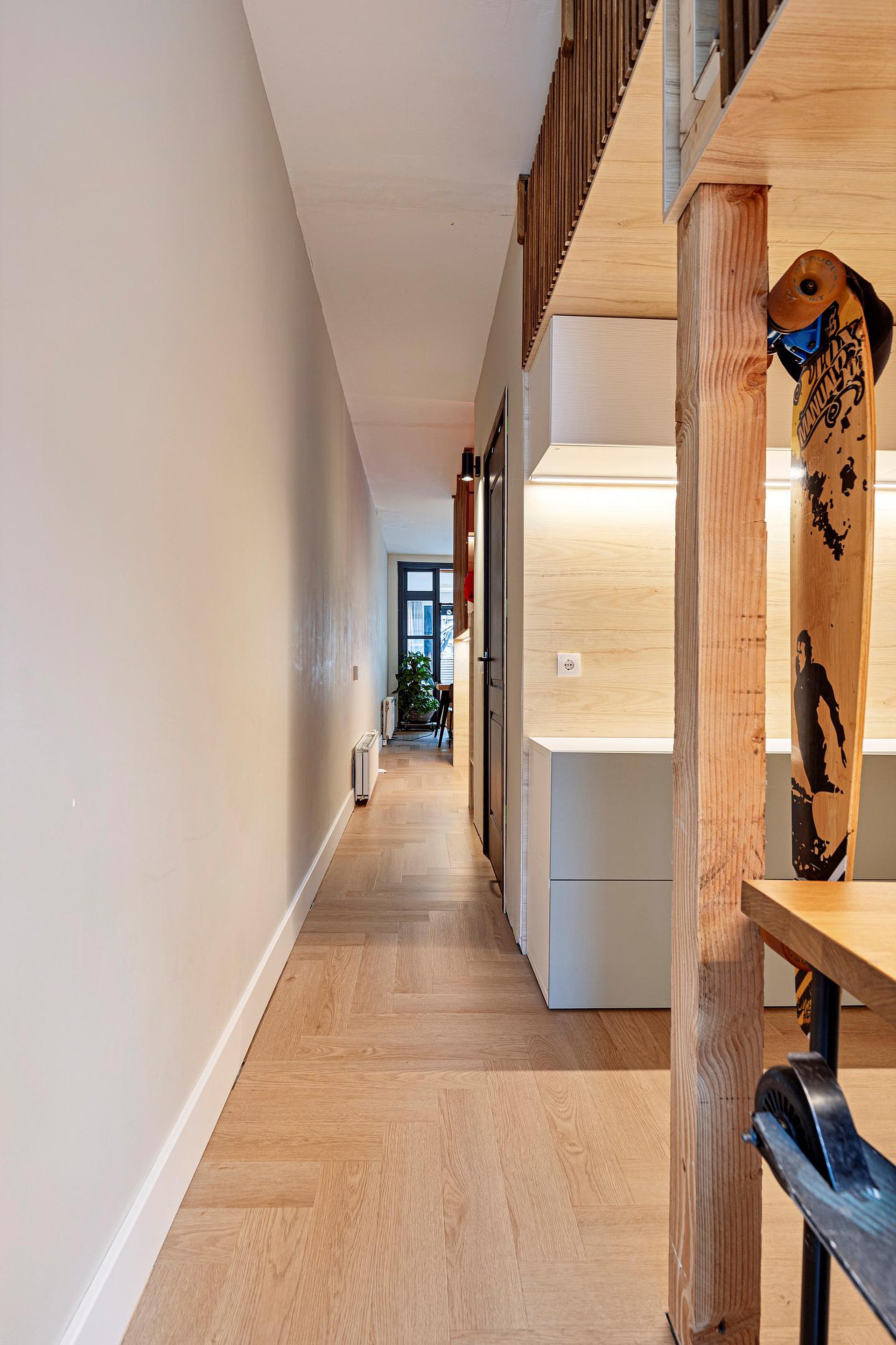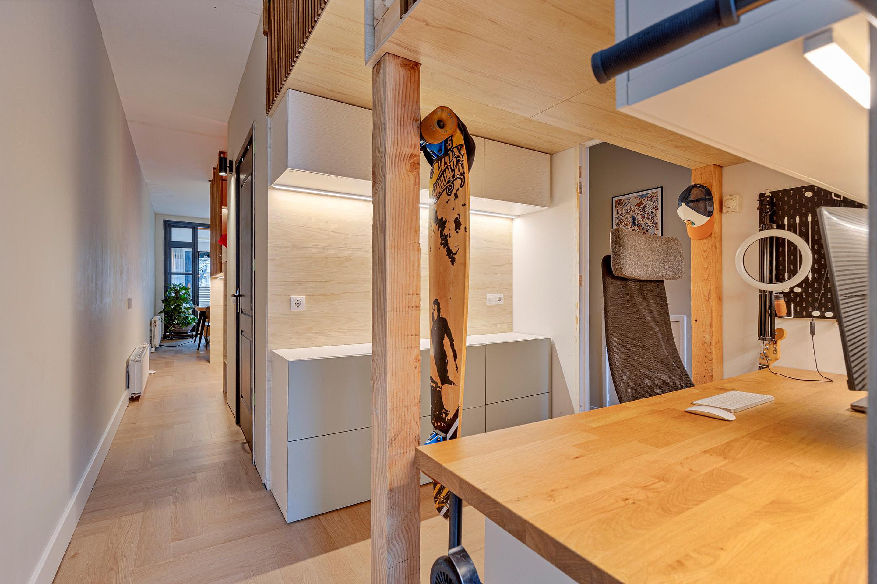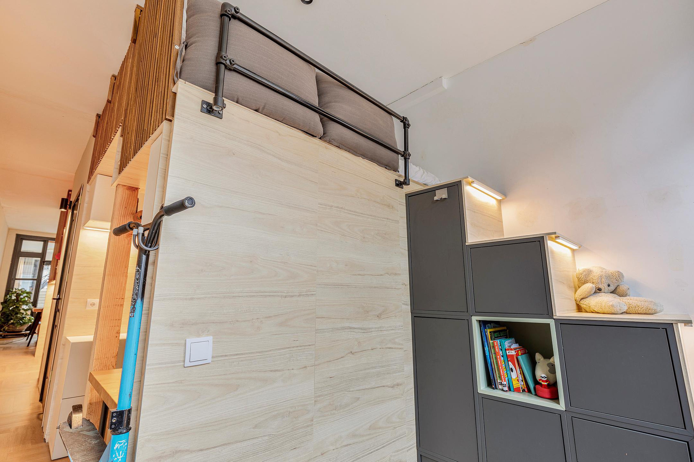 From the dining area, you access the charming sleeping quarters, which comprise two creatively designed bedrooms with a smart split-level layout. The elevated sleeping areas are reached via a little staircase, giving the rooms a cozy and distinctive character. Under one of the bedrooms, additional storage has been cleverly integrated, while under the other, a practical workspace has been created. Adjacent to this workspace is a bright, versatile room by the window, ideal as a play area, quiet reading corner, or additional workspace, a flexible space that adapts easily to your needs. Although these rooms are not traditional enclosed bedrooms, they are highly functional, creative, and efficiently utilized. If desired, the current layout can be easily adapted. The elevated bedroom can be removed, and the storage beneath along with the other raised work/sleep area at the front of the house can be converted into a regular bedroom, offering flexibility to suit future needs.