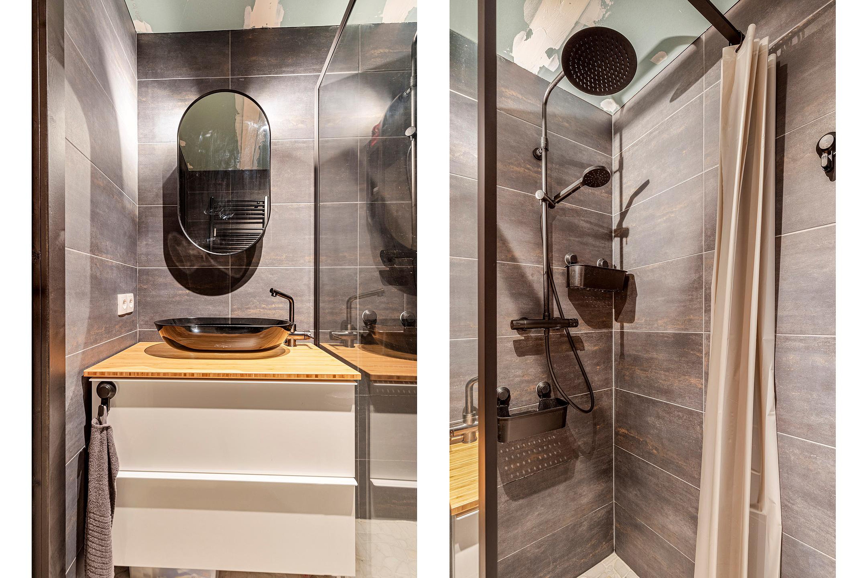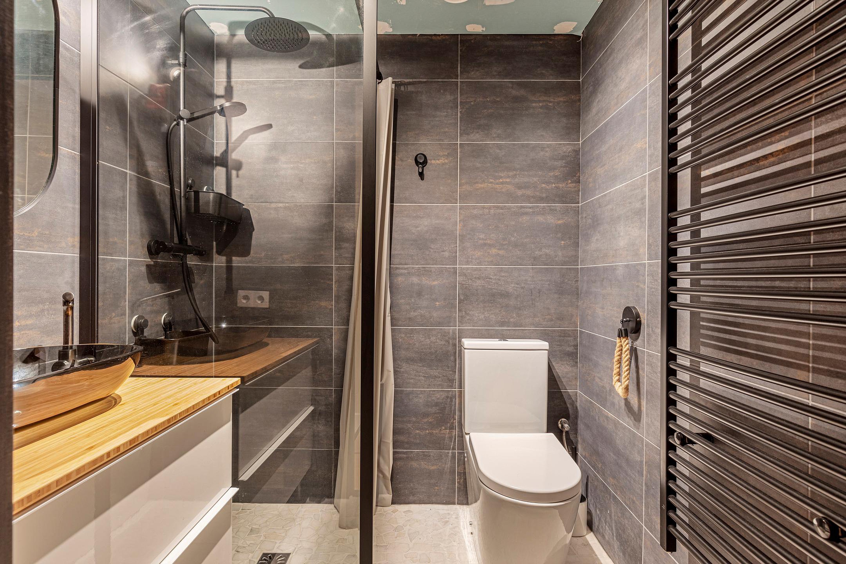Tussen de slaapruimtes ligt de verzorgde badkamer, uitgerust met een comfortabele douche, een stijlvol wastafelmeubel en een toilet. De badkamer en overige vertrekken zijn aangesloten op een centraal ventilatiesysteem, dat lucht afzuigt uit de badkamer, het toilet, de wasruimte, de slaapkamers en de hal, en deze via het dak afvoert.