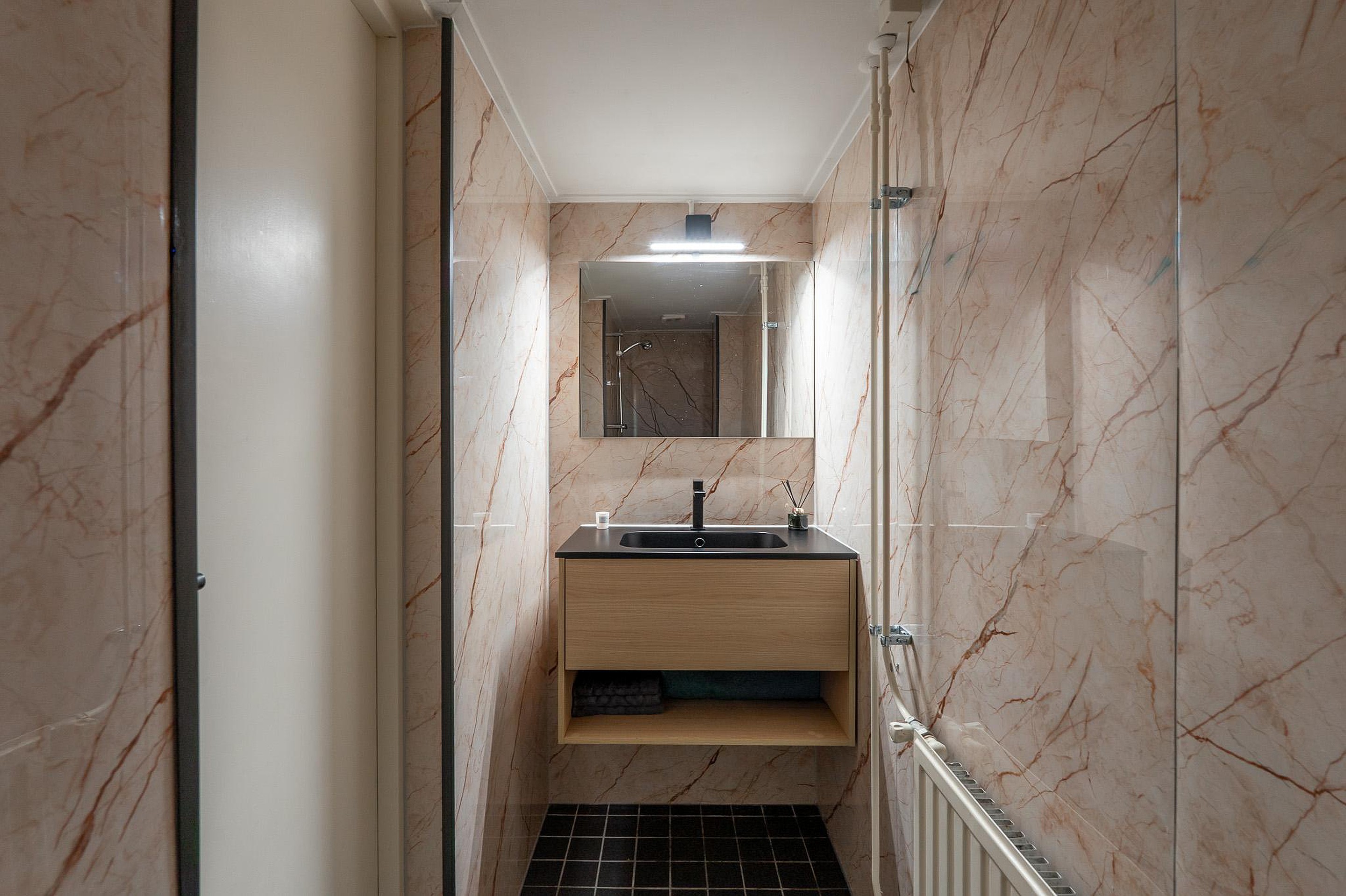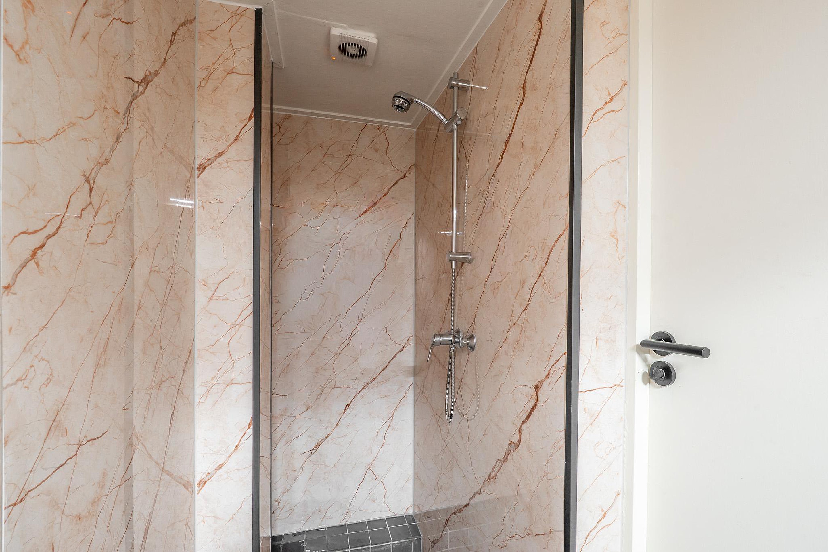 De woning beschikt over één slaapkamer, die dankzij de bouwstijl heerlijk koel blijft in de zomer: een groot pluspunt tijdens warme dagen. De moderne, vernieuwde badkamer is strak afgewerkt en van alle gemakken voorzien.