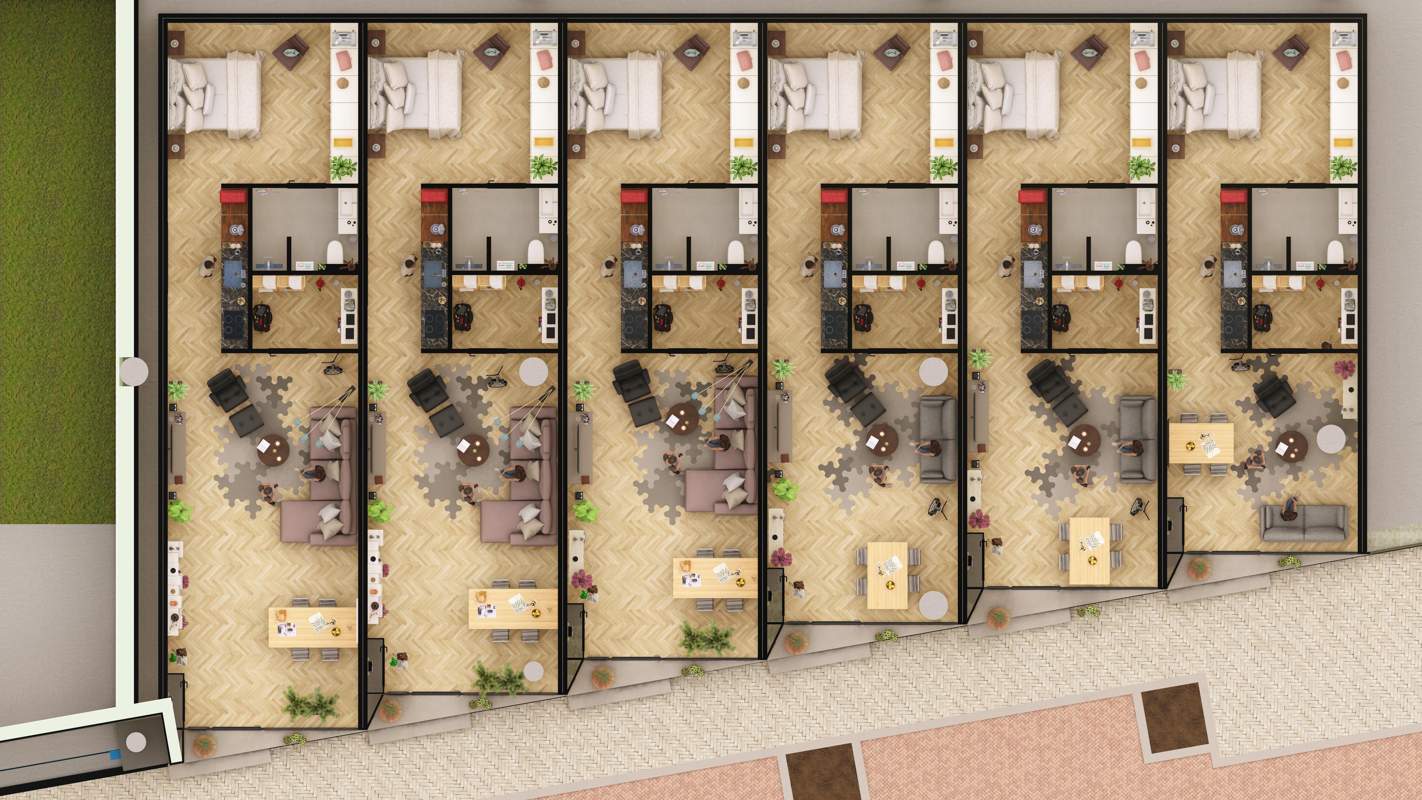 ~ De woningen zijn voorzien van een nieuwe pui, woning scheidende wanden, dekvloer, meterkast, afgedopte rioolaansluitpunten.