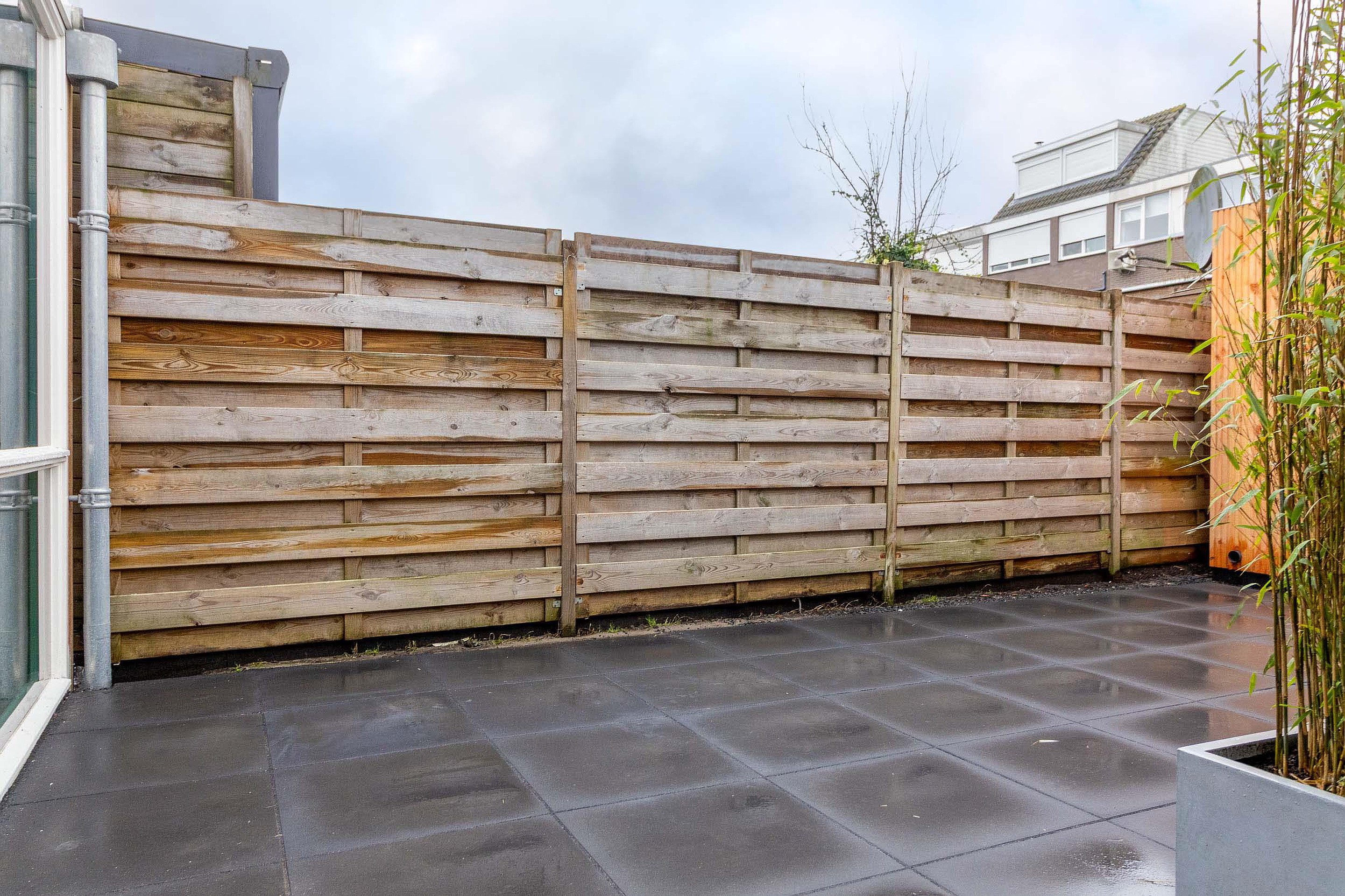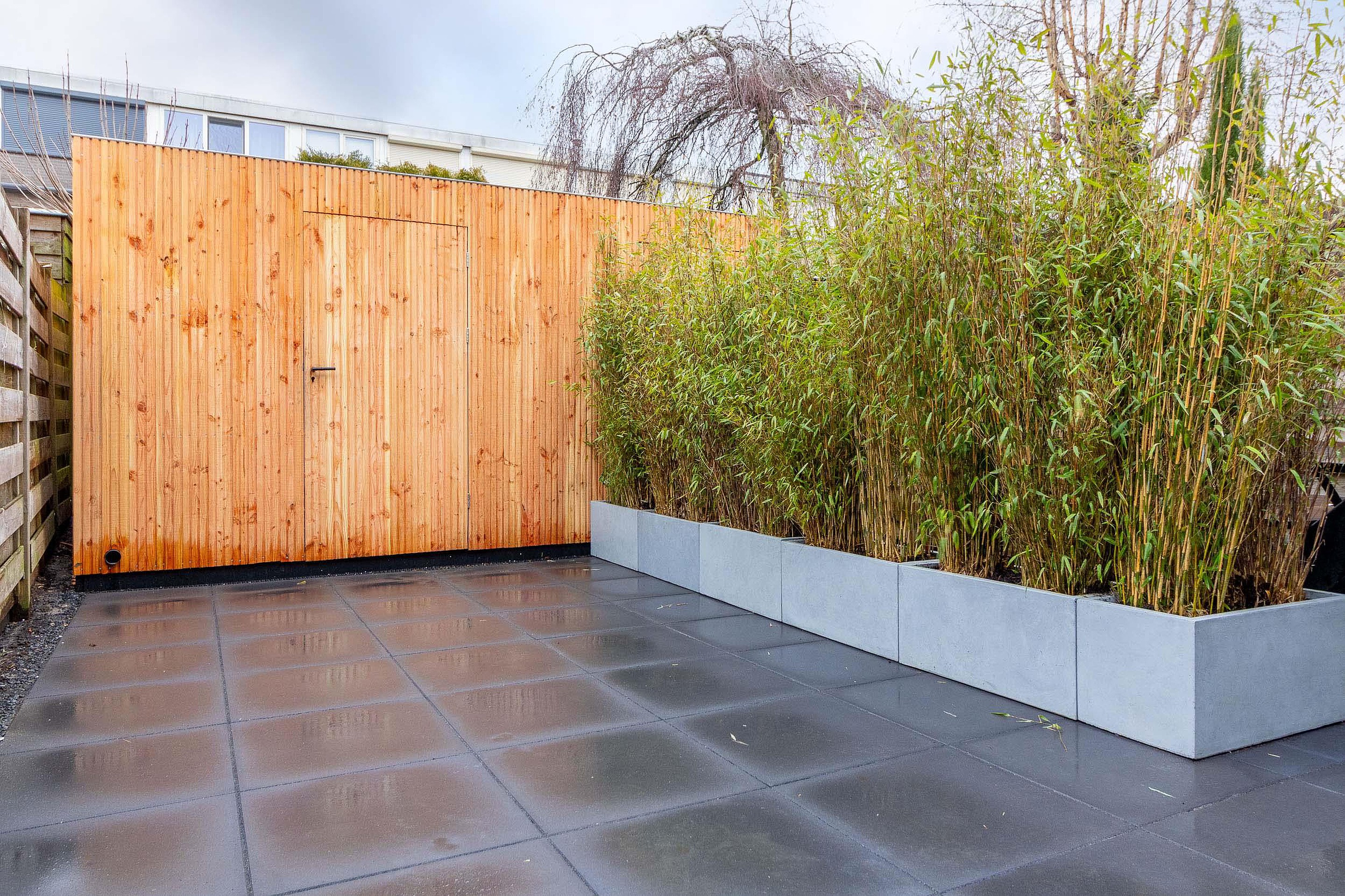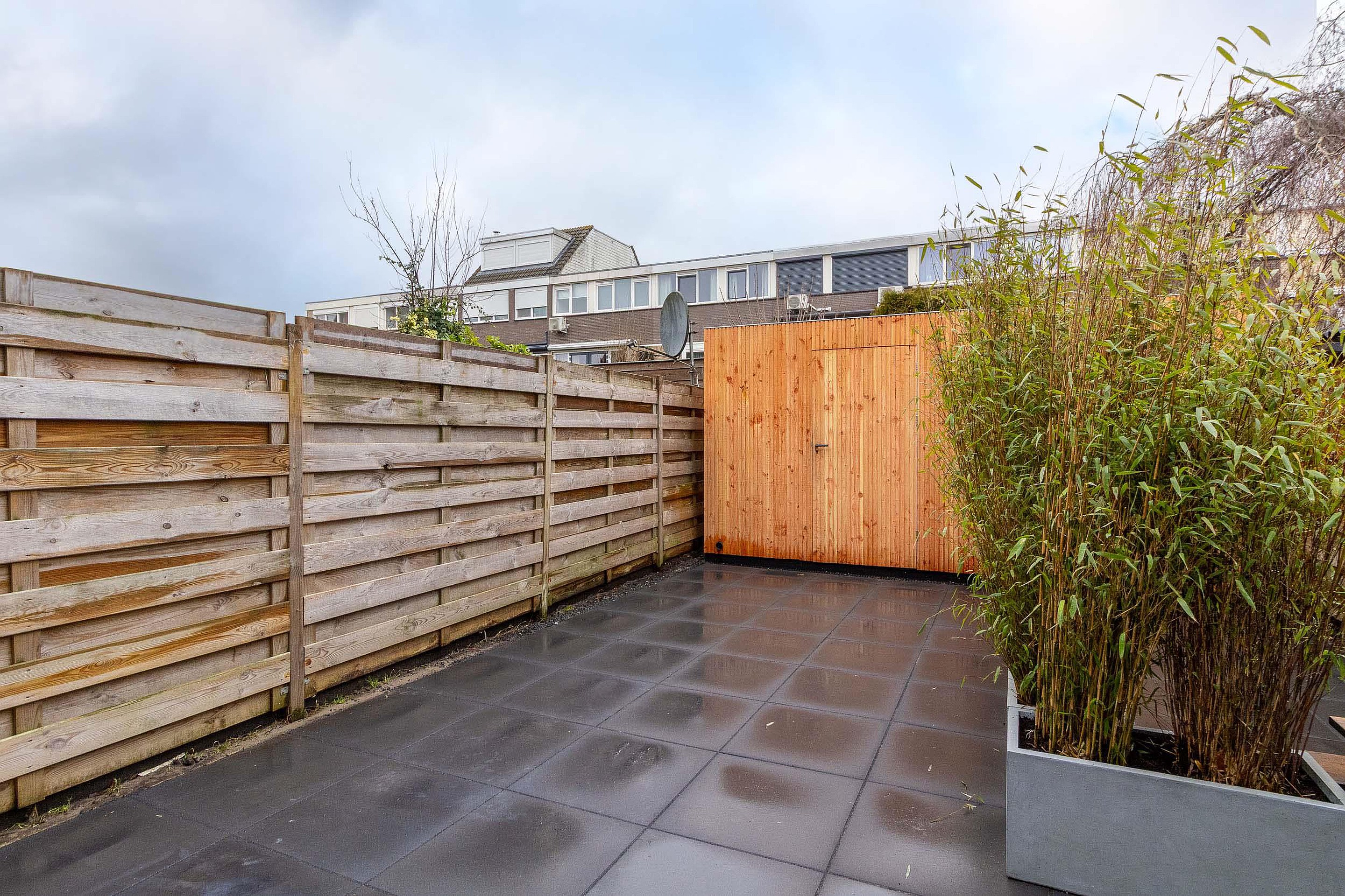 Tuin De onderhoudsvriendelijke tuin is volledig bestraat en biedt volop ruimte om heerlijk buiten te zitten. Achterin de tuin bevindt zich een praktische berging, ideaal voor extra opslag. De tuin is omsloten door houten schuttingen en voorzien van plantenbakken met bamboe, die zorgen voor een groene uitstraling en extra privacy ten opzichte van het pad van de bovenburen.