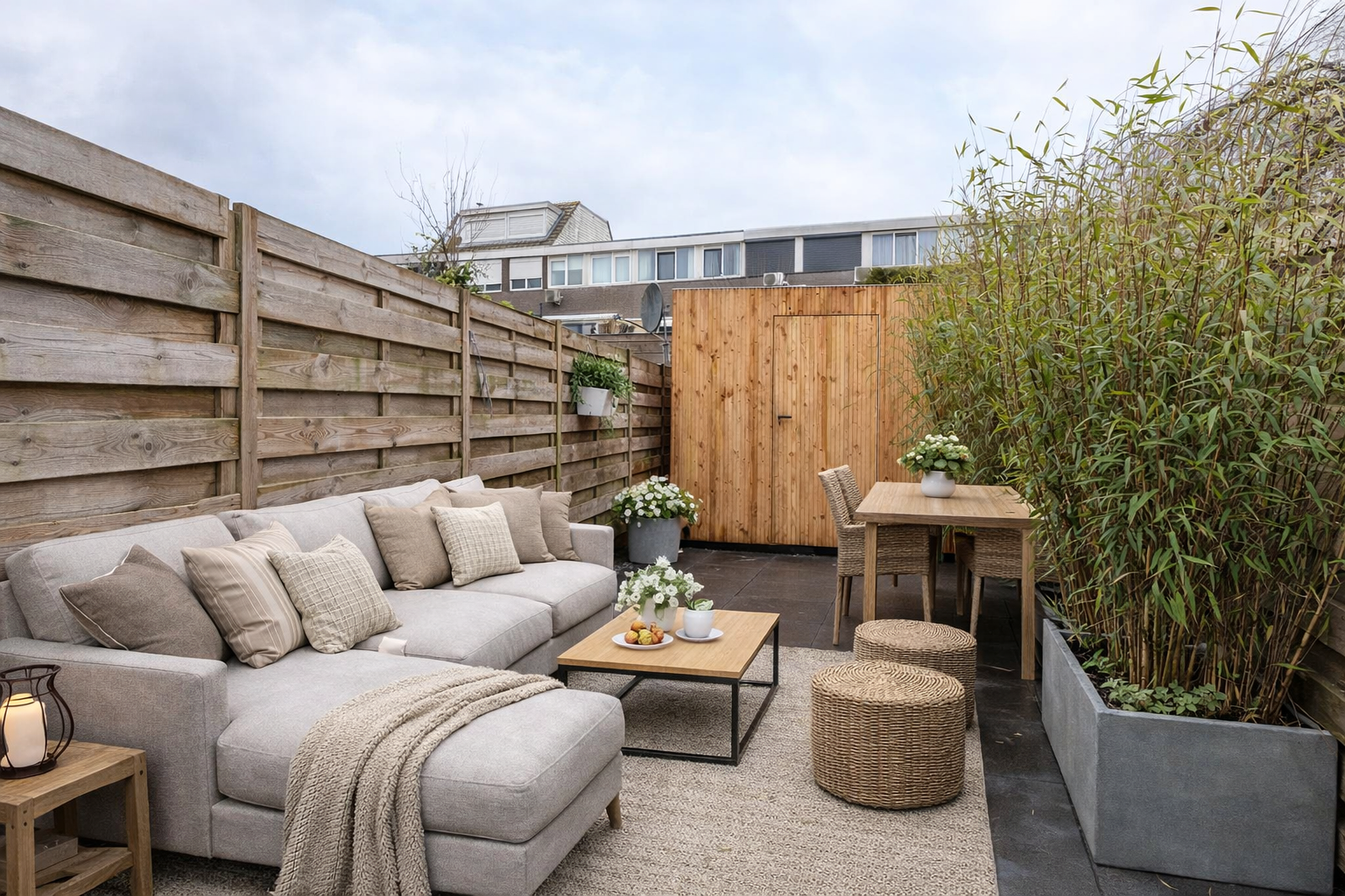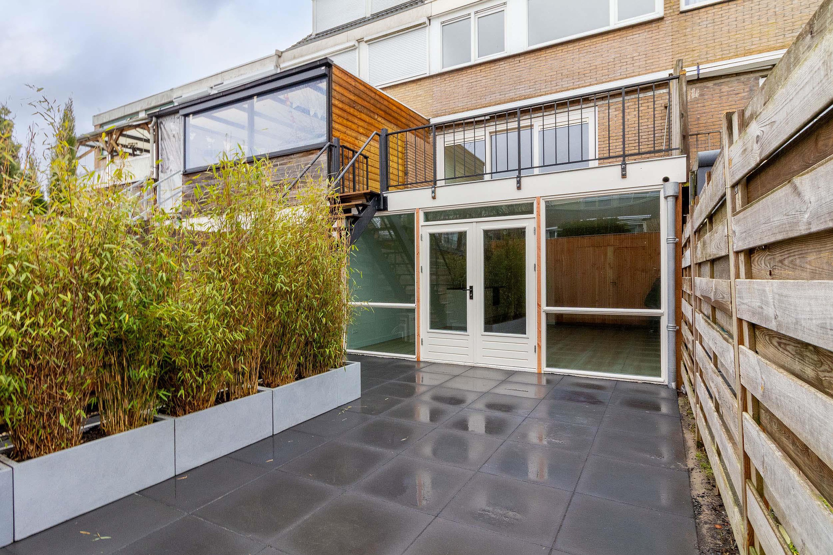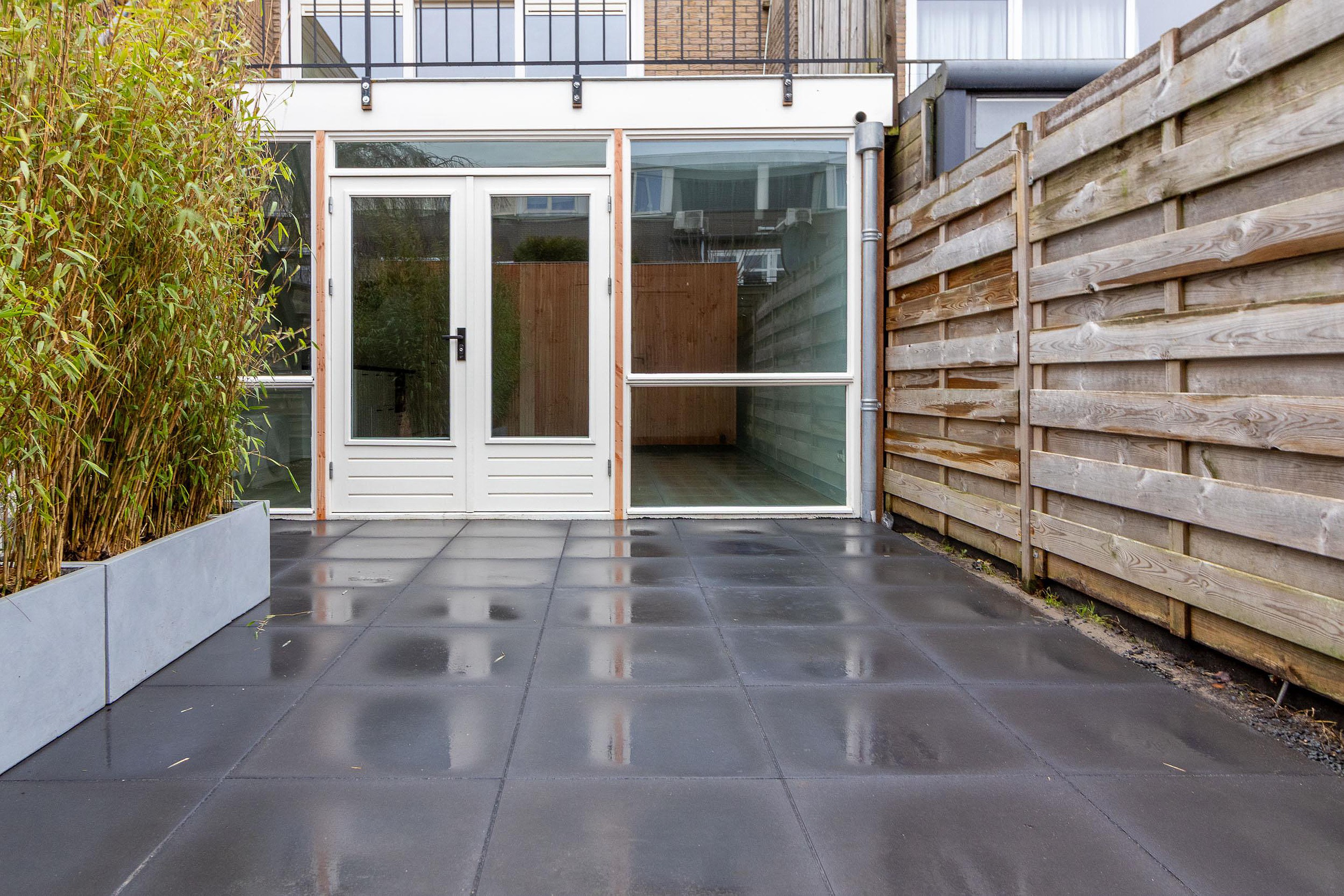 Tuin De onderhoudsvriendelijke tuin is volledig bestraat en biedt volop ruimte om heerlijk buiten te zitten. Achterin de tuin bevindt zich een praktische berging, ideaal voor extra opslag. De tuin is omsloten door houten schuttingen en voorzien van plantenbakken met bamboe, die zorgen voor een groene uitstraling en extra privacy ten opzichte van het pad van de bovenburen.