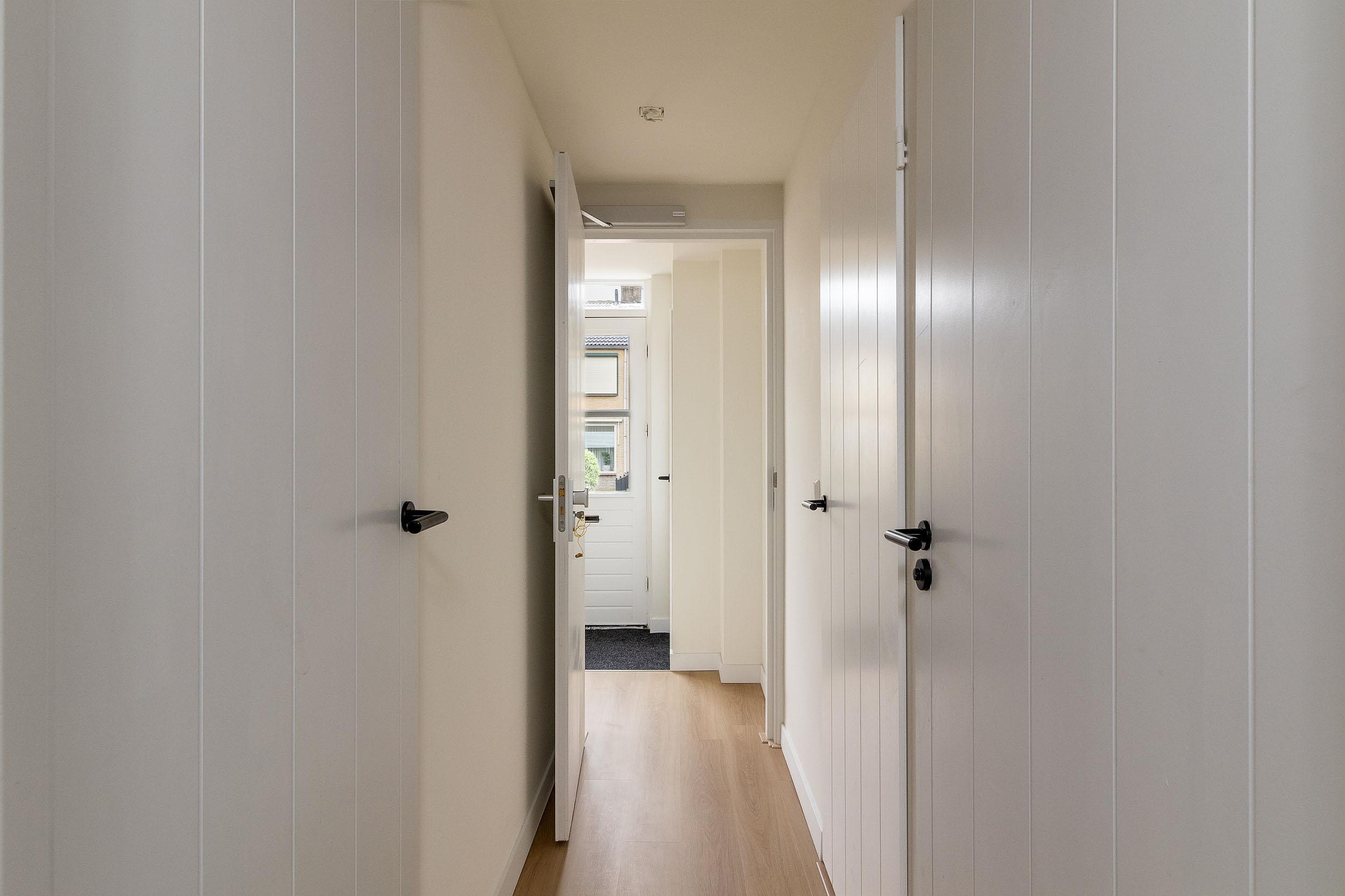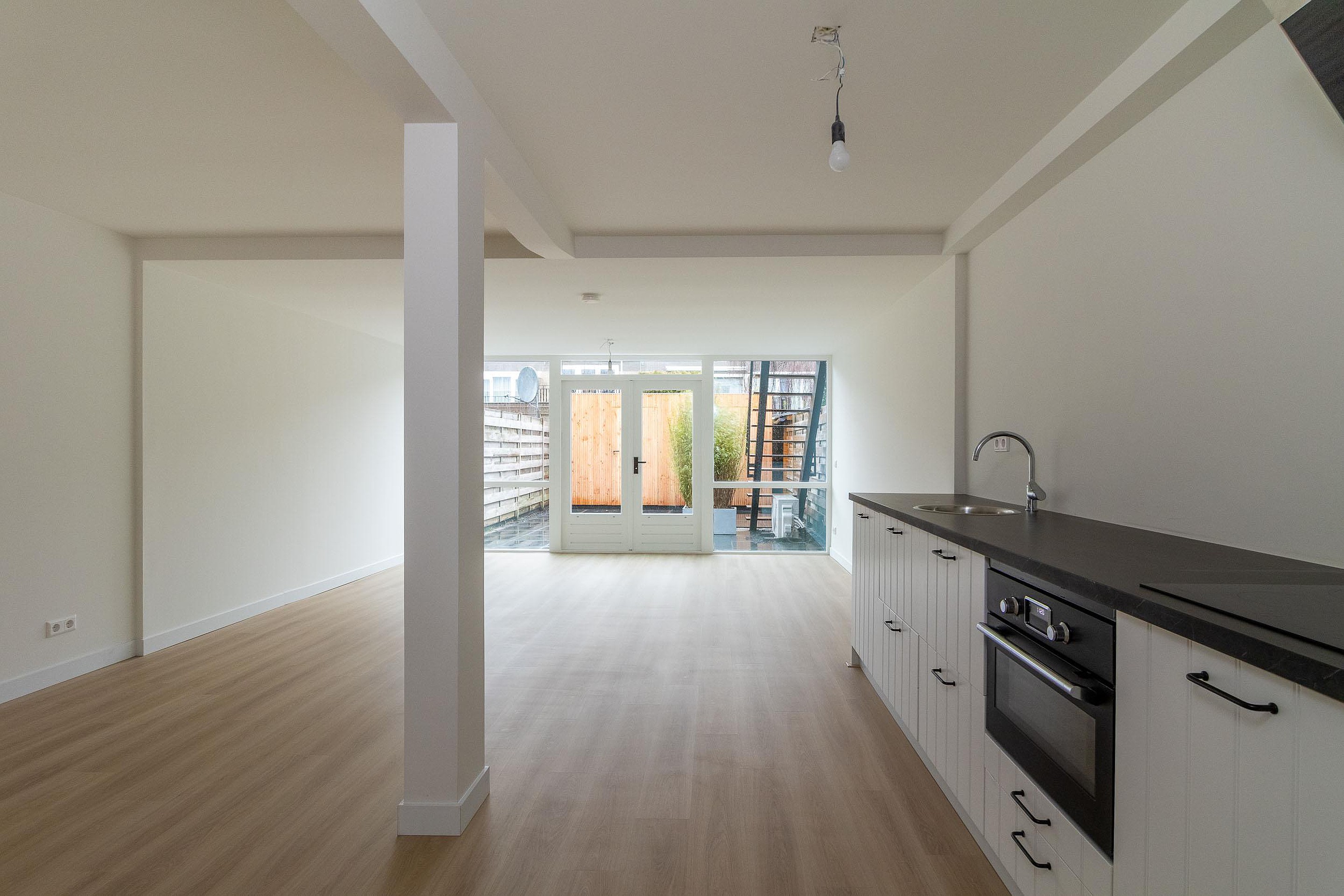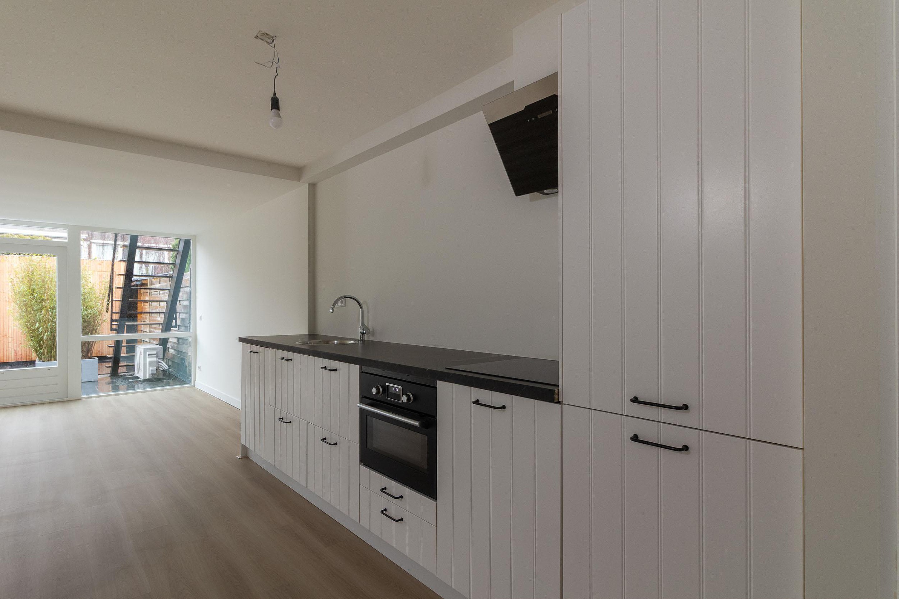 Begane grond Via de entree met garderobe en meterkast betreedt u het appartement. Vanuit de hal heeft u toegang tot het toilet, de badkamer en de slaapkamer aan de voorzijde. De badkamer is praktisch ingericht en voorzien van douche en wastafel. De slaapkamer biedt voldoende ruimte voor een tweepersoonsbed en kastruimte. Aan de achterzijde bevindt zich de lichte, tuingerichte woonkamer met openslaande deuren naar buiten. Aangrenzend ligt de open keuken in rechte opstelling, wat zorgt voor een prettige verbinding tussen koken en wonen.