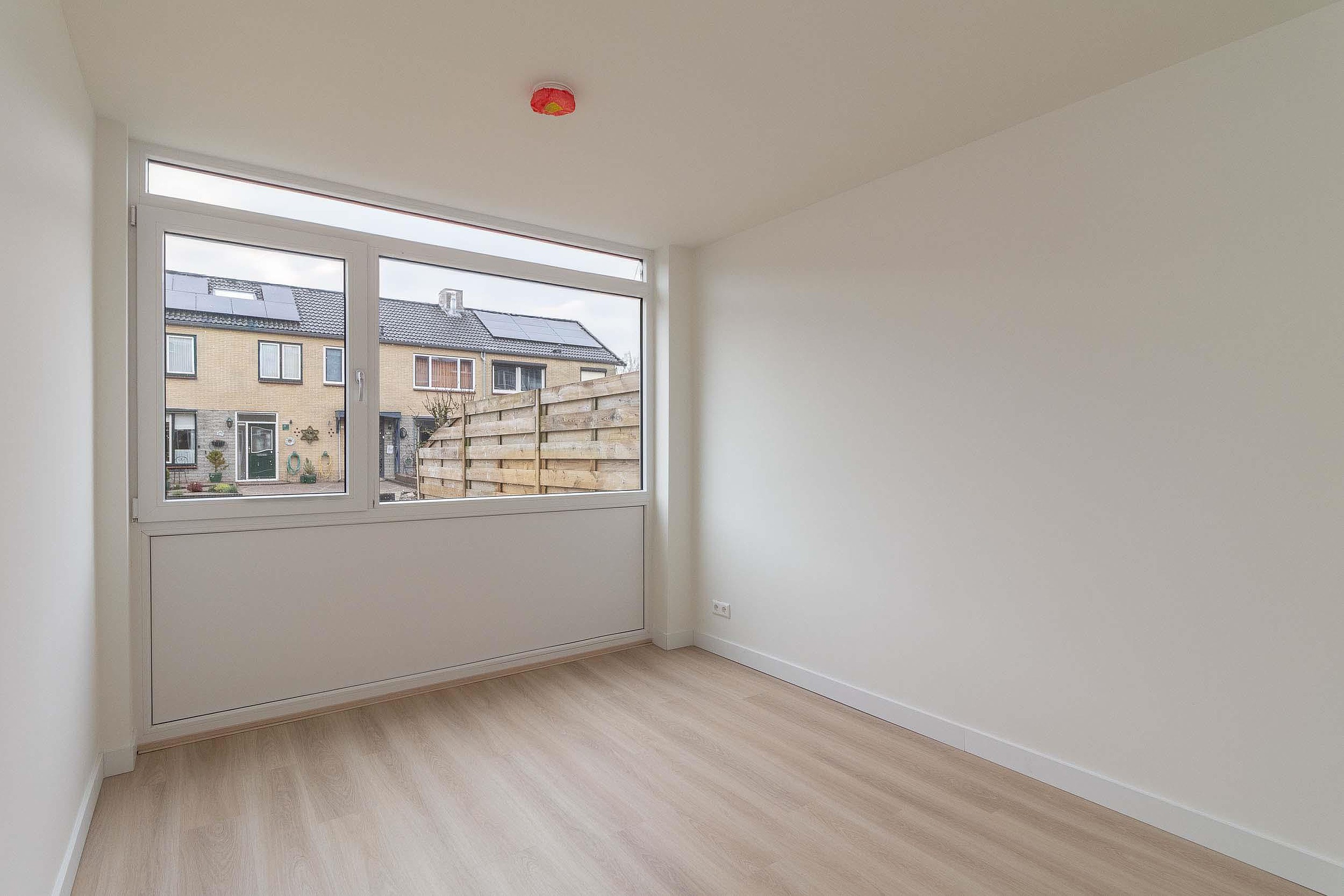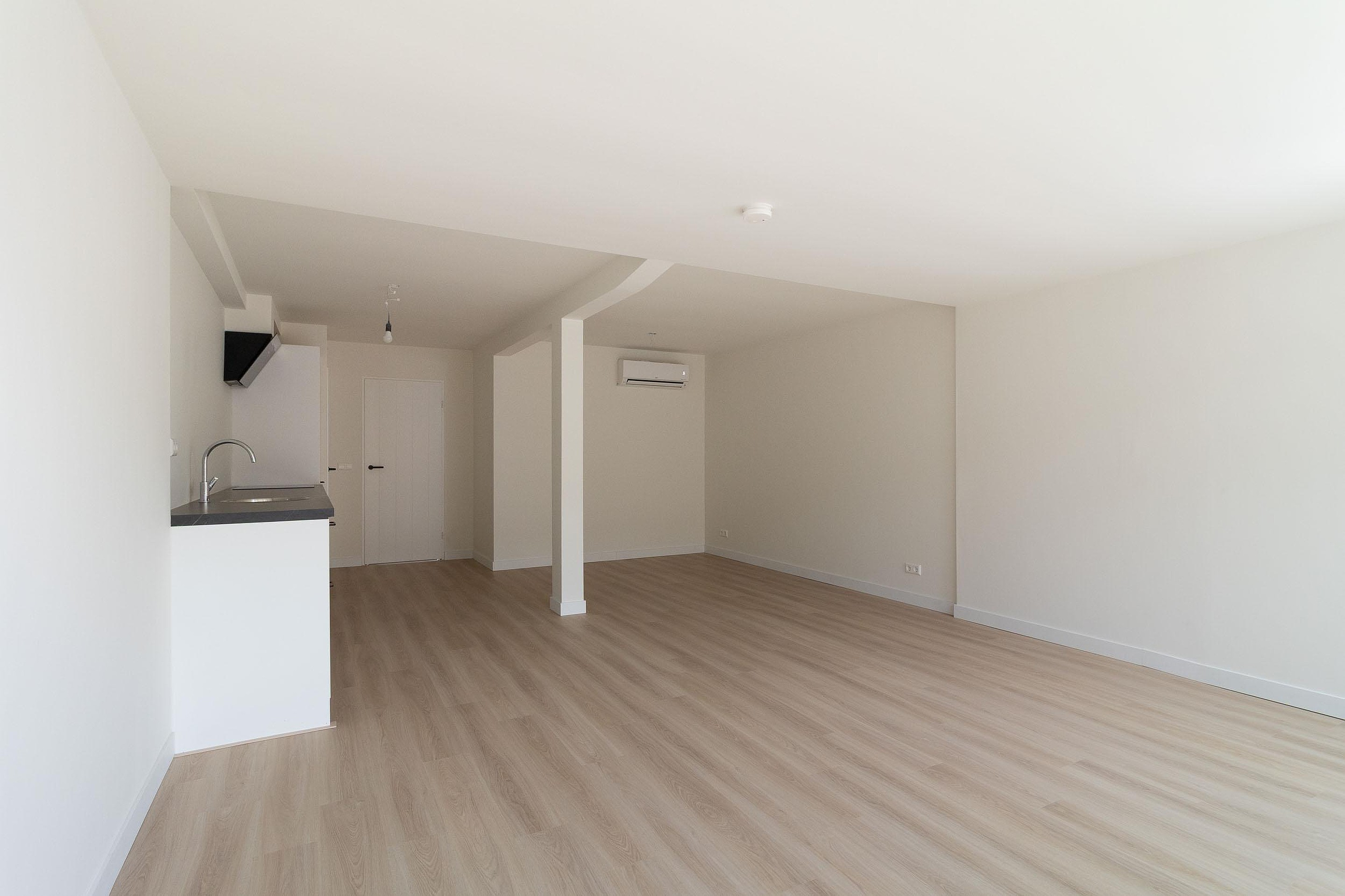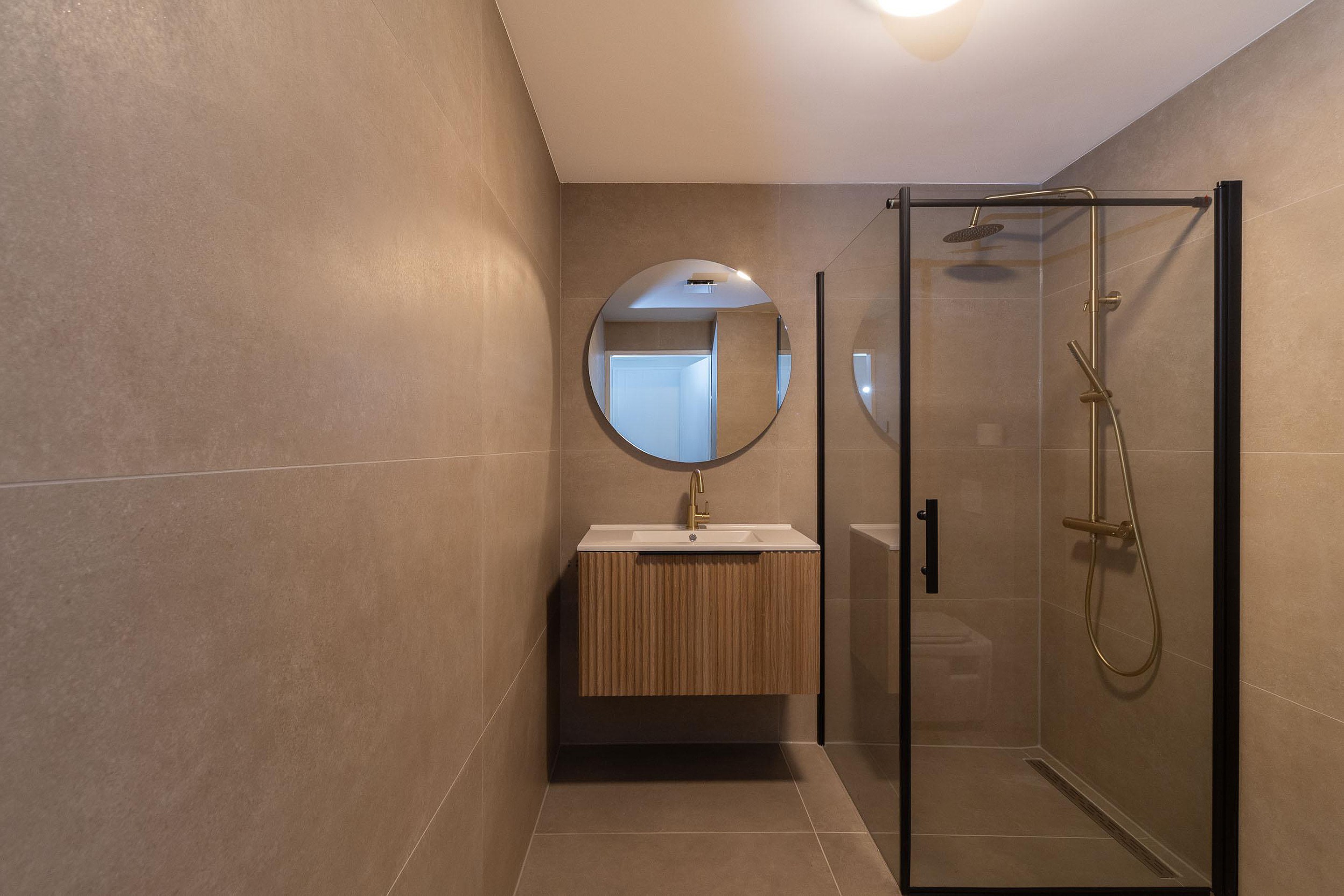 De woonkamer vormt samen met de keuken een prettige leefruimte waar wonen en koken moeiteloos in elkaar overlopen. Alles is overzichtelijk en praktisch ingedeeld, met een fijne rust die past bij gelijkvloers wonen. Ook de badkamer is volledig vernieuwd en sluit naadloos aan bij de rest van de woning, wat zorgt voor een verzorgde en eigentijdse uitstraling.