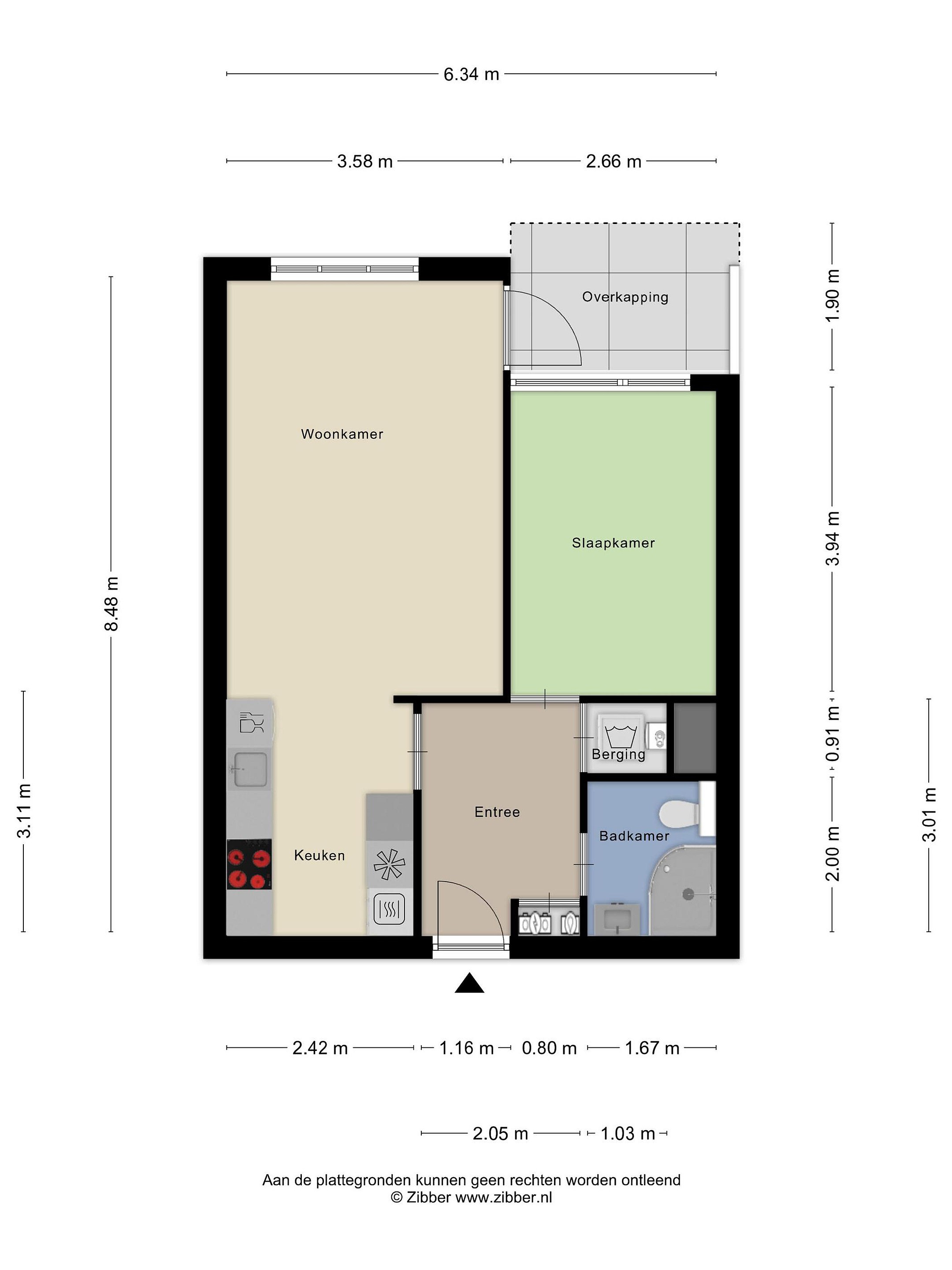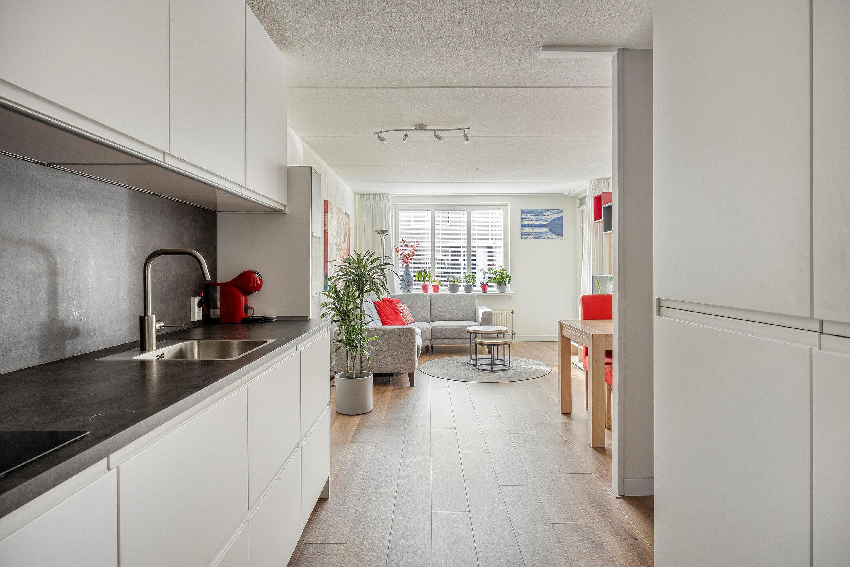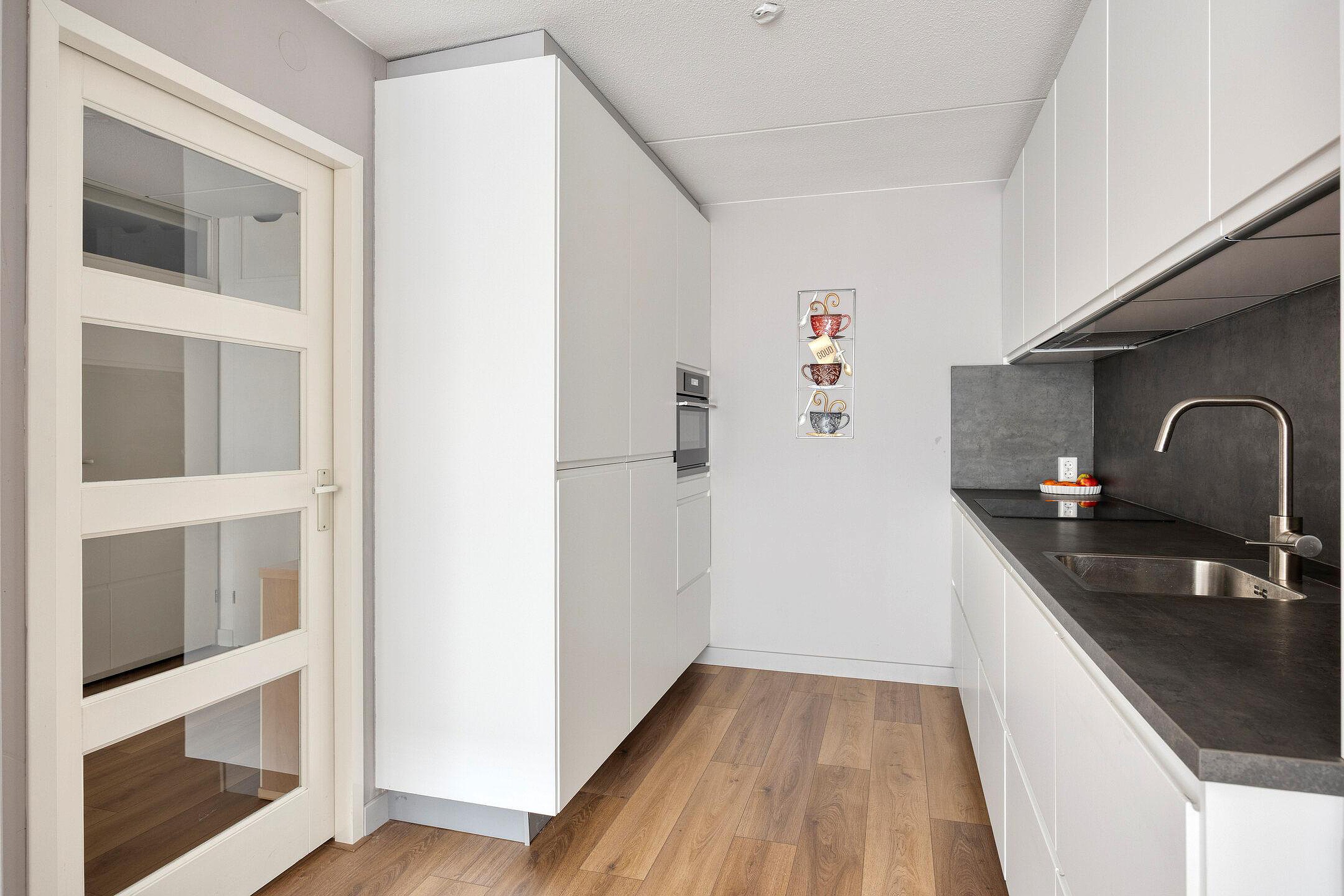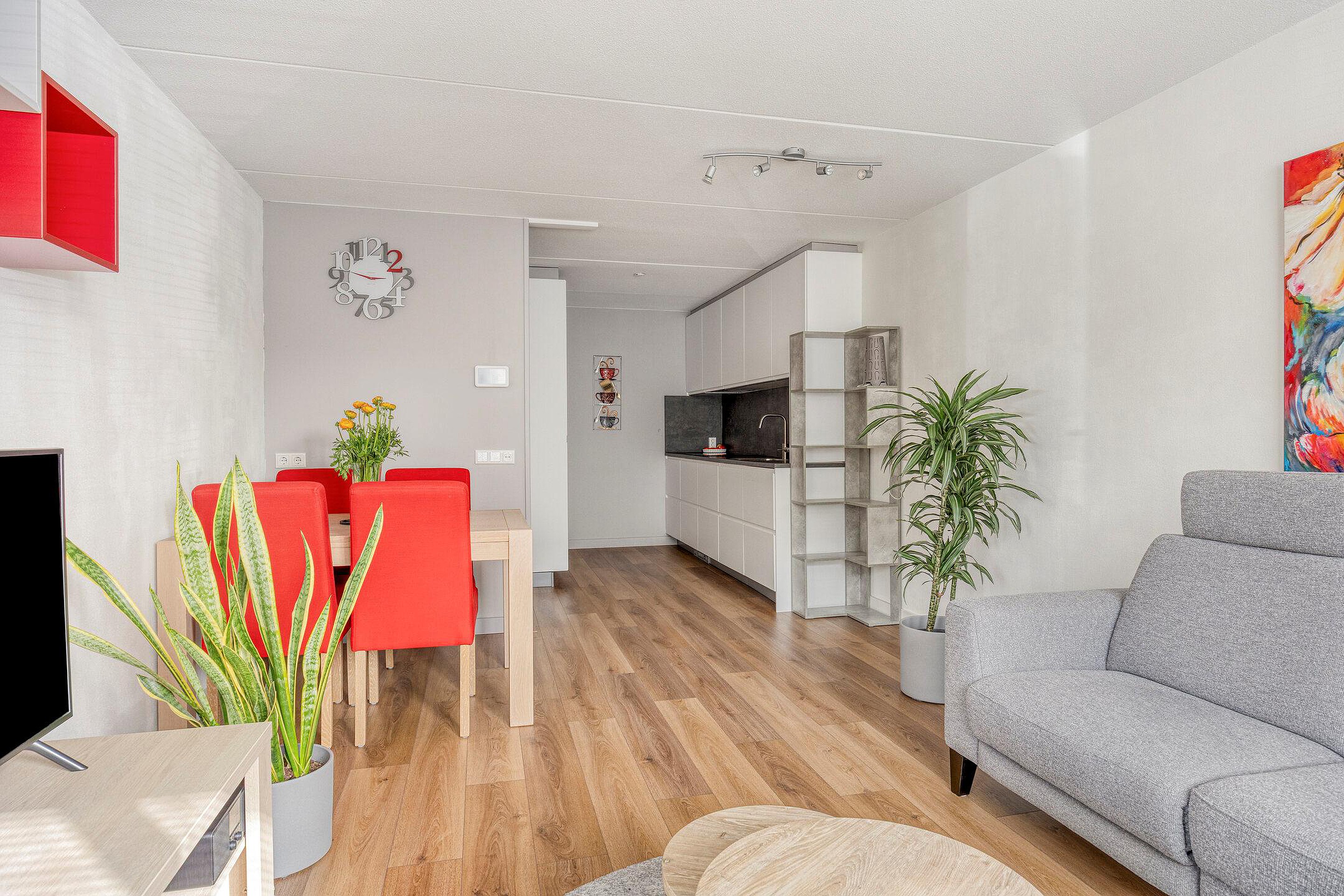 De entree/ hal, met meterkast (9 groepen en 2 aardlekschakelaars), geeft toegang tot woonkamer, slaapkamer, bergkast en badkamer. De woonkamer is sfeervol en licht en geeft toegang tot het zonnige terras/balkon, omringd door veel groen. Je kunt hier heerlijk buiten vertoeven. Het woonkamerraam is voorzien van een elektrisch screen. De moderne open keuken is voorzien van een inductiekookplaat, afzuigkap, koel-vriescombinatie en combi-oven.