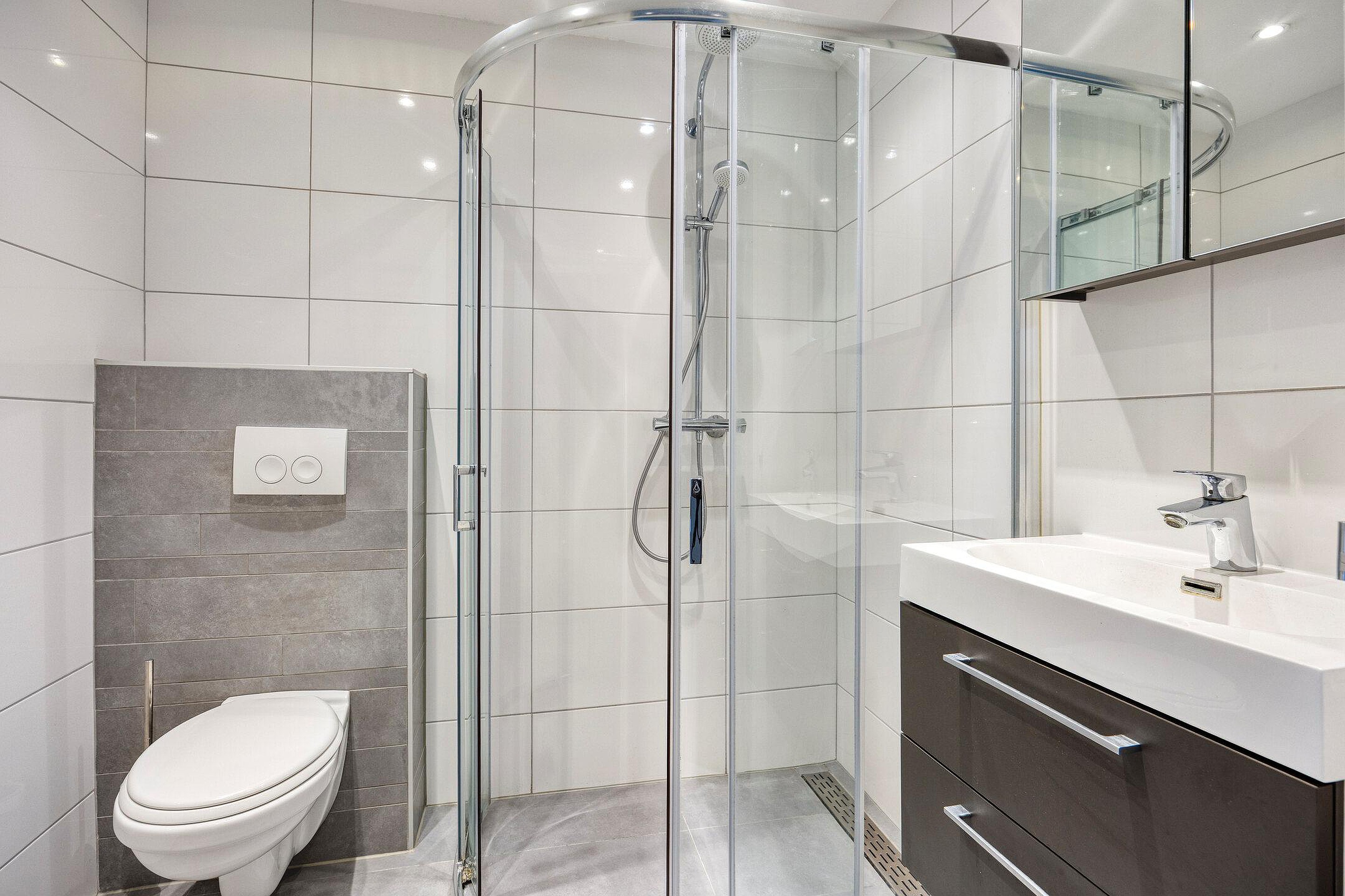 De geheel betegelde moderne badkamer is voorzien van inloopdouche, wastafelmeubel, hangend toilet en elektrische vloerverwarming. In de bergkast hangt de HR-combiketel en er bevindt zich een aansluiting voor de wasmachine.