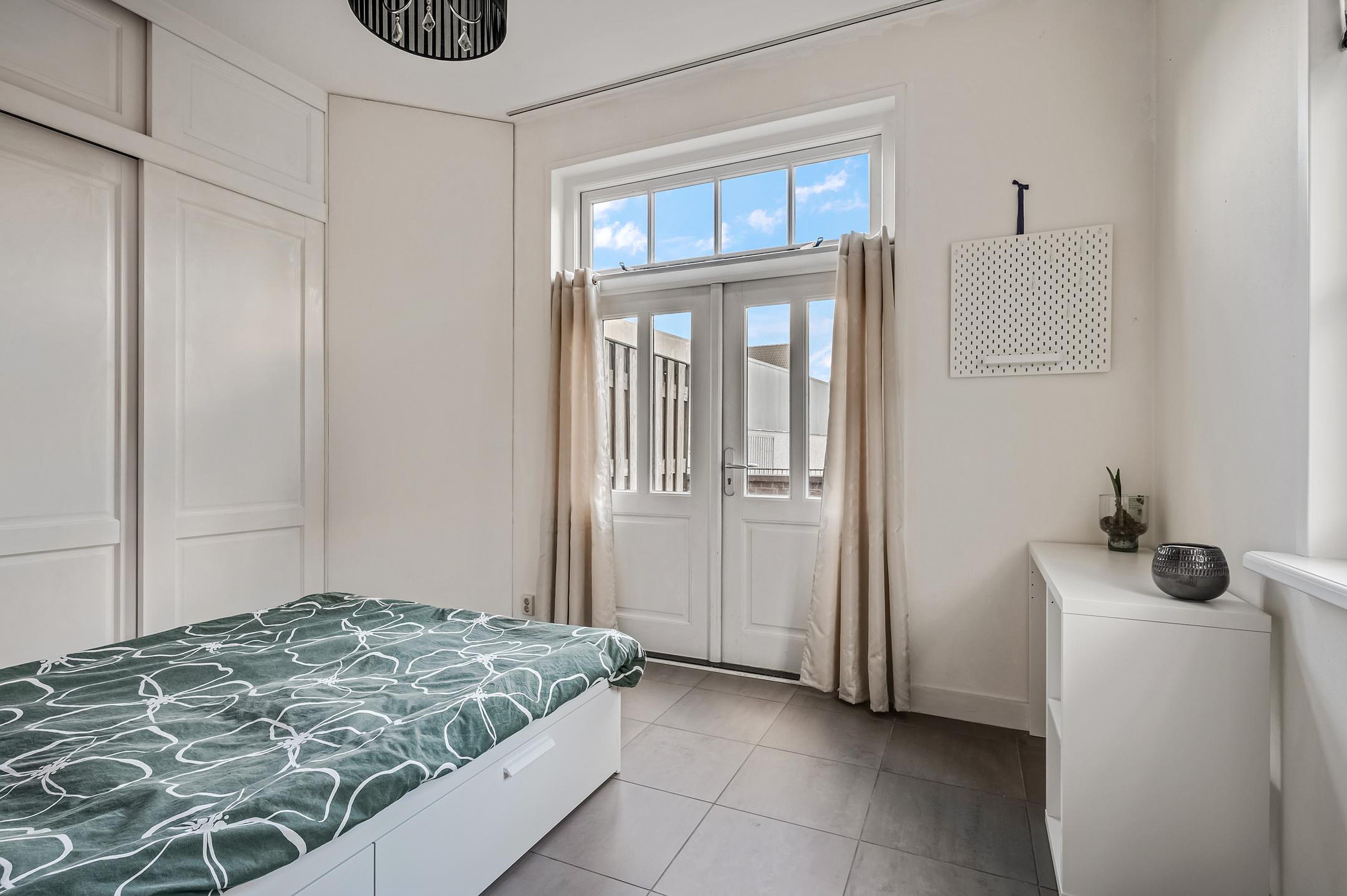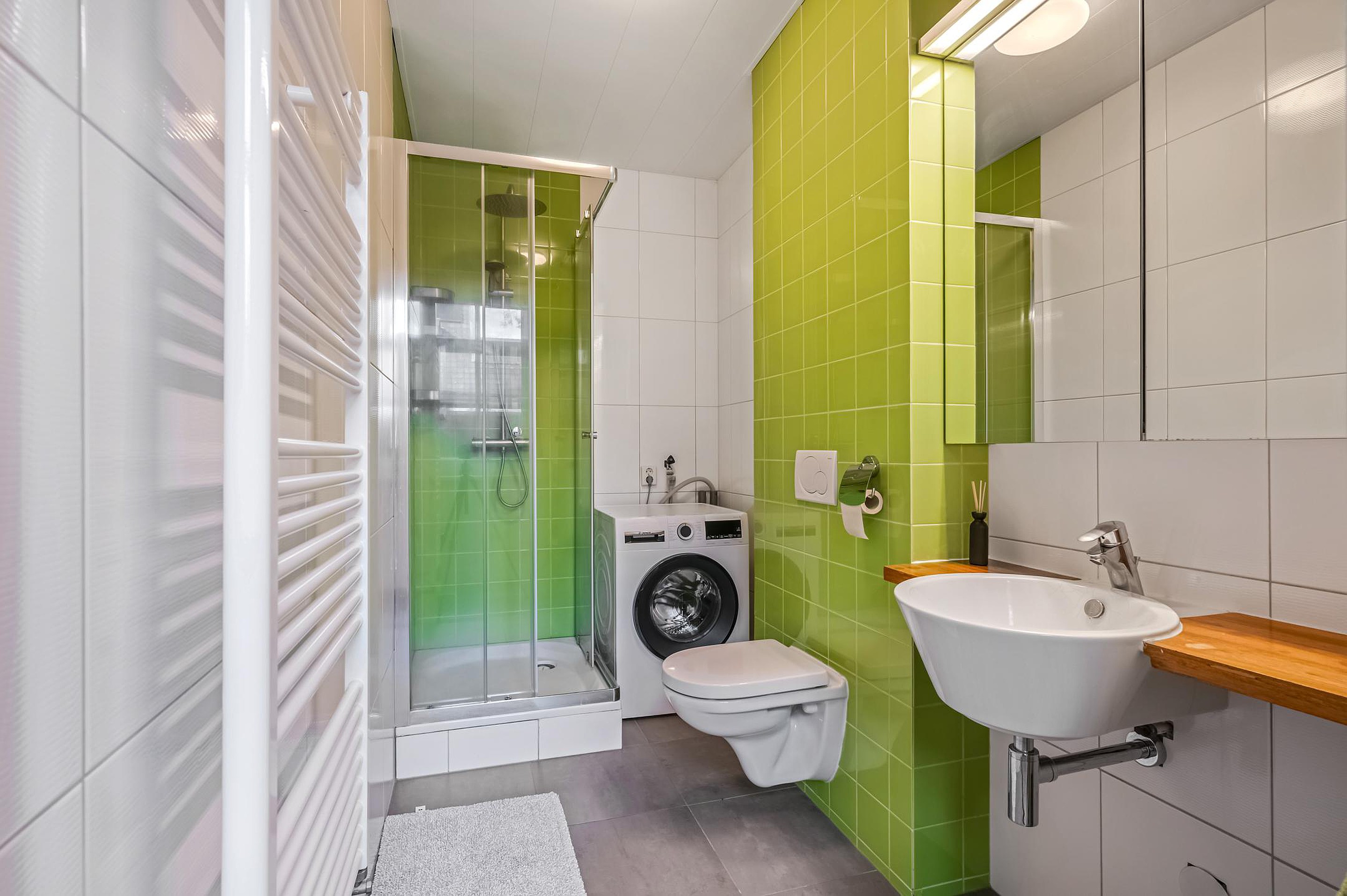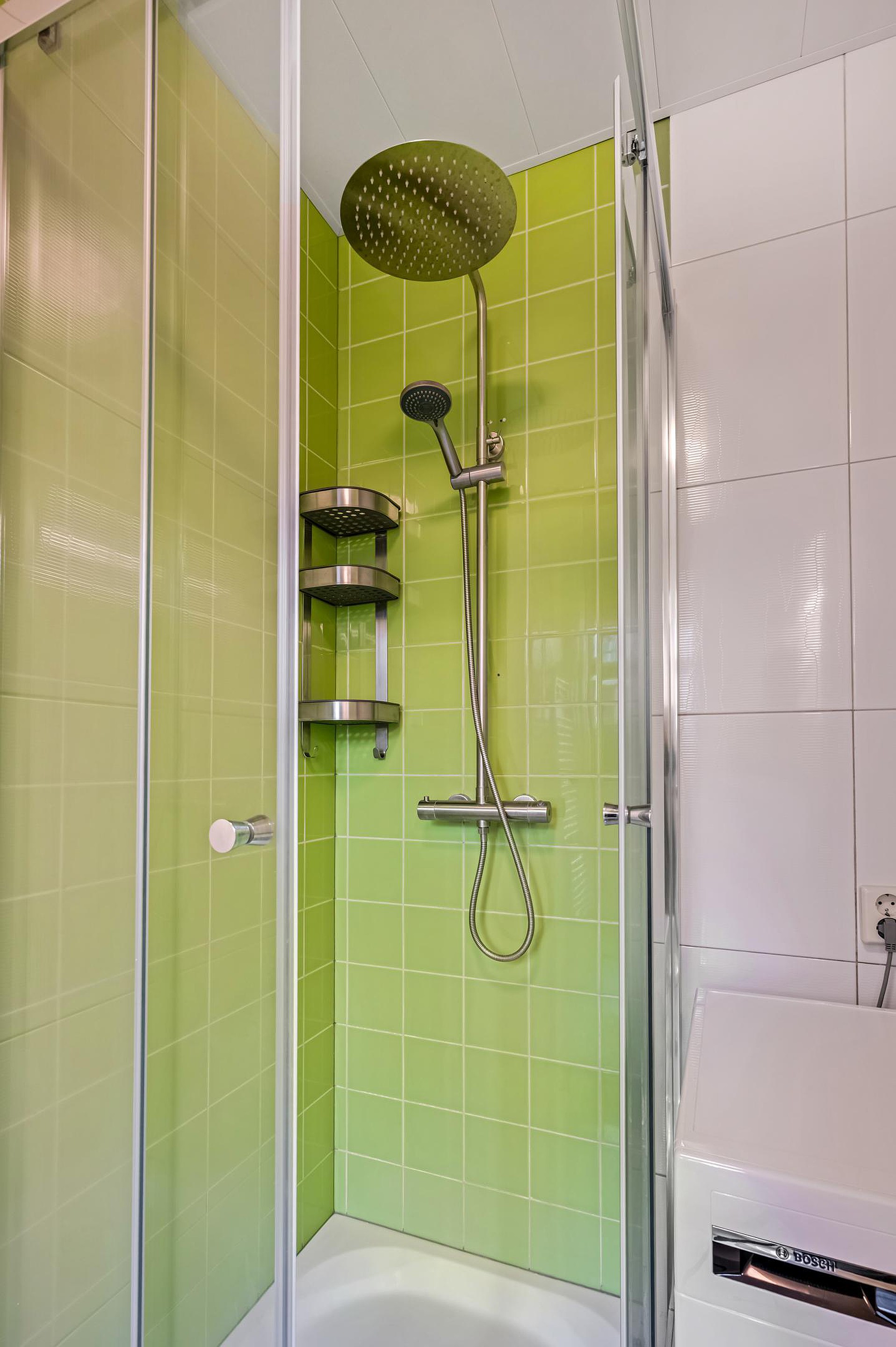 Aan de achterzijde ligt de slaapkamer met een hoge vaste kastenwand en openslaande deuren naar het terras. Ook de CV-ketel (2014) is netjes weggewerkt in de kastenwand. De naastgelegen badkamer is verzorgd en uitgerust met een douche, wastafelmeubel, spiegelkast, wandcloset, handdoekenradiator en regendouche met thermostaatkraan. Ook de wasmachine blijft achter.