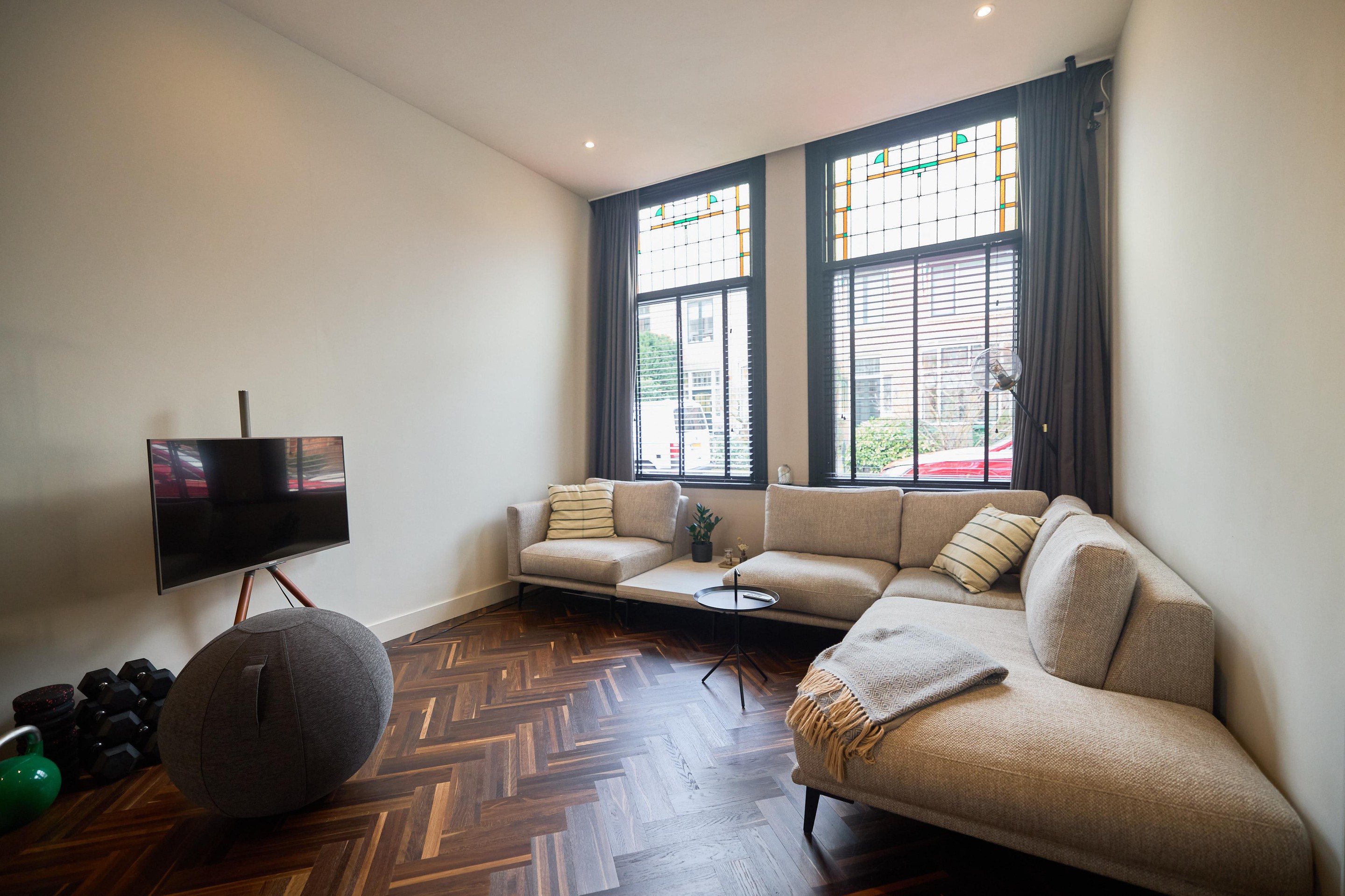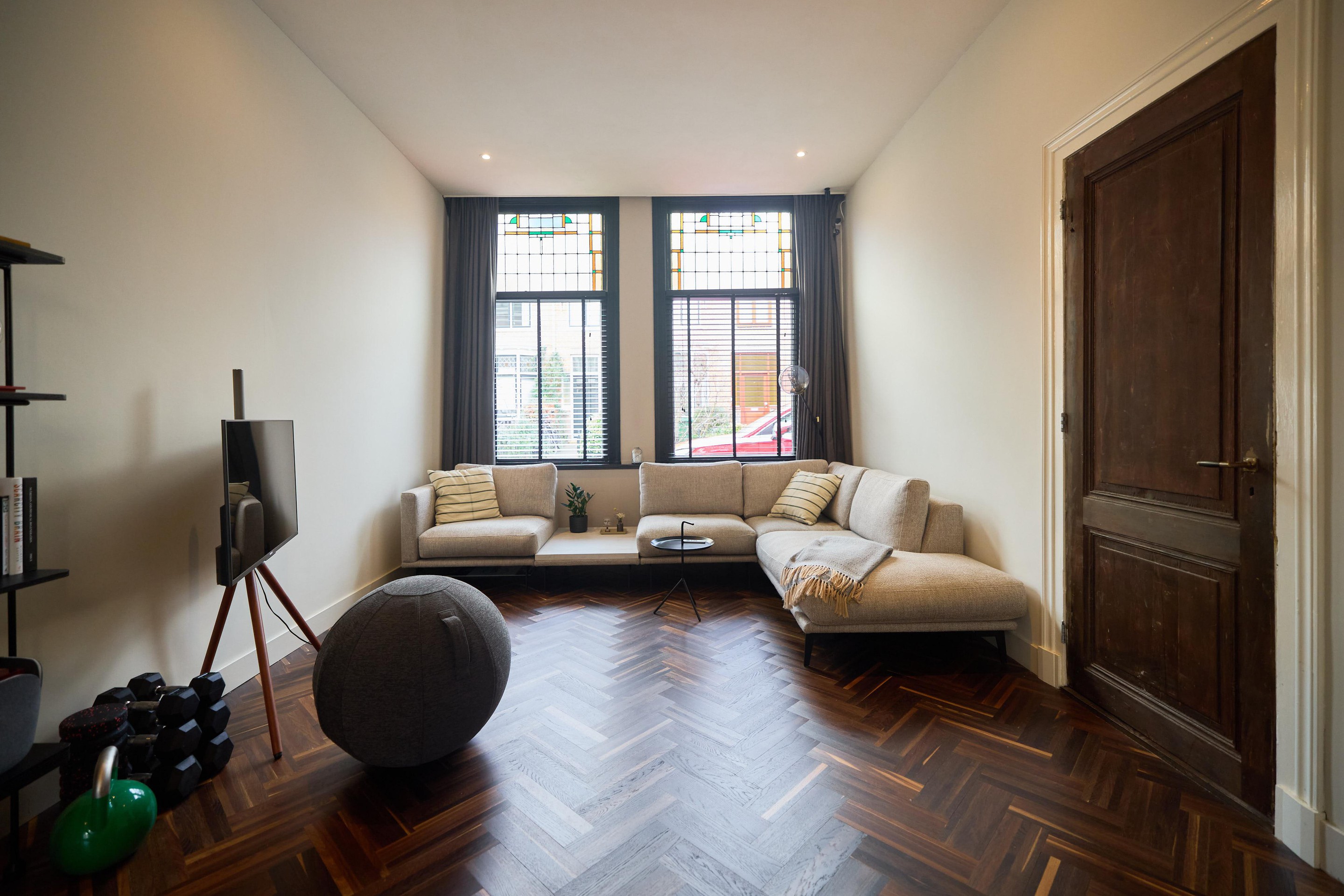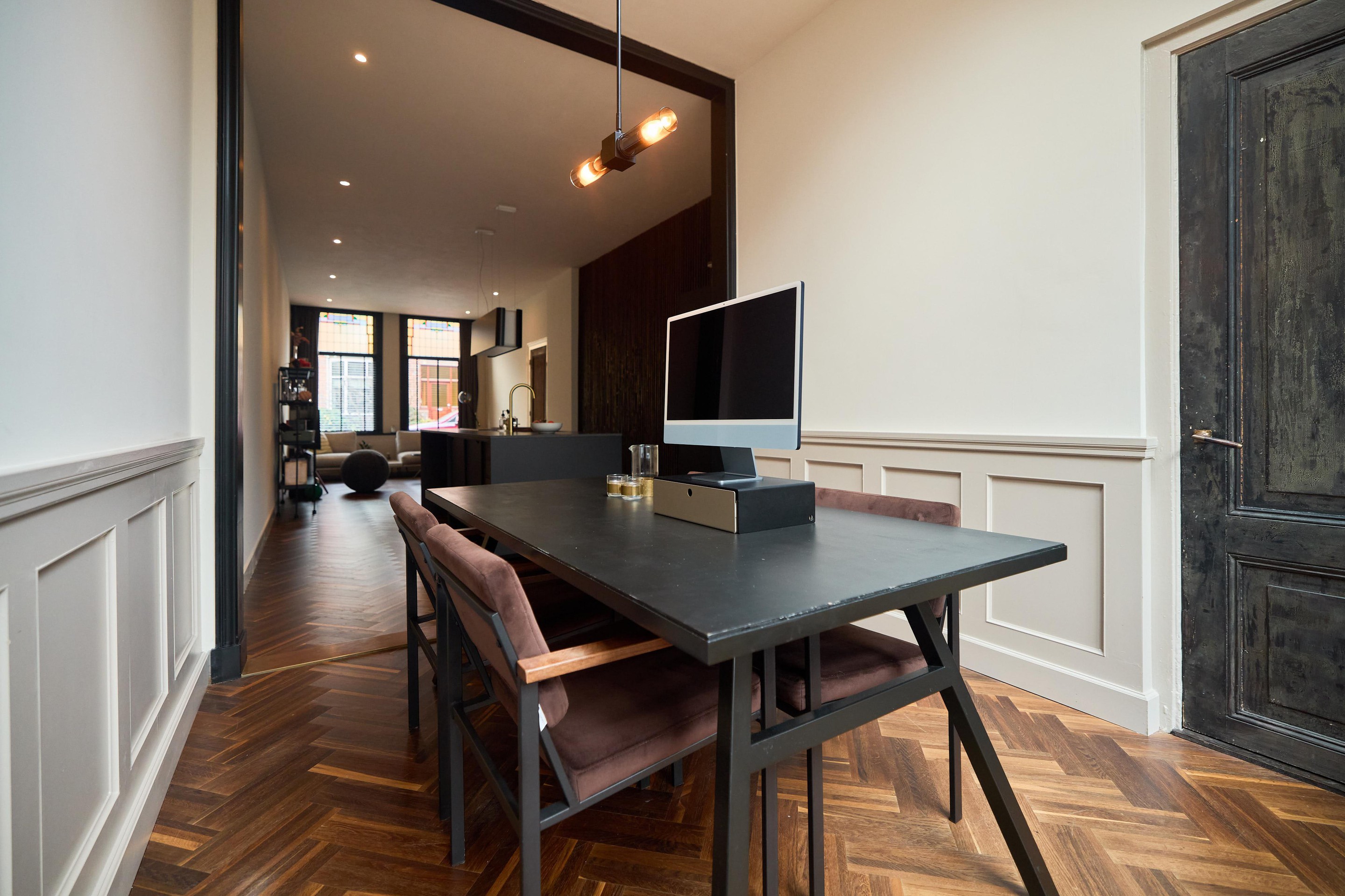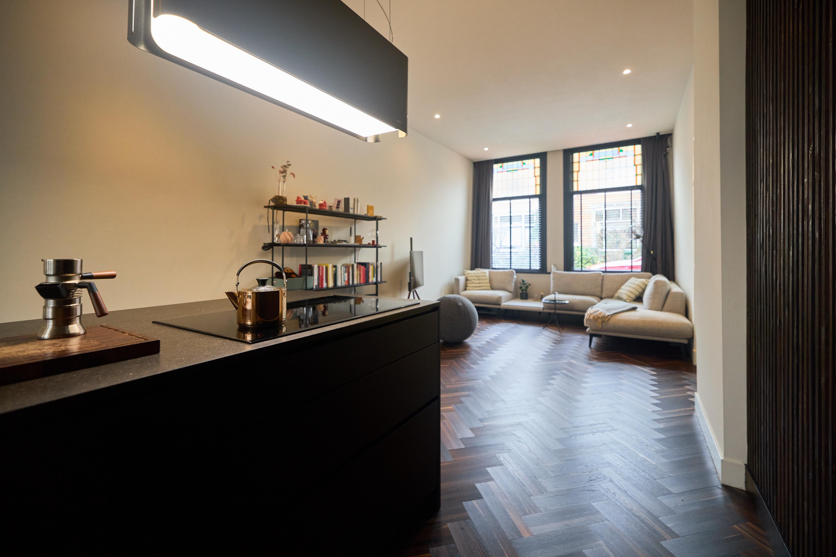Aan alles zie je dat deze benedenwoning tijdens de renovatie in 2019 met zorg en aandacht is vernieuwd. Het glas-in-lood springt direct in het oog, maar ook de subtiele details maken het verschil: schakelmaterialen van Buster + Punch, een slim voordeurslot, Ring deurbel en een Novy afzuigkap. Hier is bewust gekozen voor kwaliteit en duurzaamheid.