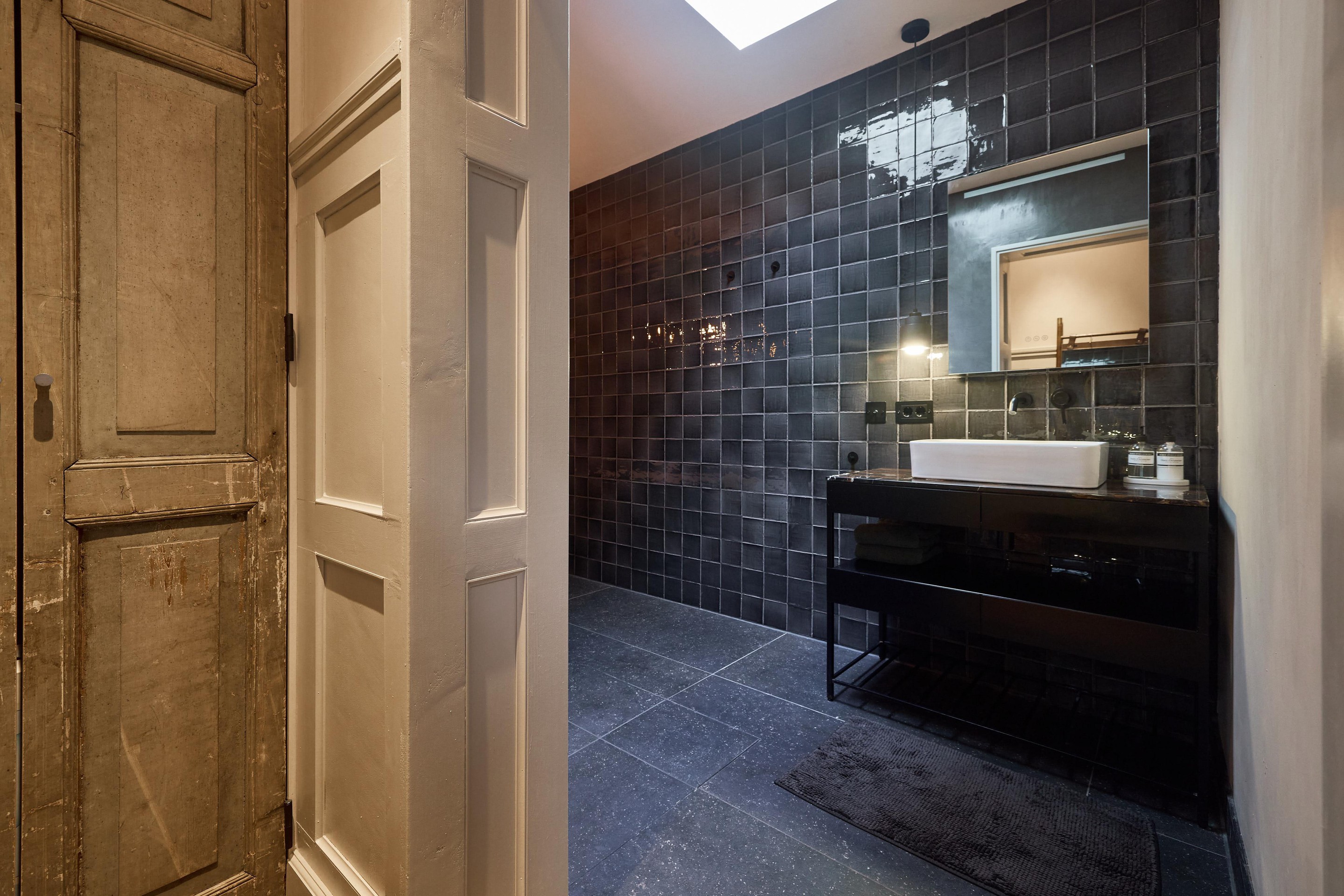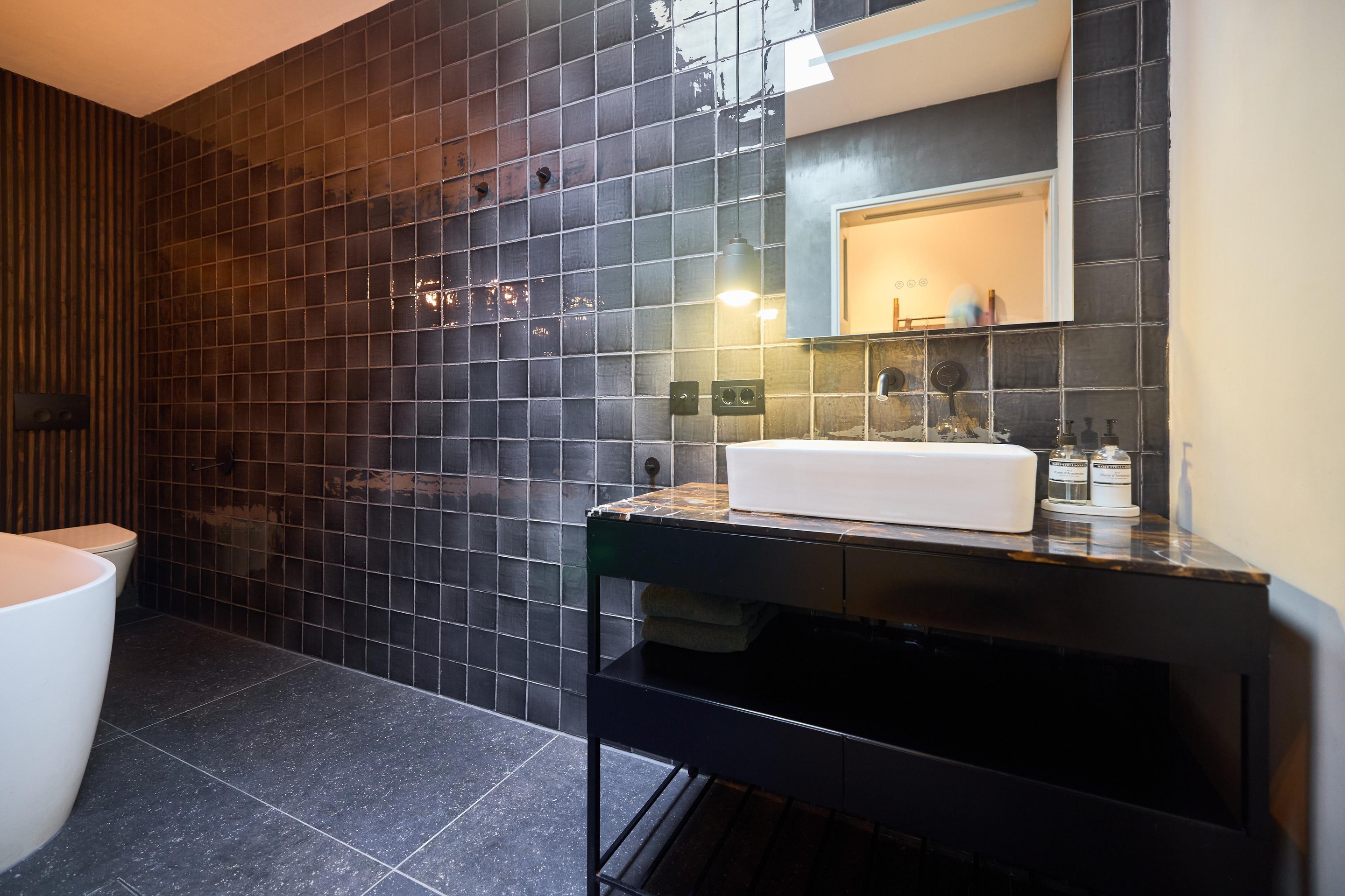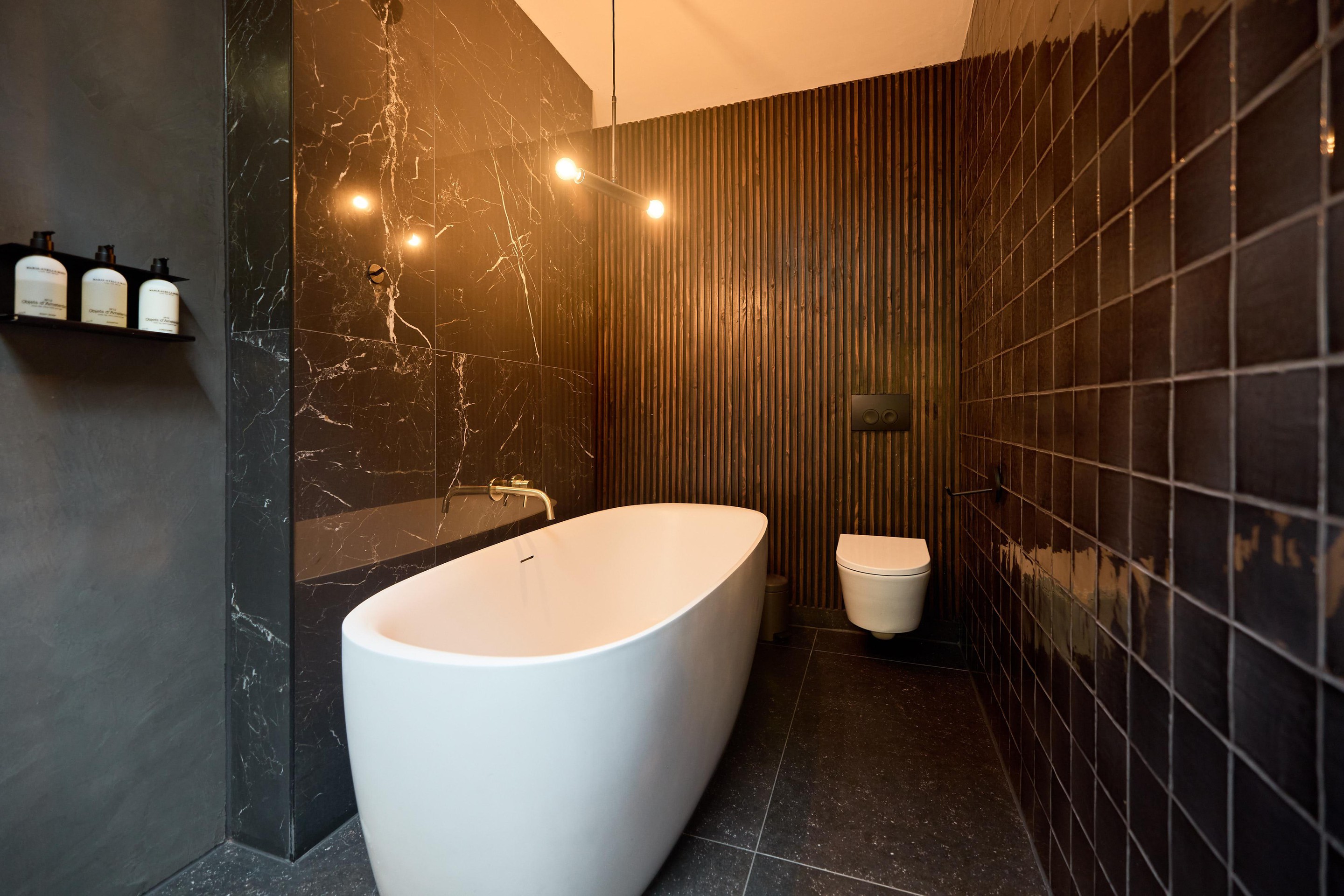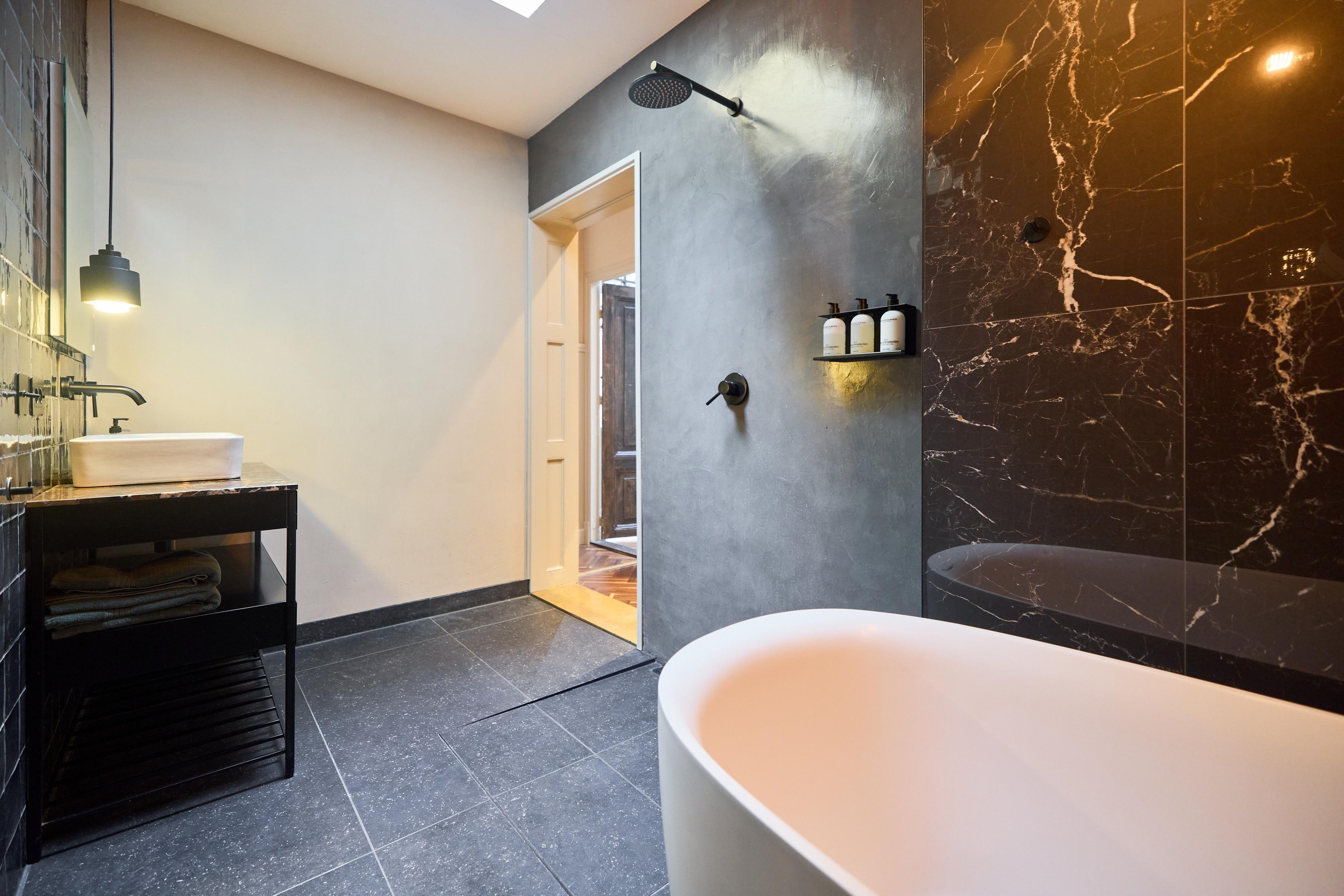 - Badkamer met ligbad, inloopdouche en lichtkoepel