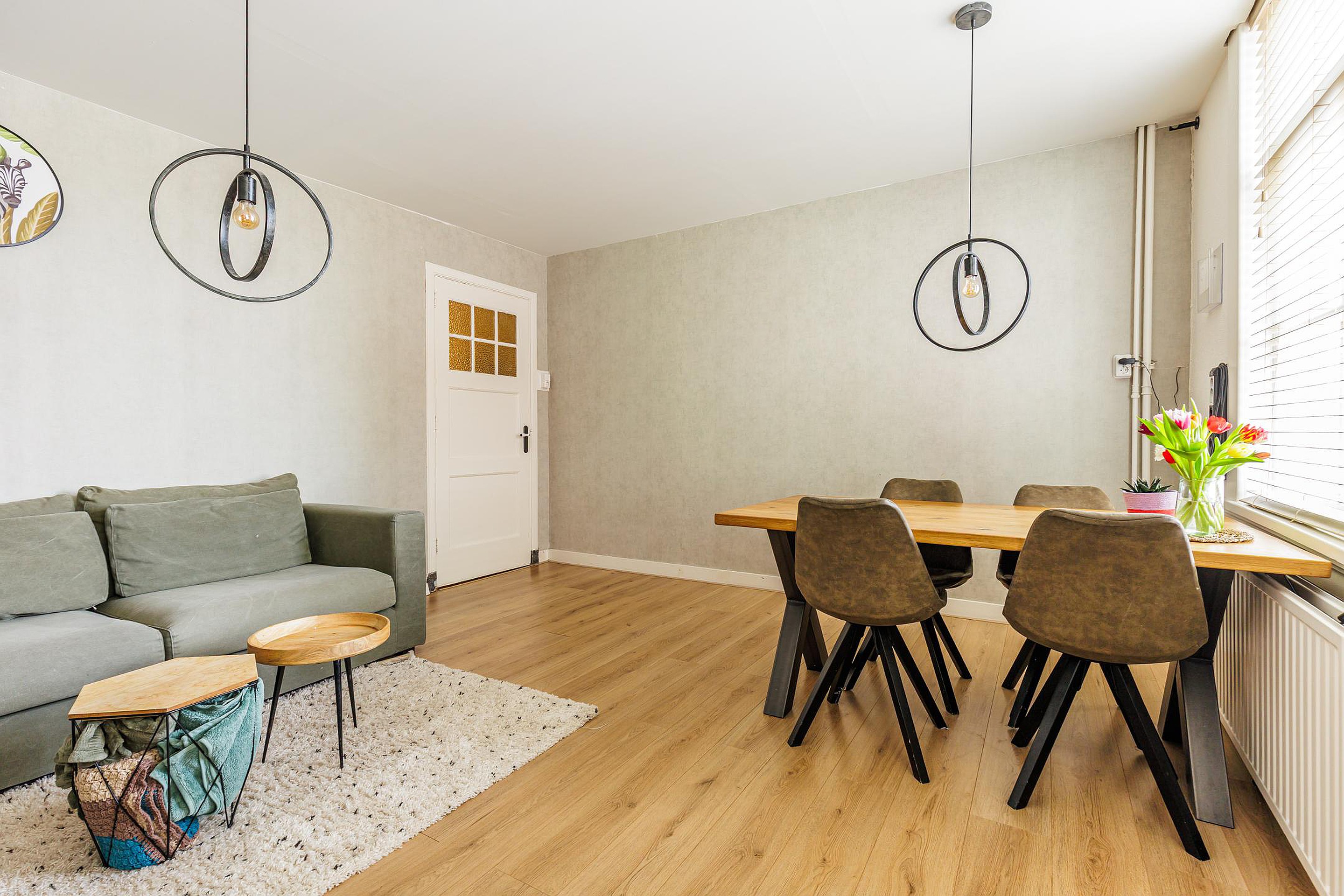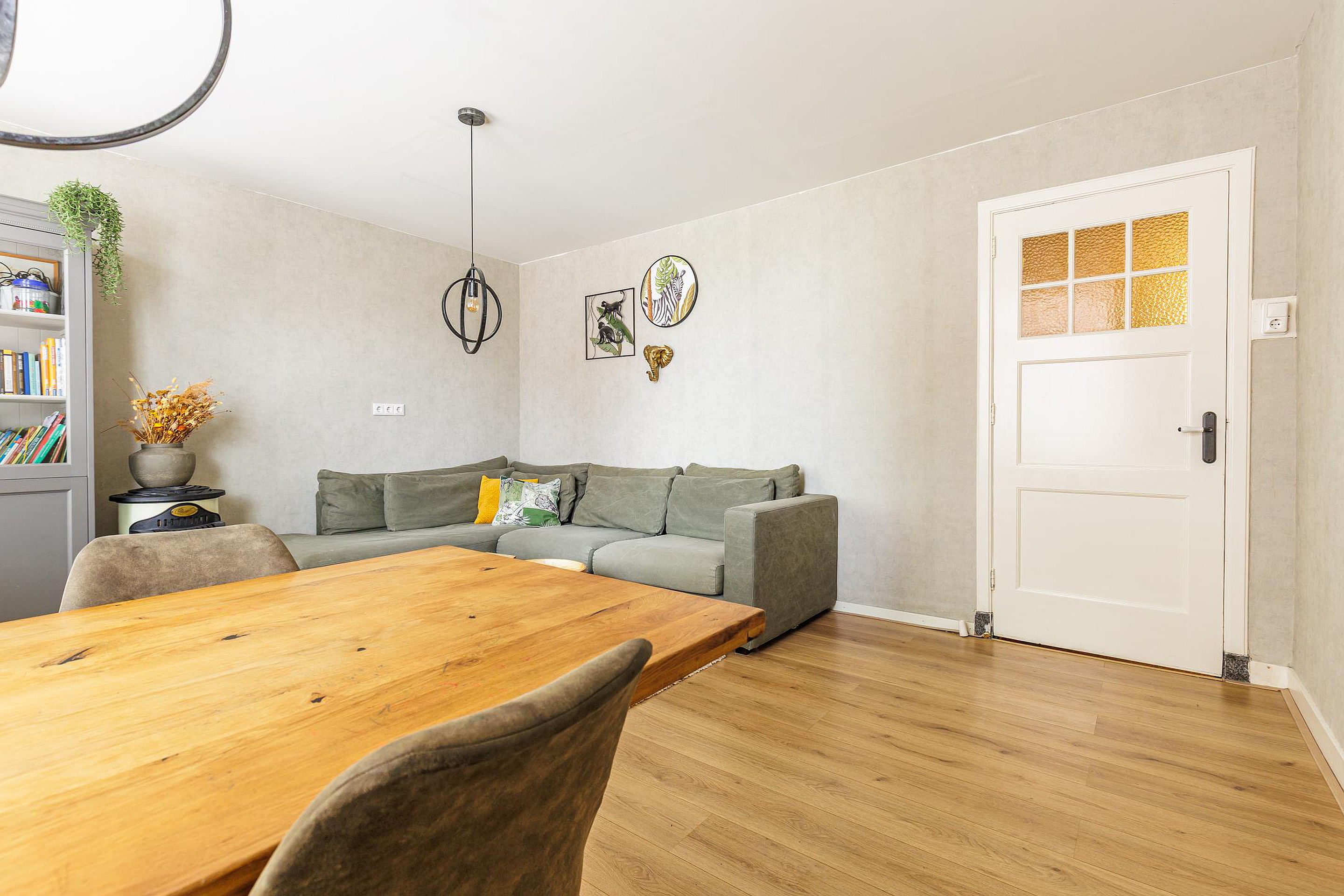 De woonkamer is royaal en prettig licht dankzij de grote raampartijen. De wanden zijn strak gestuct en de vloer is afgewerkt met laminaat, wat zorgt voor een verzorgde en moderne uitstraling binnen het karaktervolle pand. Hier is volop ruimte voor een comfortabele zithoek én een eettafel.
