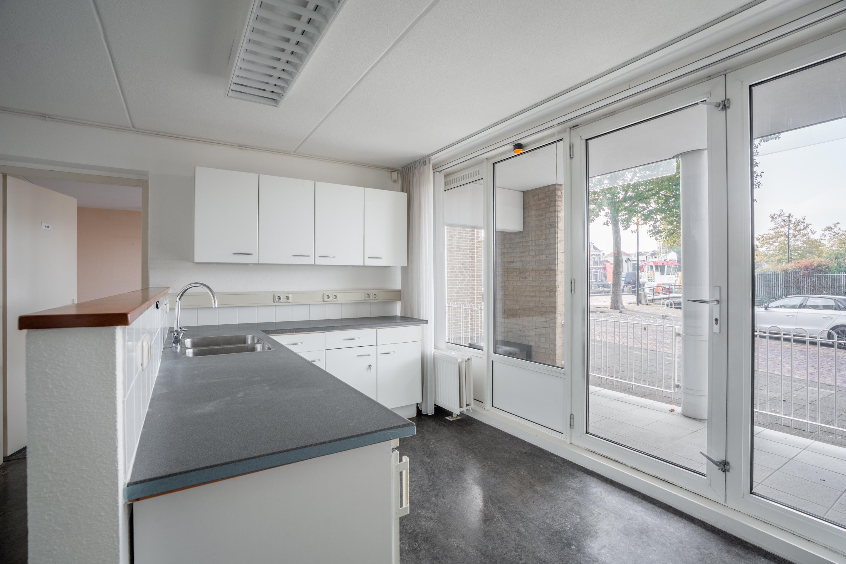 De keuken vormt het kloppende hart van de woning, met een karakteristieke hoge balie en directe toegang tot de royale woonruimte (voorheen praktijkruimte).