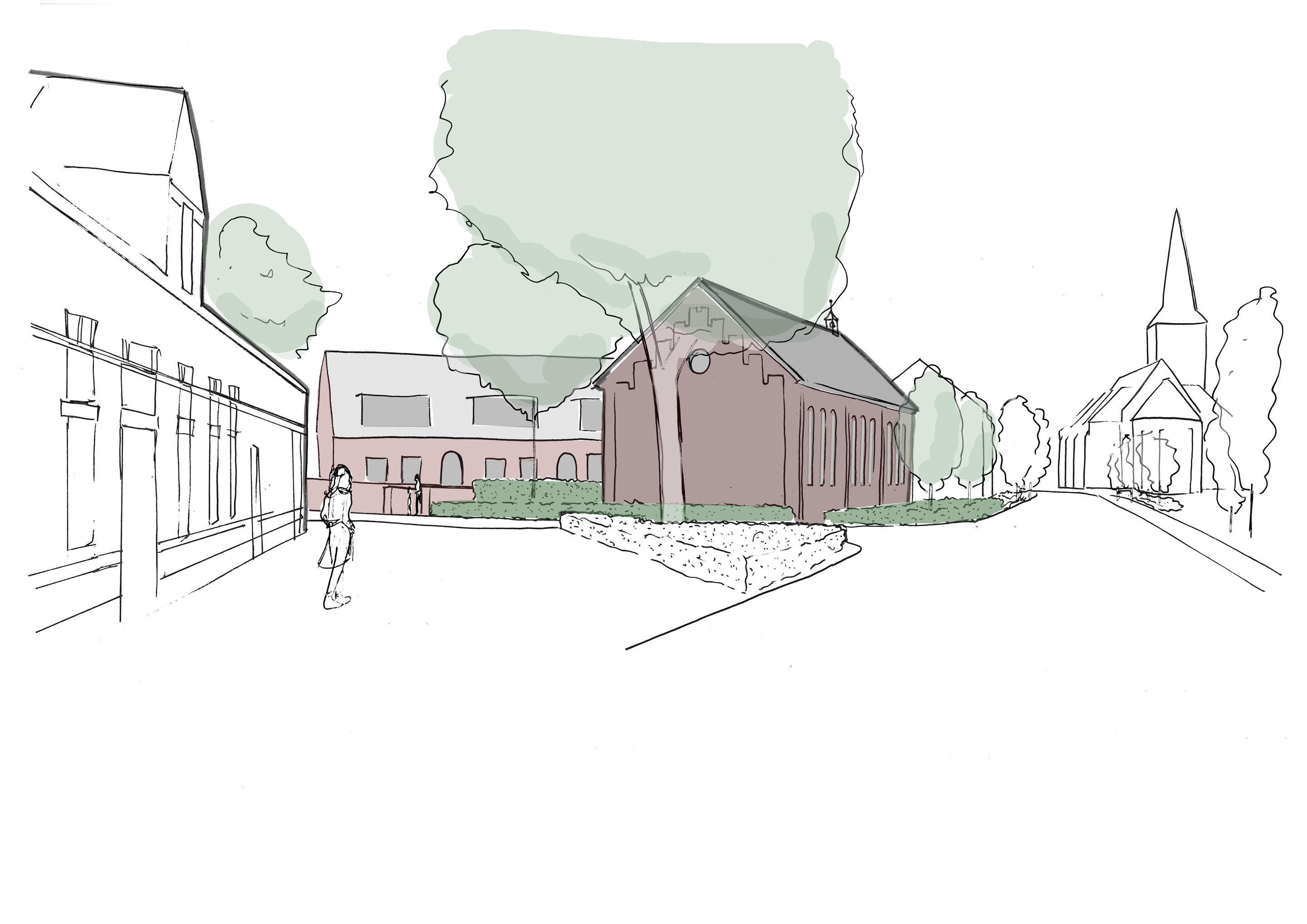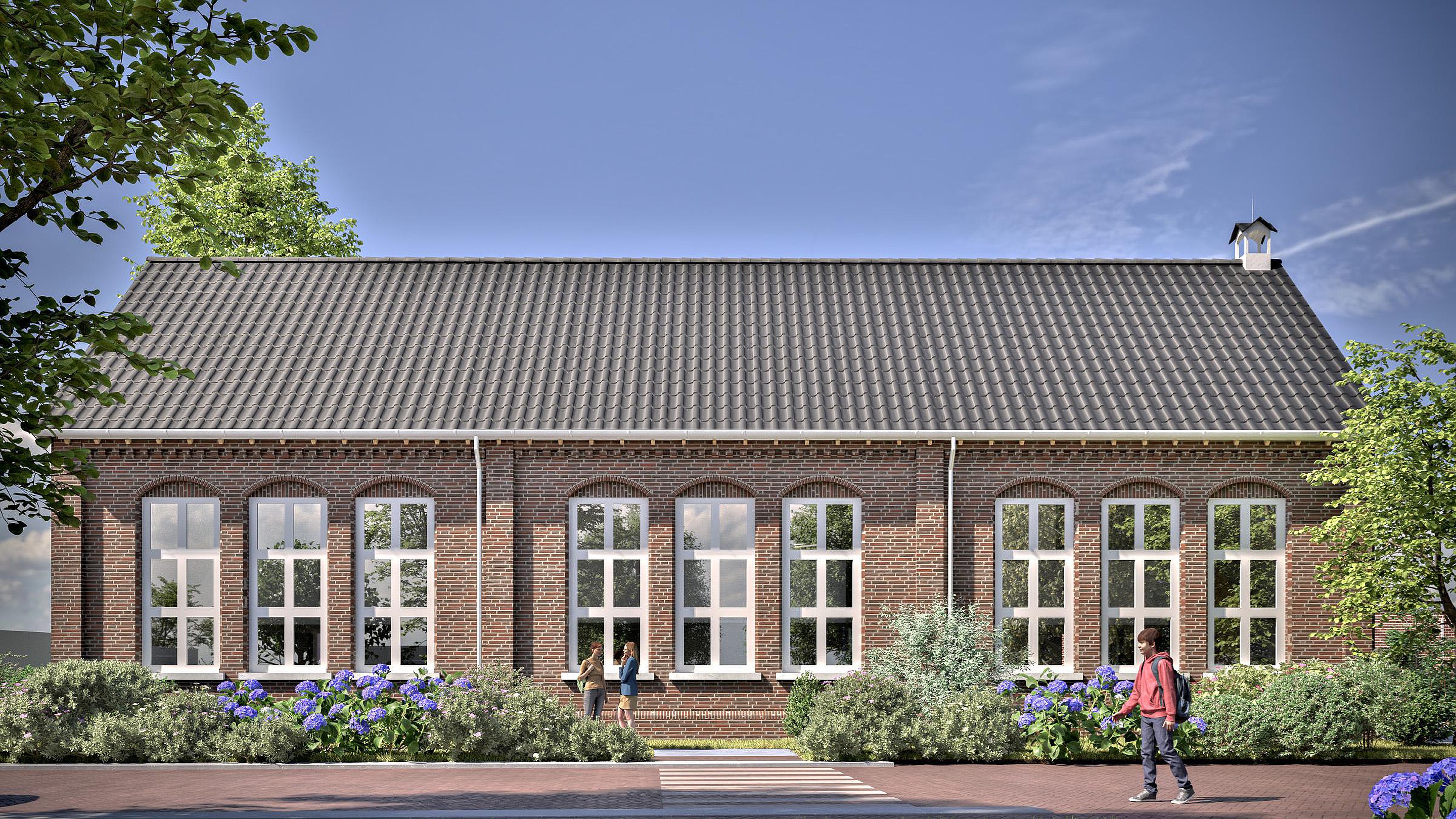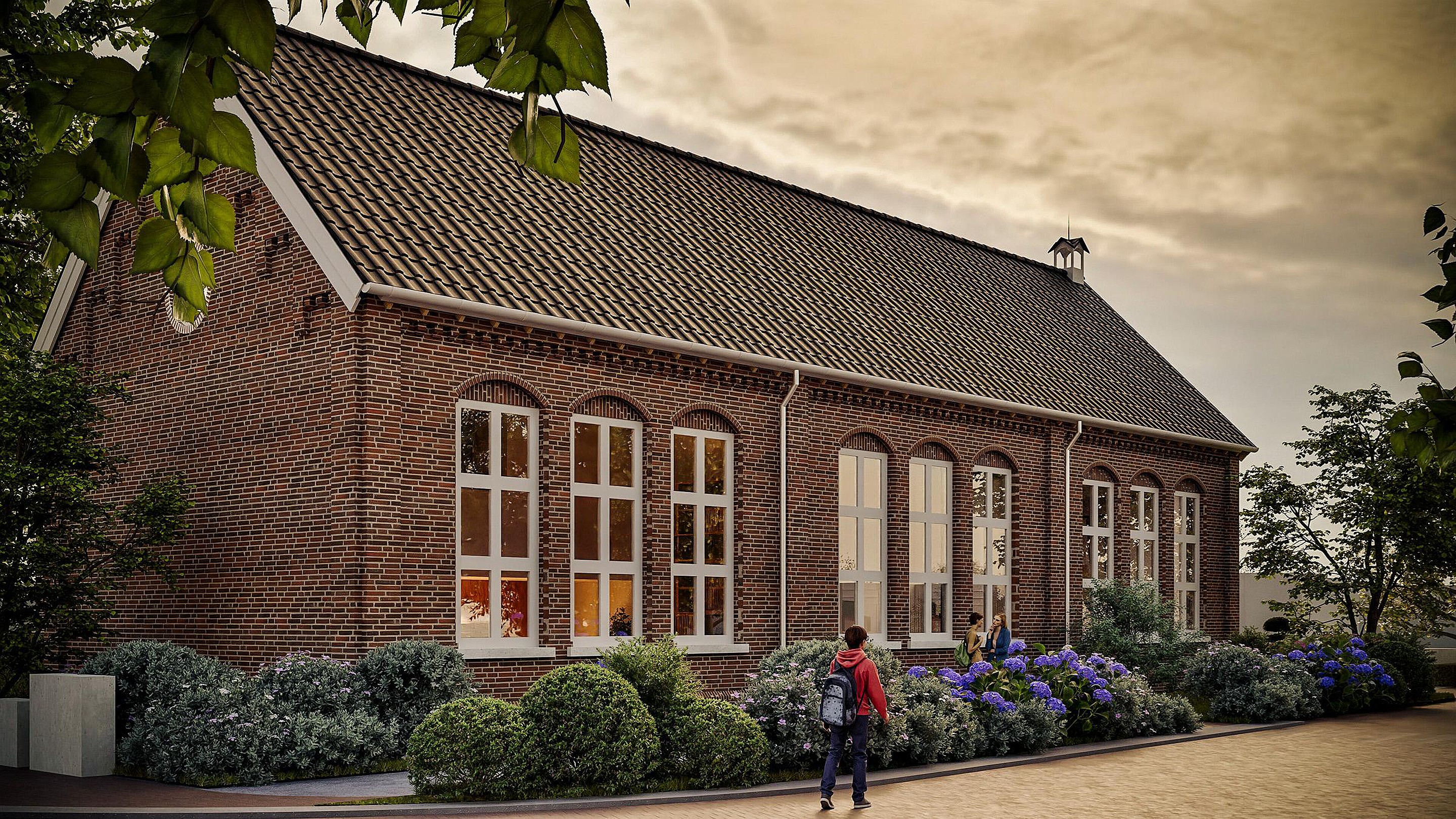 De karakteristieke elementen van het schoolgebouw blijven zorgvuldig behouden: de metselwerkbogen, het klokkentorentje en de authentieke raampartijen. Het voormalige schoolplein wordt een groen woonhofje waar bewoners elkaar ontmoeten. Met de kerk om de hoek en voorzieningen op loopafstand combineer je dorpse rust met alle gemakken binnen handbereik.