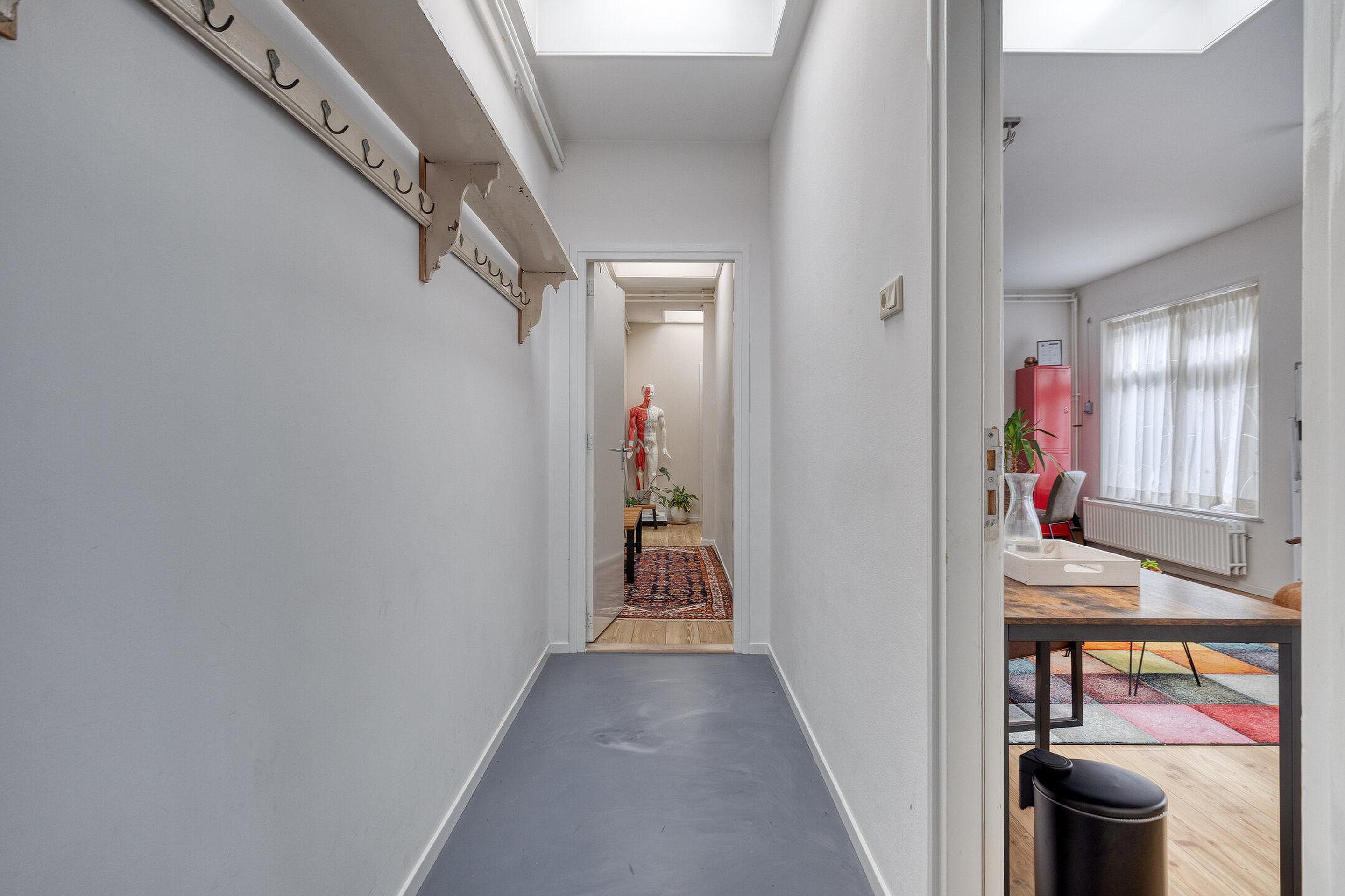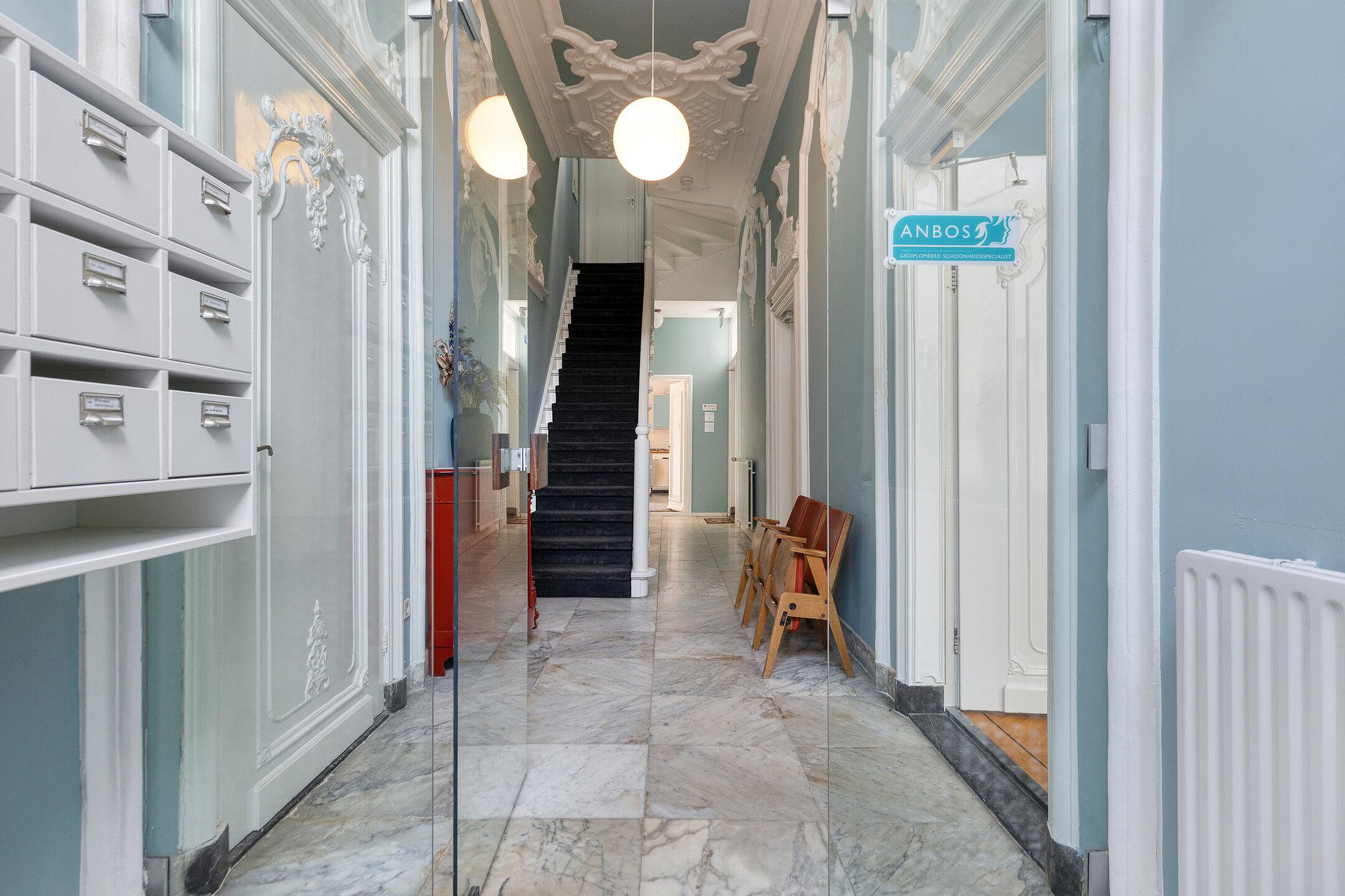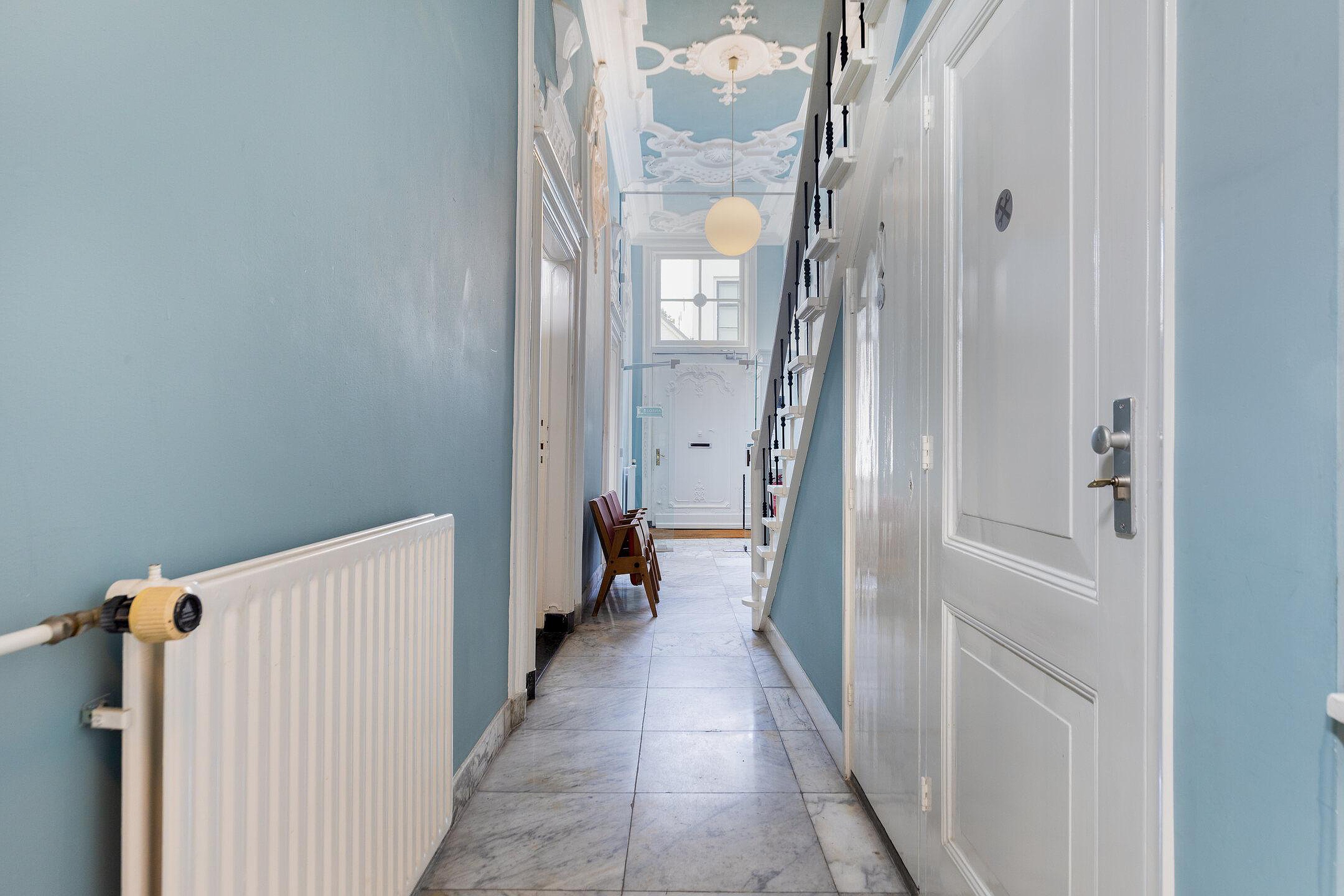 Begane grond De indeling is als volgt: gezamenlijke entree op de begane grond, voorportaal met brievenbussen, door de hoge glazen deur kom je in de hal met trap en hoog plafond met schitterende ornamenten. In de hal is een toilet en een klein keukenblokje.