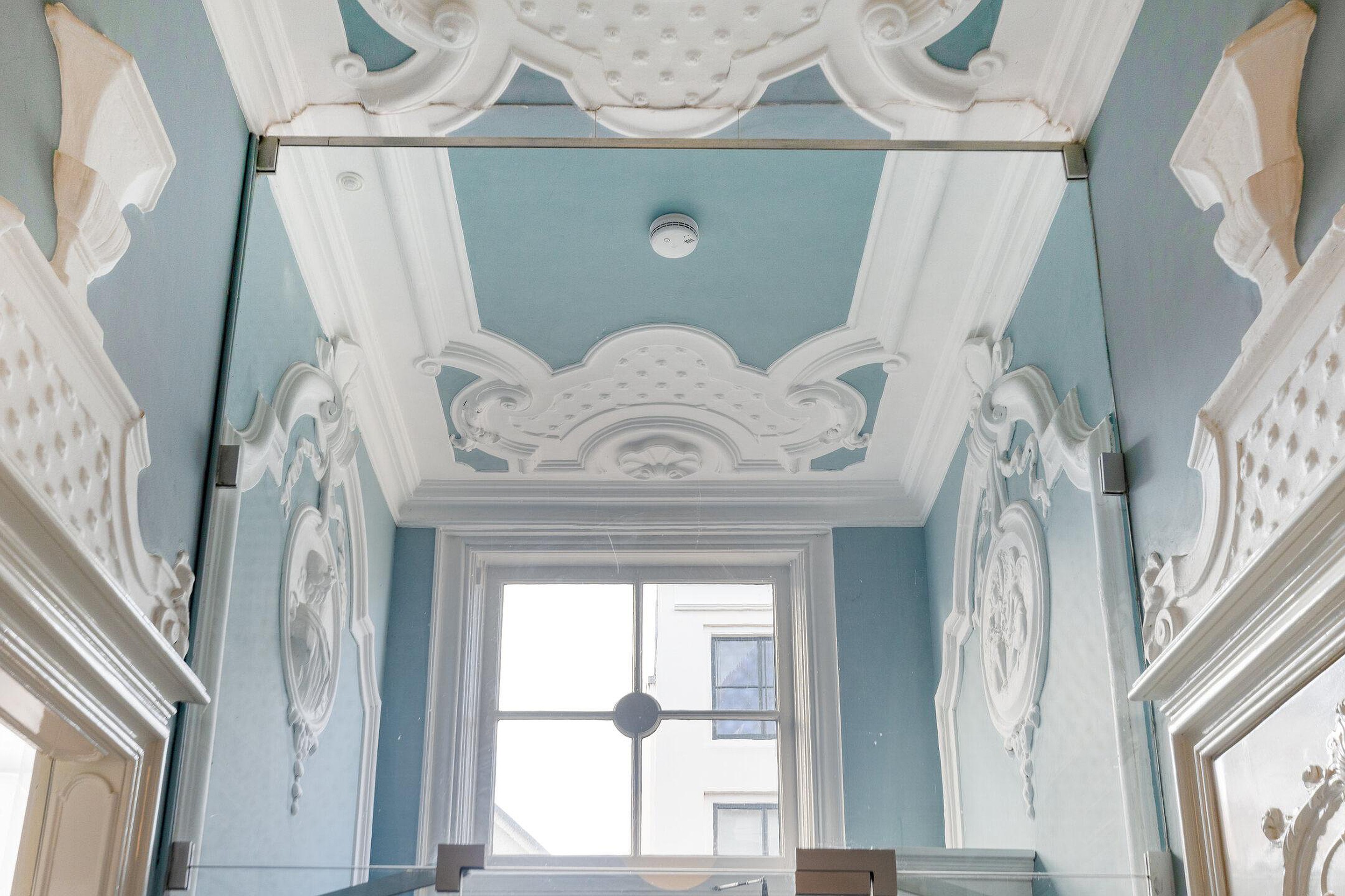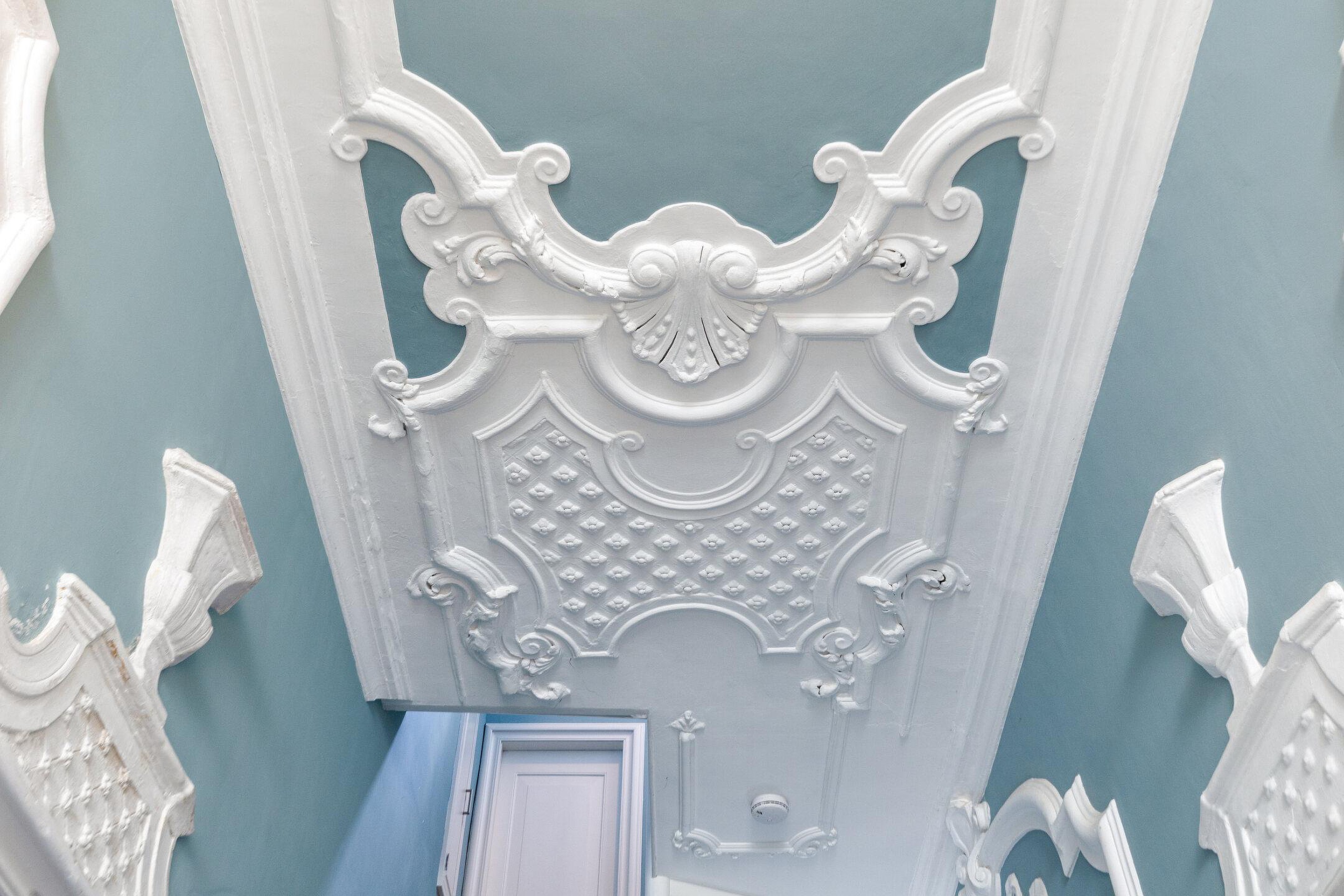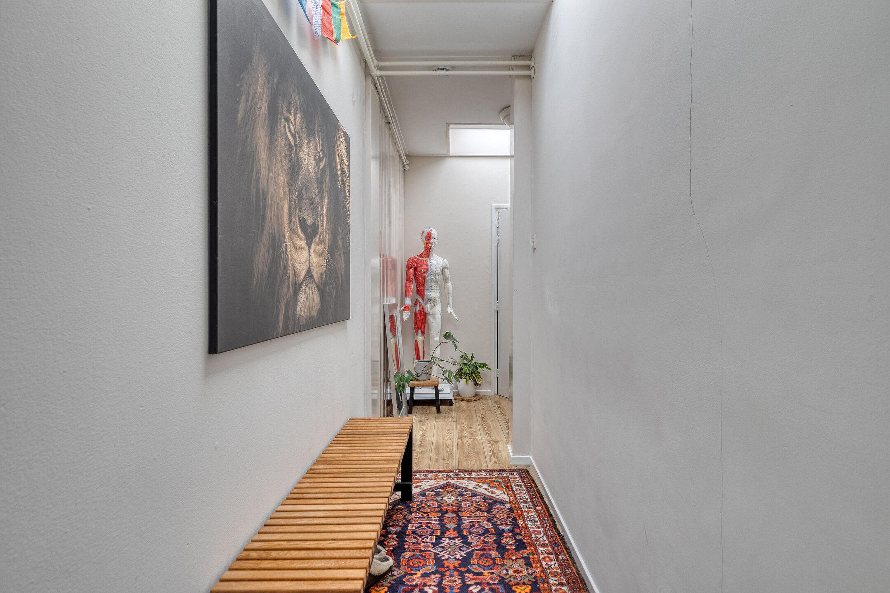 Begane grond De indeling is als volgt: gezamenlijke entree op de begane grond, voorportaal met brievenbussen, door de hoge glazen deur kom je in de hal met trap en hoog plafond met schitterende ornamenten. In de hal is een toilet en een klein keukenblokje.