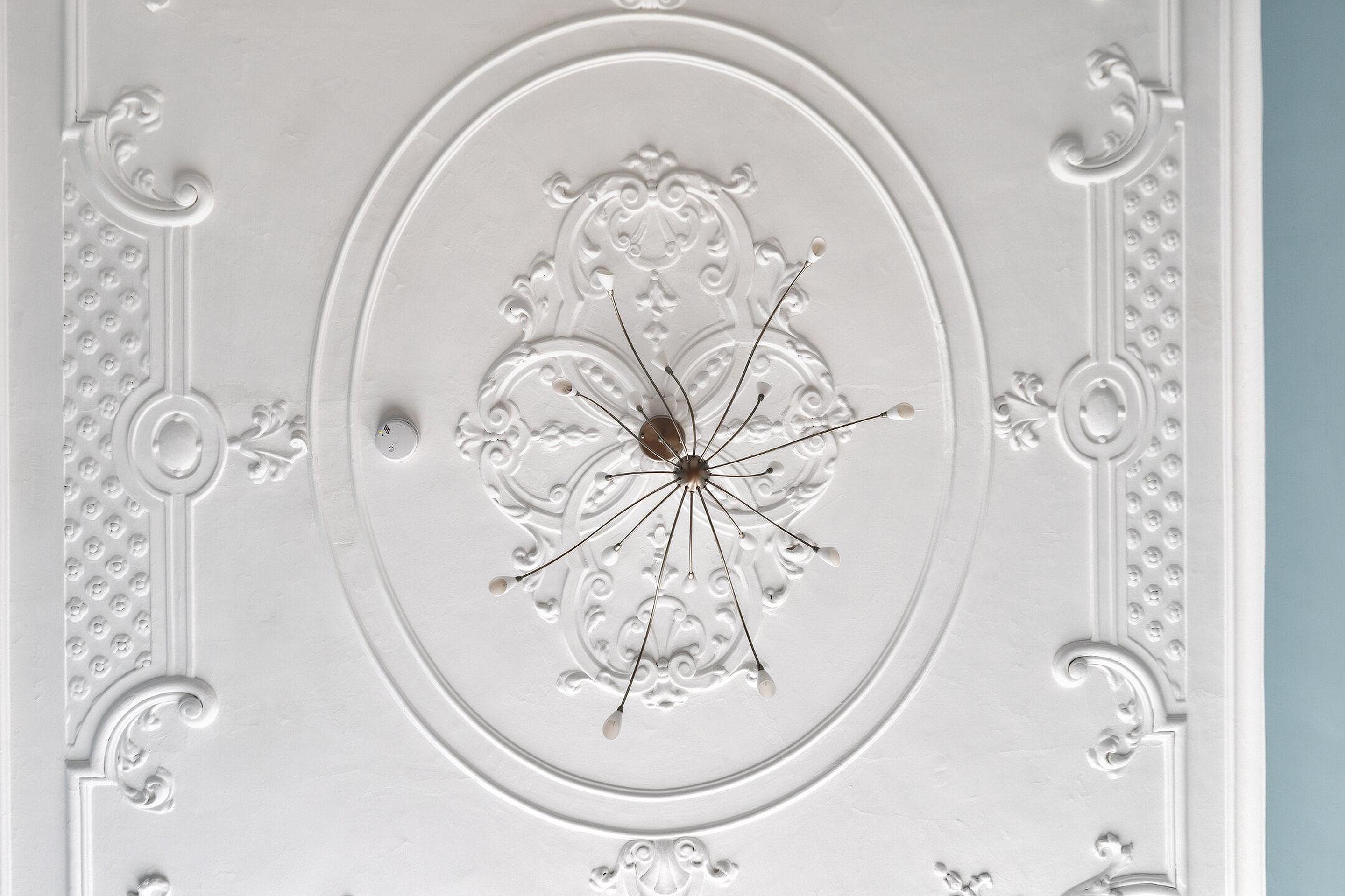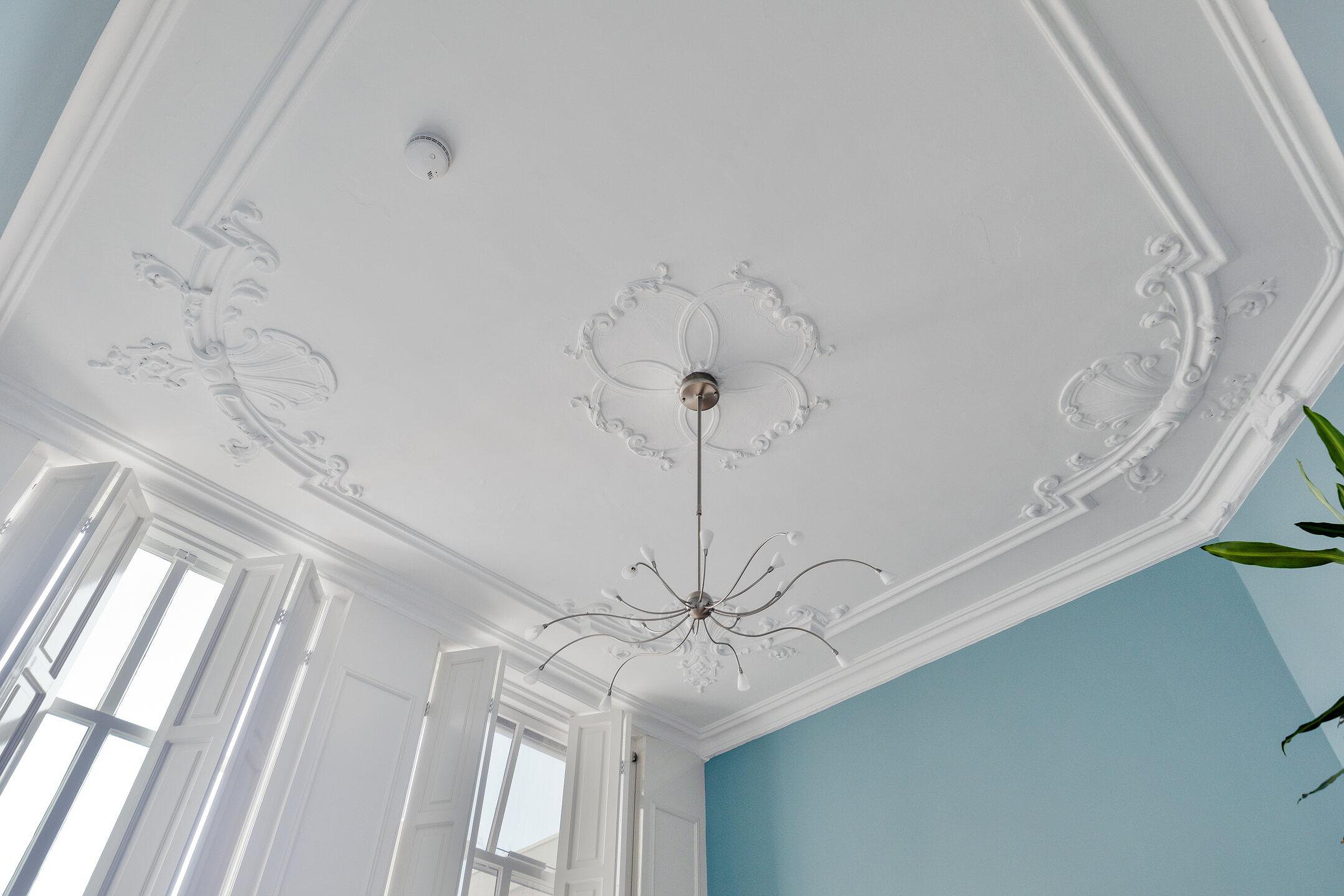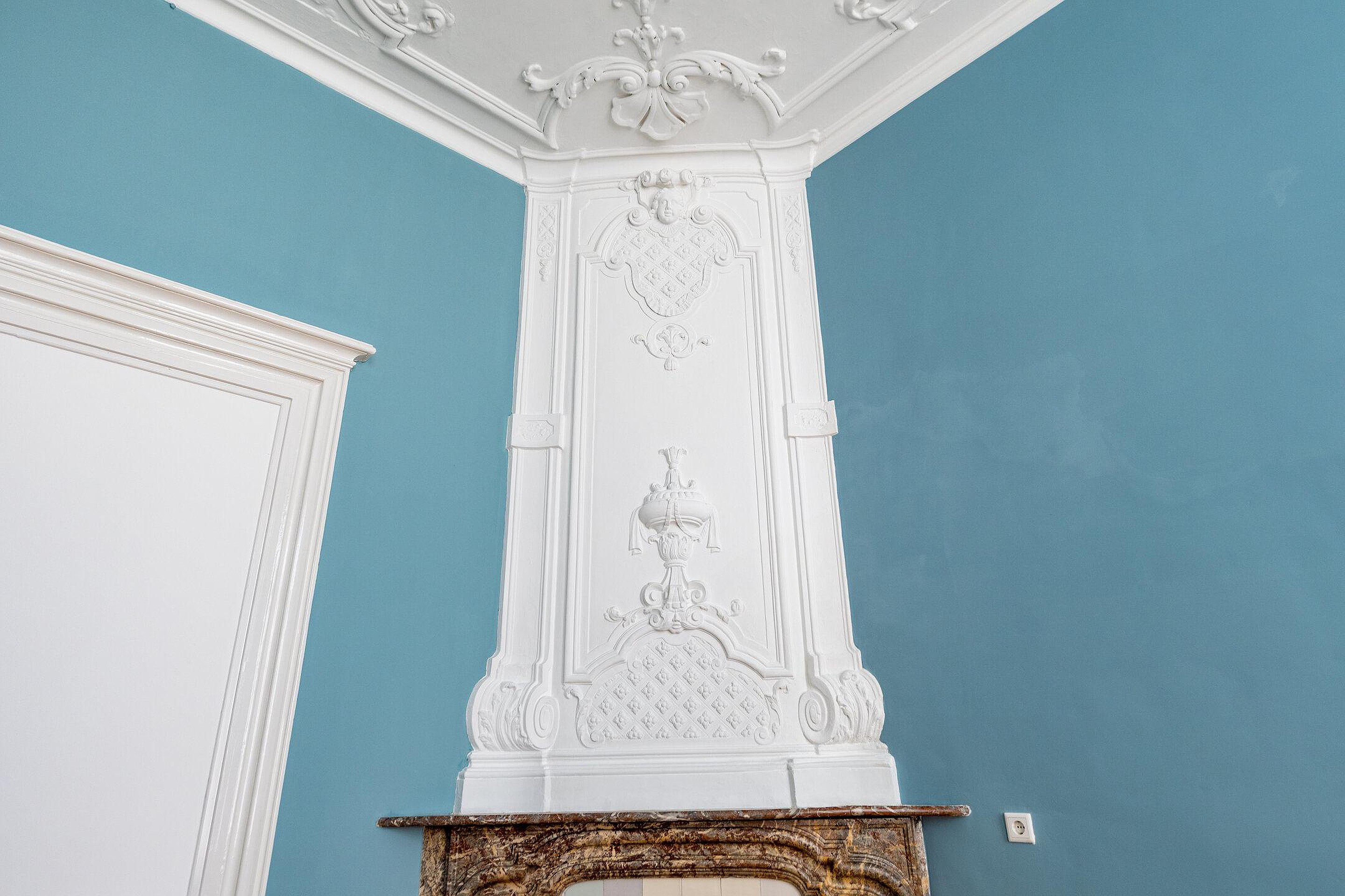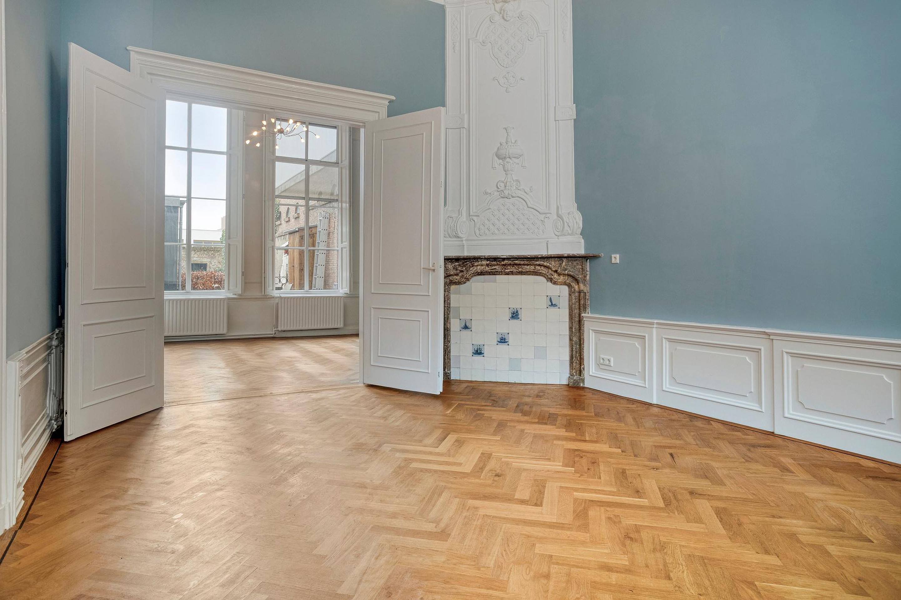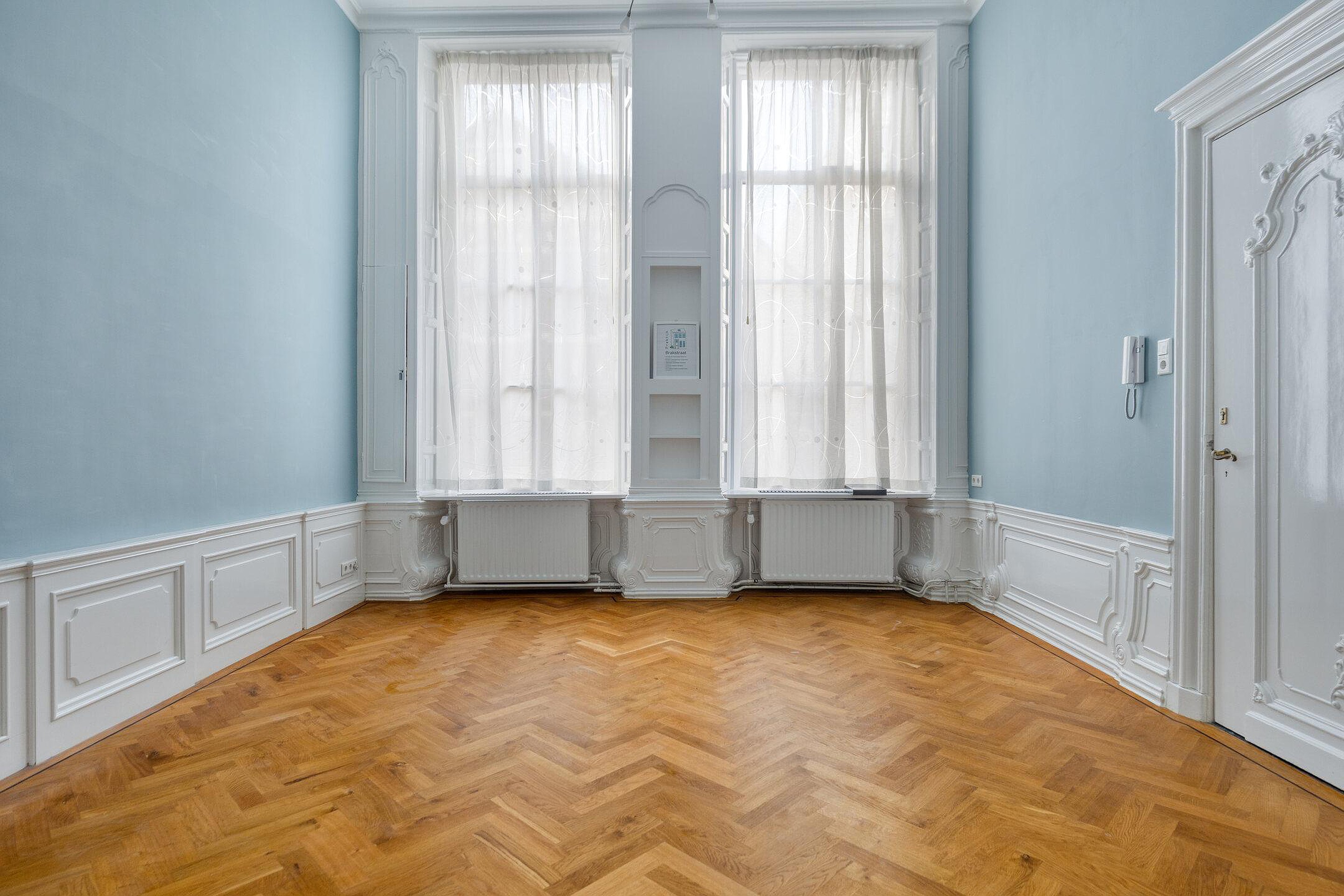 Aan de voorzijde een prachtige kamer met hoge plafonds, parketvloer en opnieuw fraaie ornamenten, met en-suite een sfeervolle achterkamer. In deze ruimte een keuken die eventueel eenvoudig te verwijderen is.