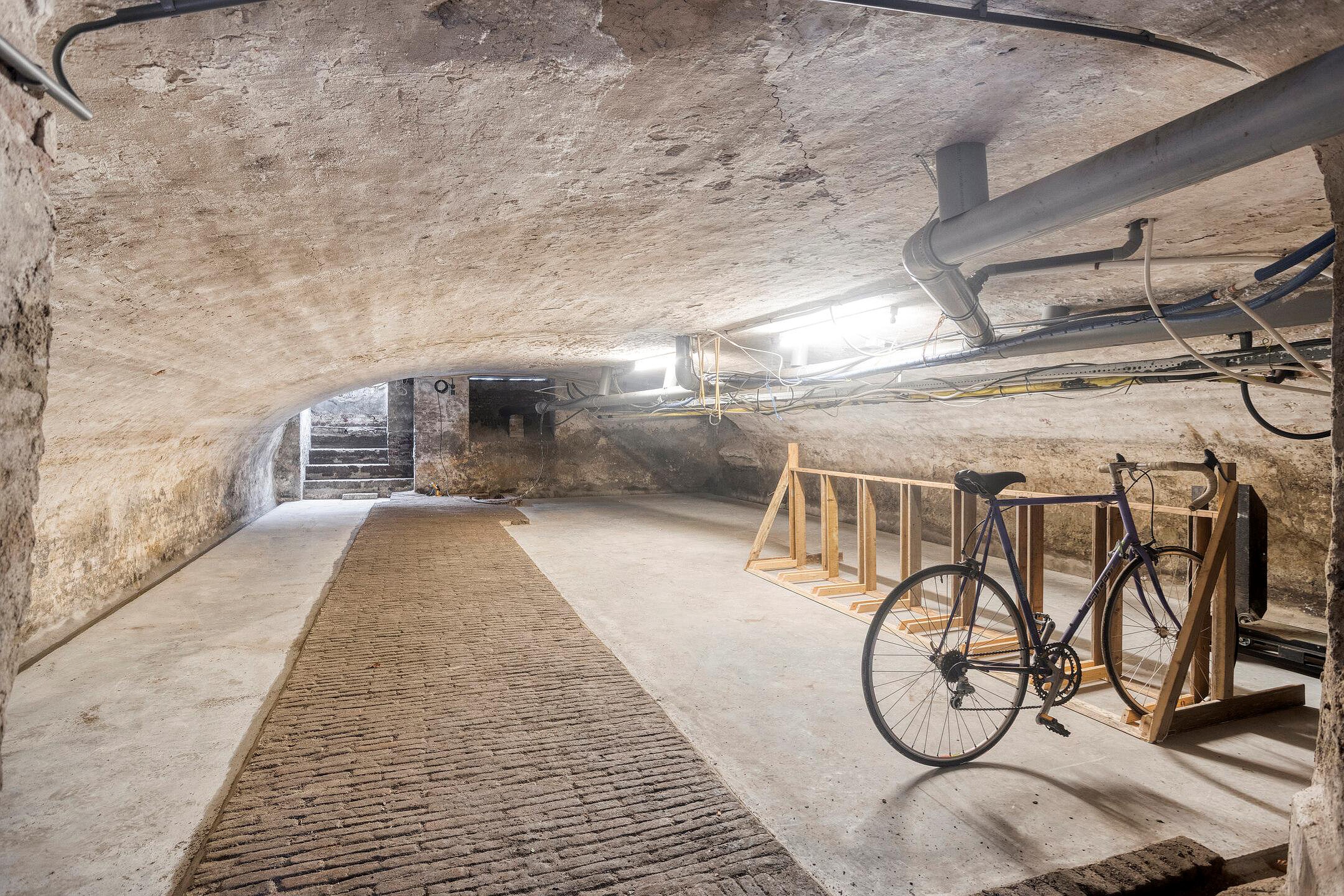 Er is in de kelder (met prachtig gewelf) een algemene gezamenlijke berging, daar kun je prima je (race)fiets of surfplank stallen.