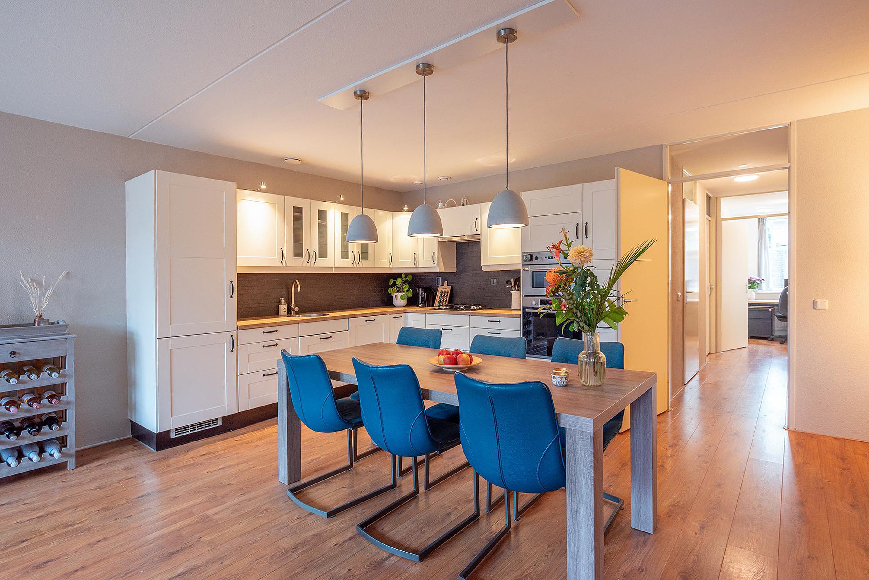 Begane grond: Entree, hal, meterkast, garderobe en deur naar woonkamer. Ruime rechthoekige woonkamer met royale open keuken. Er is voldoende ruimte voor een grote 6 persoons eettafel.