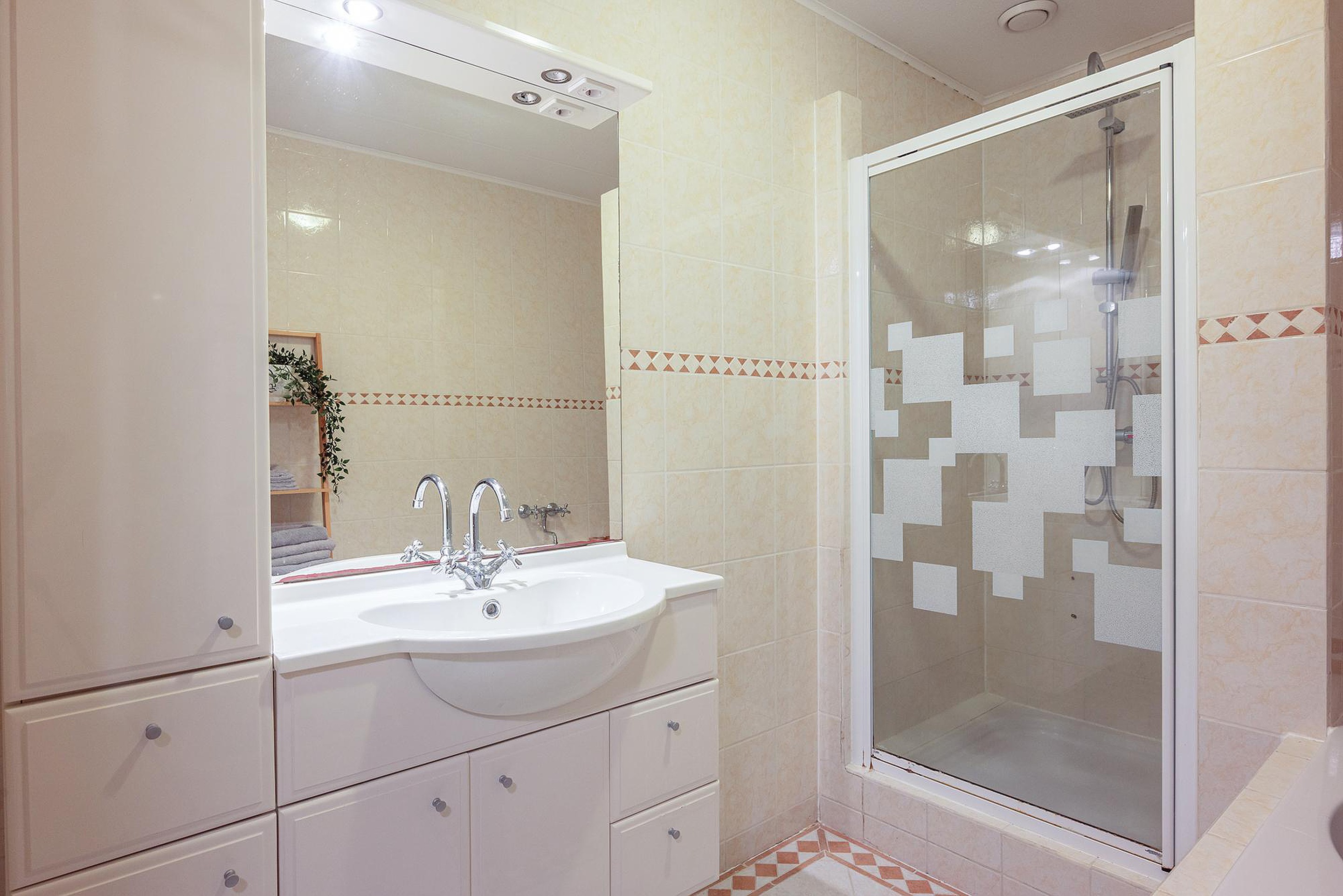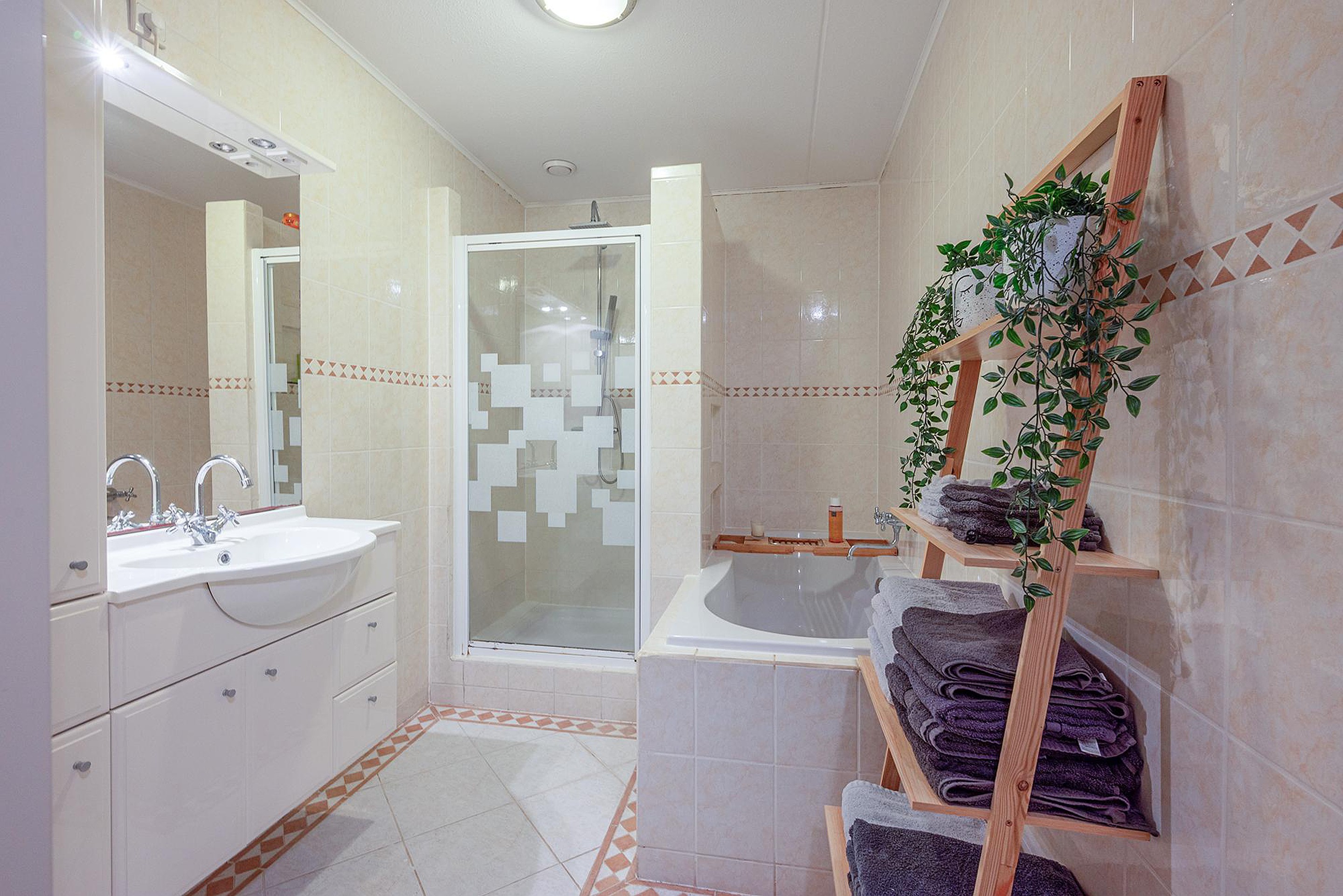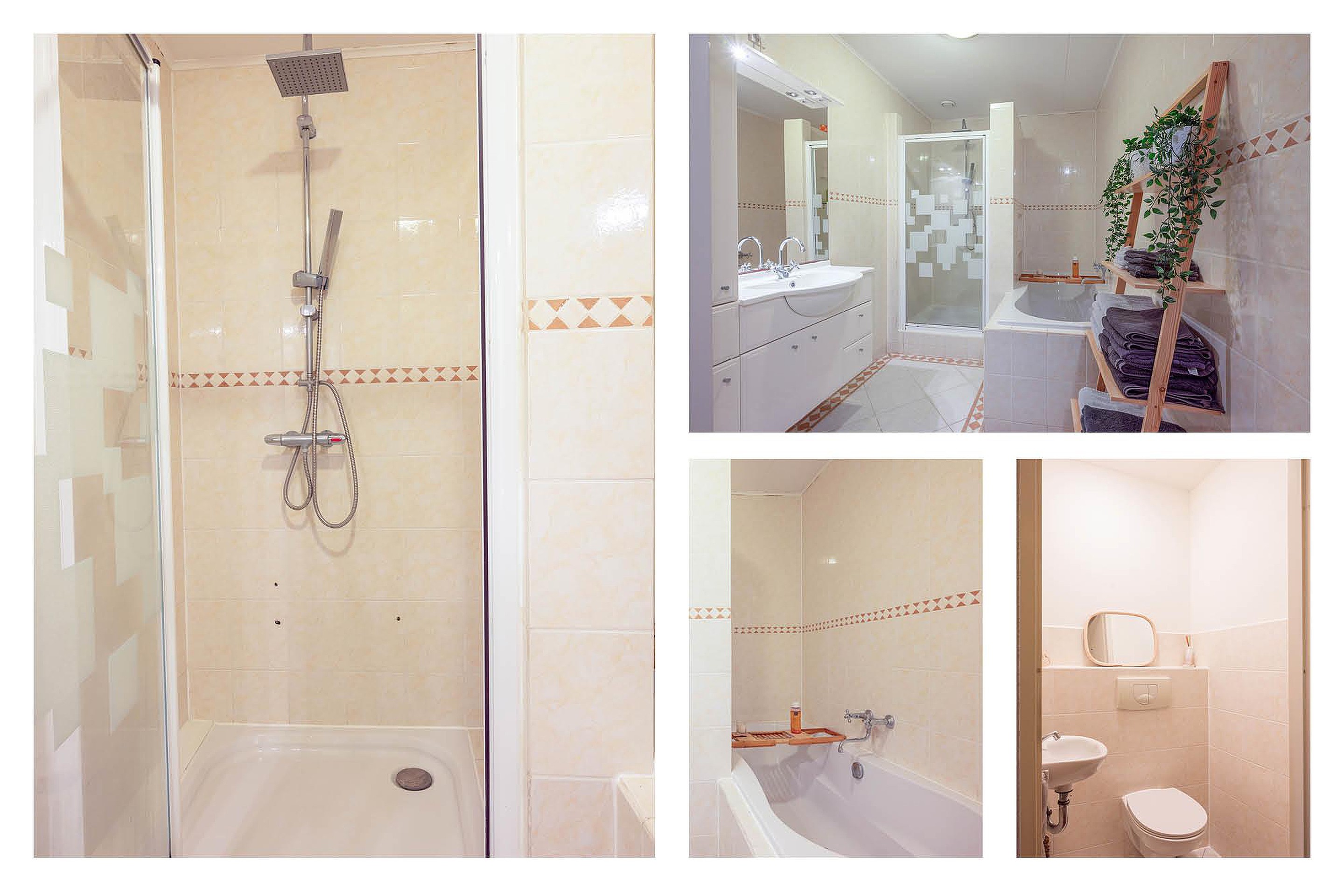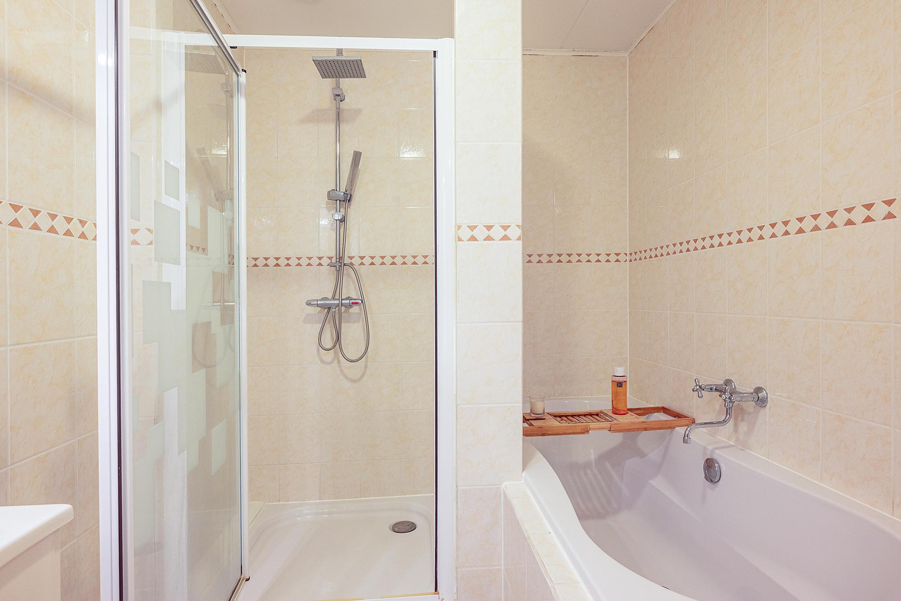 De badkamer is compleet ingericht en voorzien van een douchecabine, ligbad en wastafelmeubel met spiegel en verlichting. Deze ruimte wordt mechanisch geventileerd.