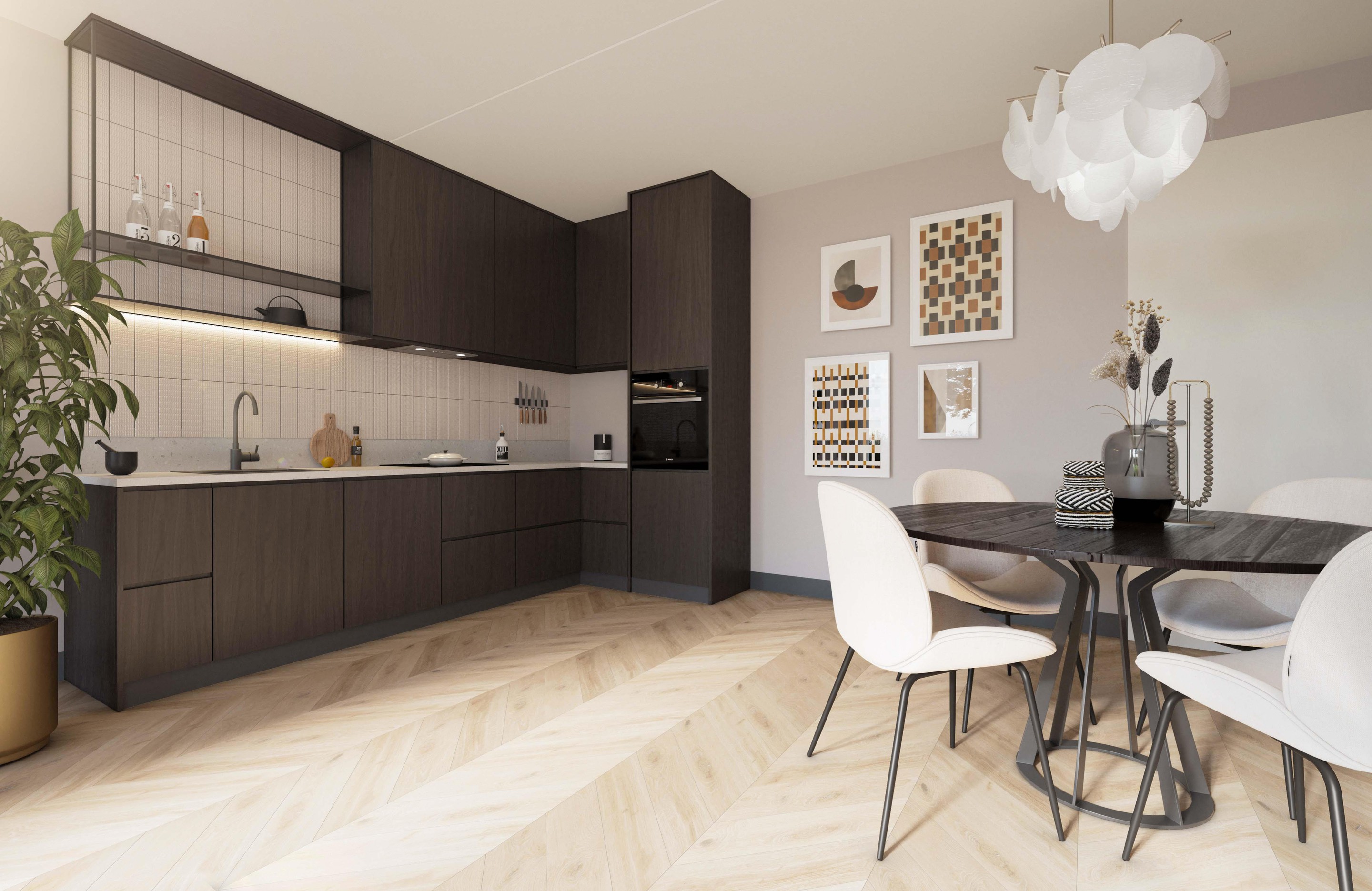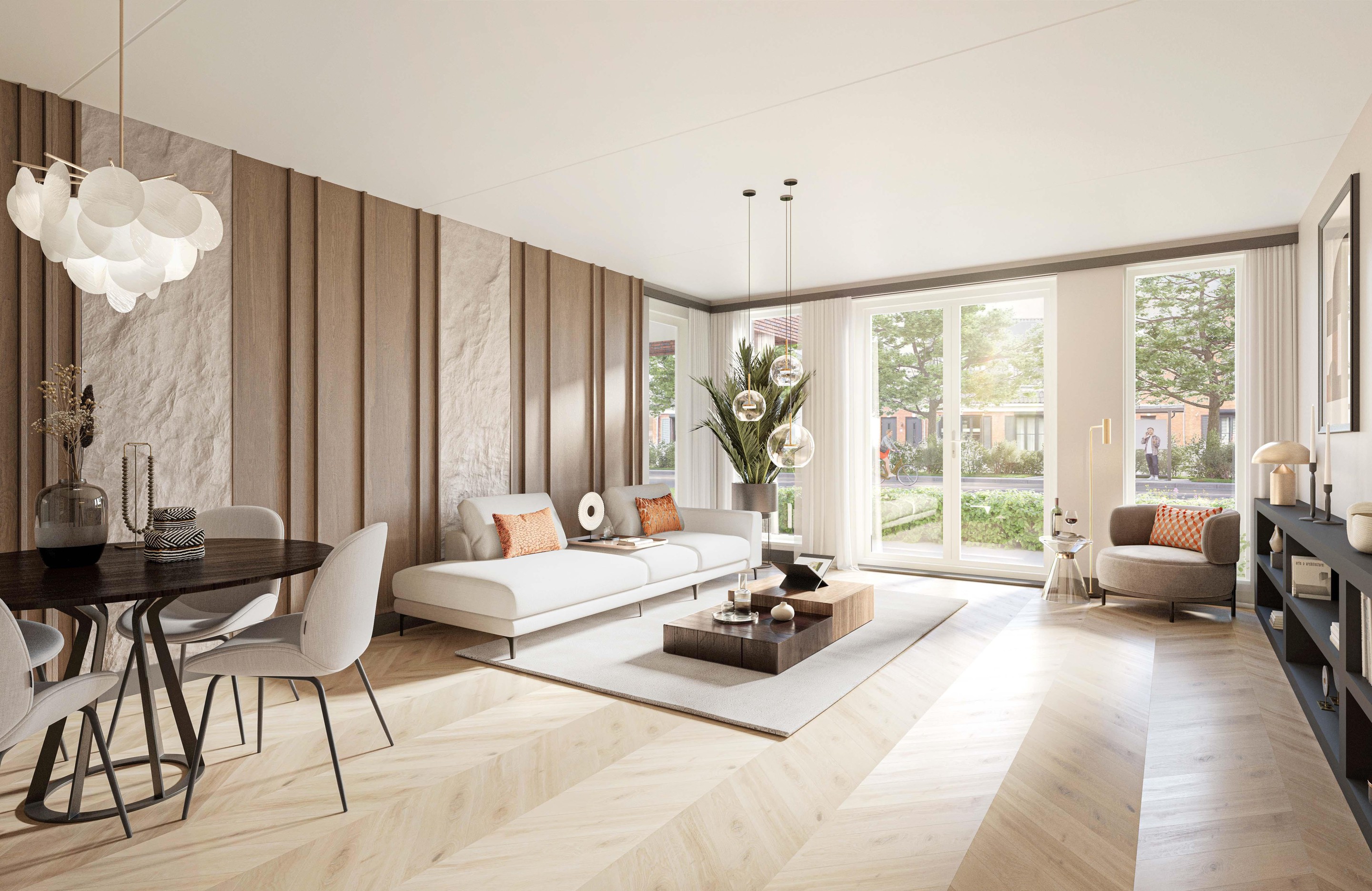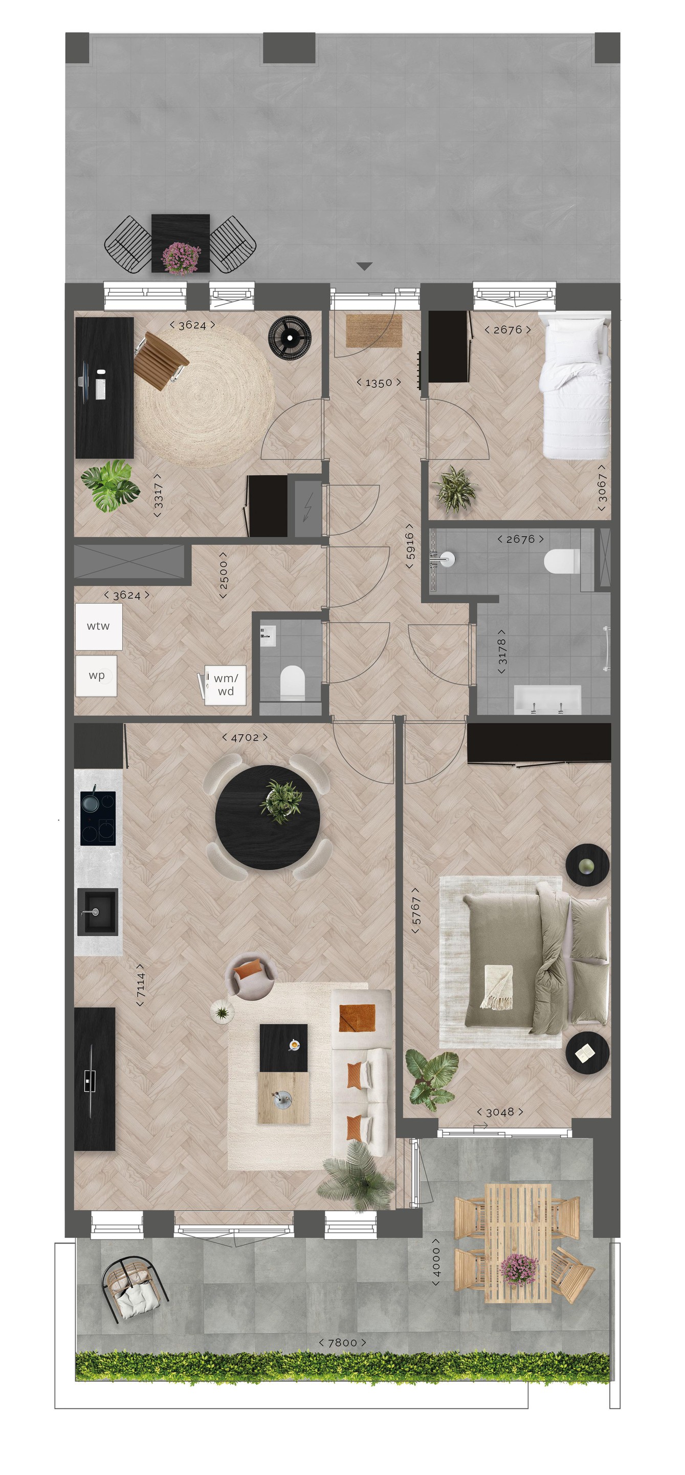 Begane grond Dit 3-kamerappartement (gelegen op de begane grond) is slim ingedeeld, zodat elke vierkante meter optimaal tot zijn recht komt. Aan de galerijzijde liggen 2 ruime slaapkamers en de royale woonkamer met open keuken richt zich naar het terras. Daarnaast beschikt dit appartement over een technische ruimte, ideaal voor opslag van een wasmachine en droger, en een ruime badkamer. Deze badkamer is zo groot dat er mogelijkheden zijn voor een indeling met een ruime douche, dubbele wastafel en 2e toilet.