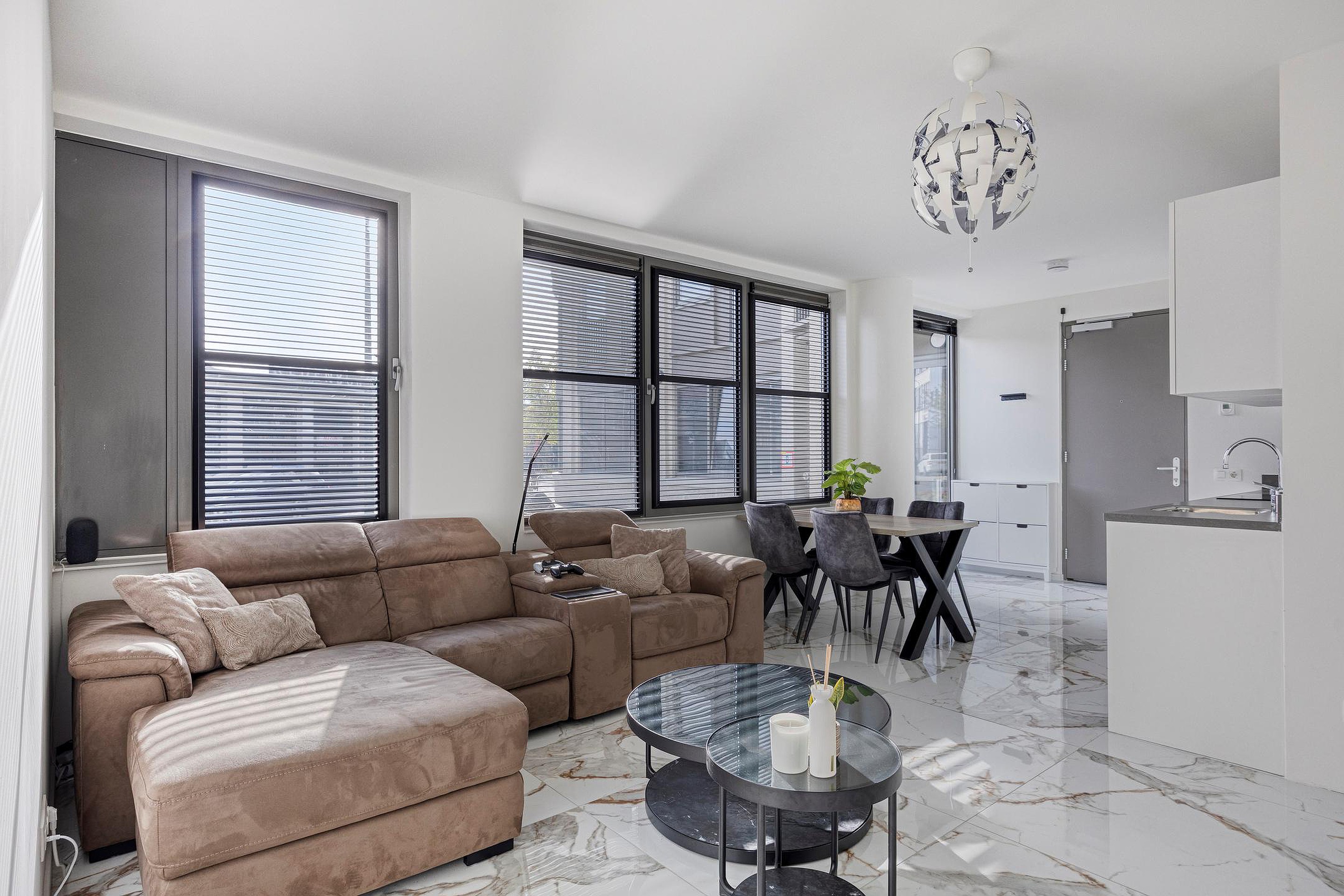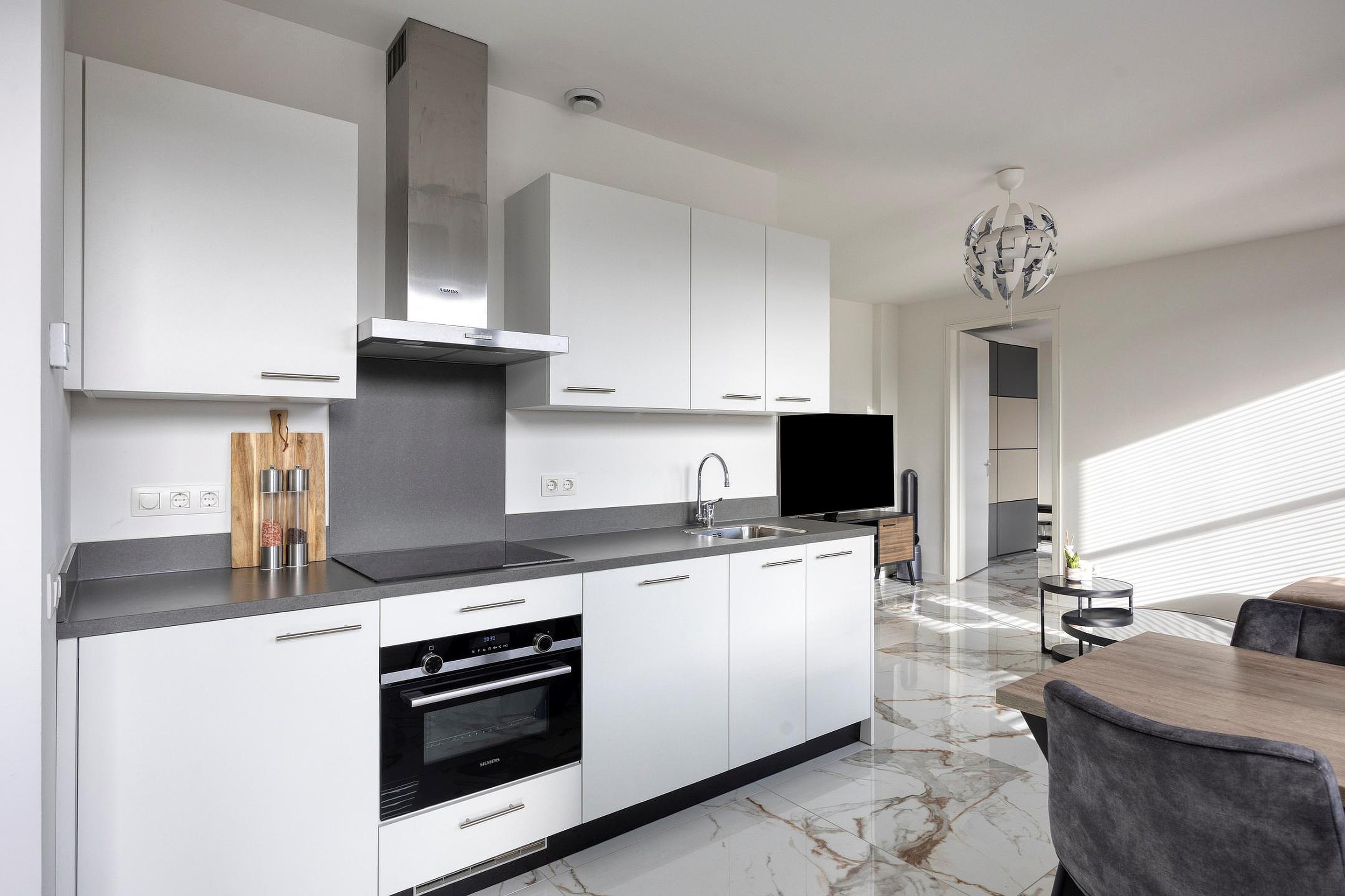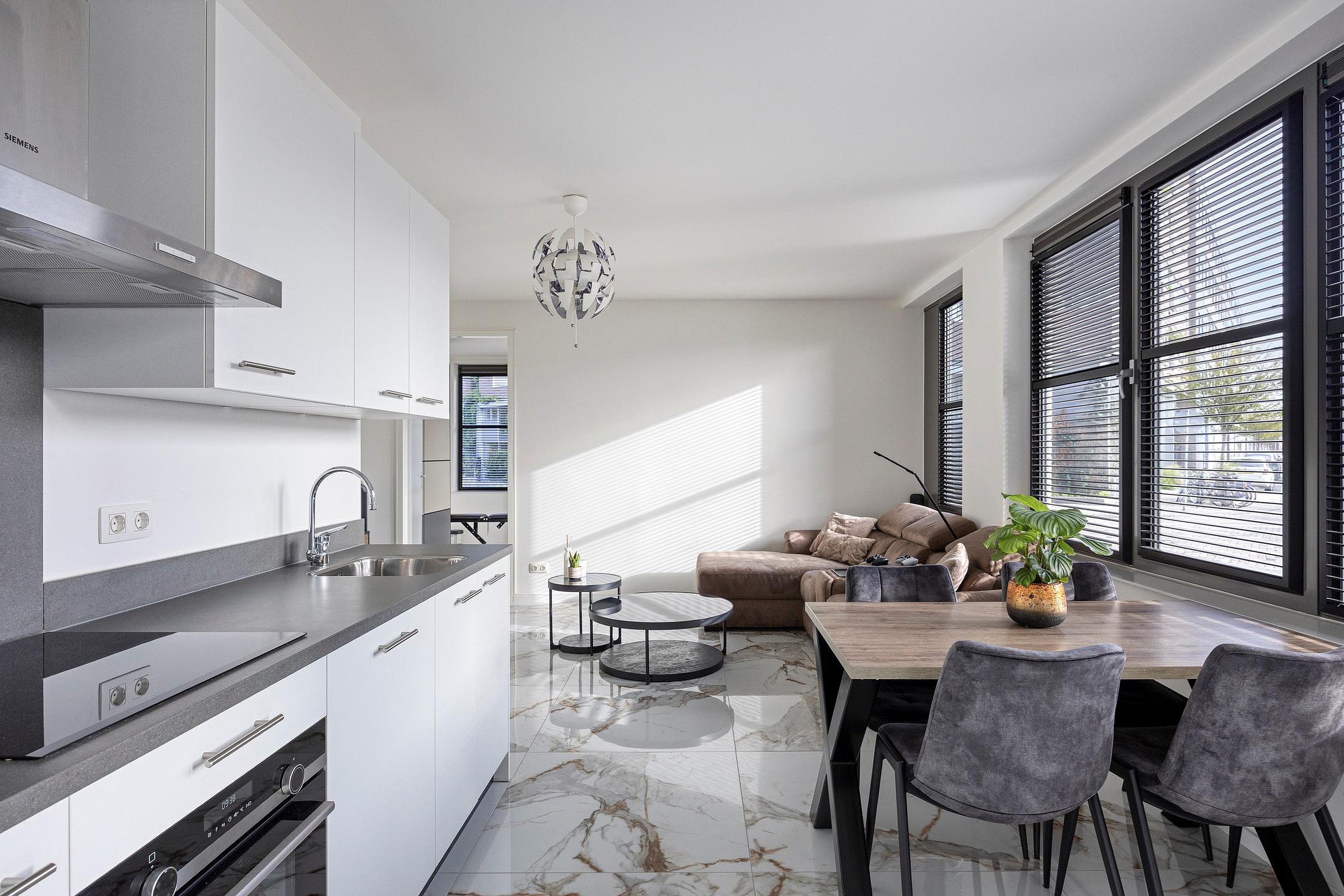 Via het trappenhuis bereik je vrijwel direct het appartement. Binnen kom je in een lichte woonkamer met open keuken, opvallend door de marmeren vloertegels en de overvloedige lichtinval. De keuken is strak en volledig uitgerust met moderne inbouwapparatuur: inductiekookplaat, combi-oven, koelkast, vaatwasser en afzuigkap. De woonkamer biedt ruimte om te ontspannen en nodigt uit tot gezellig samenkomen bij de eettafel.