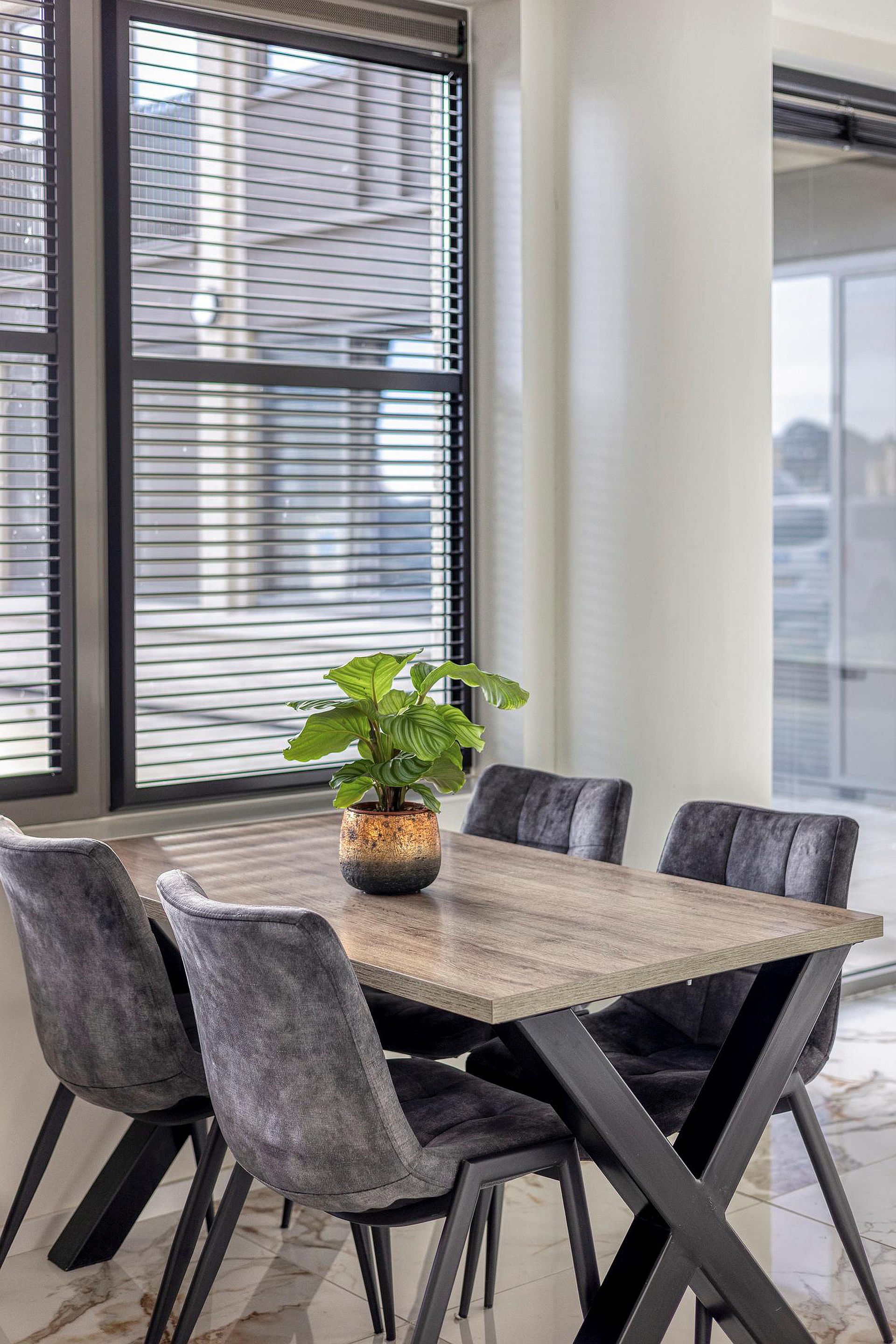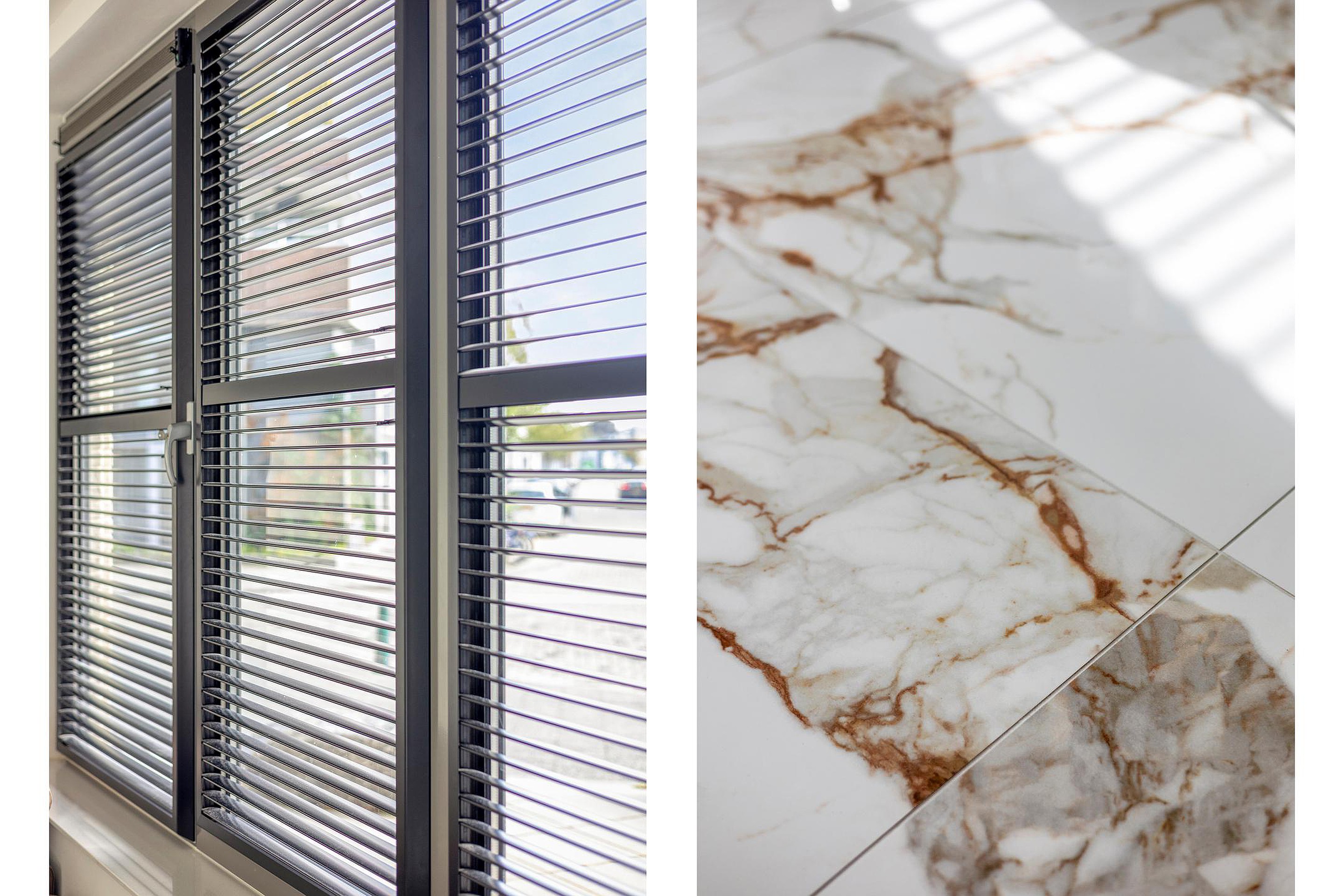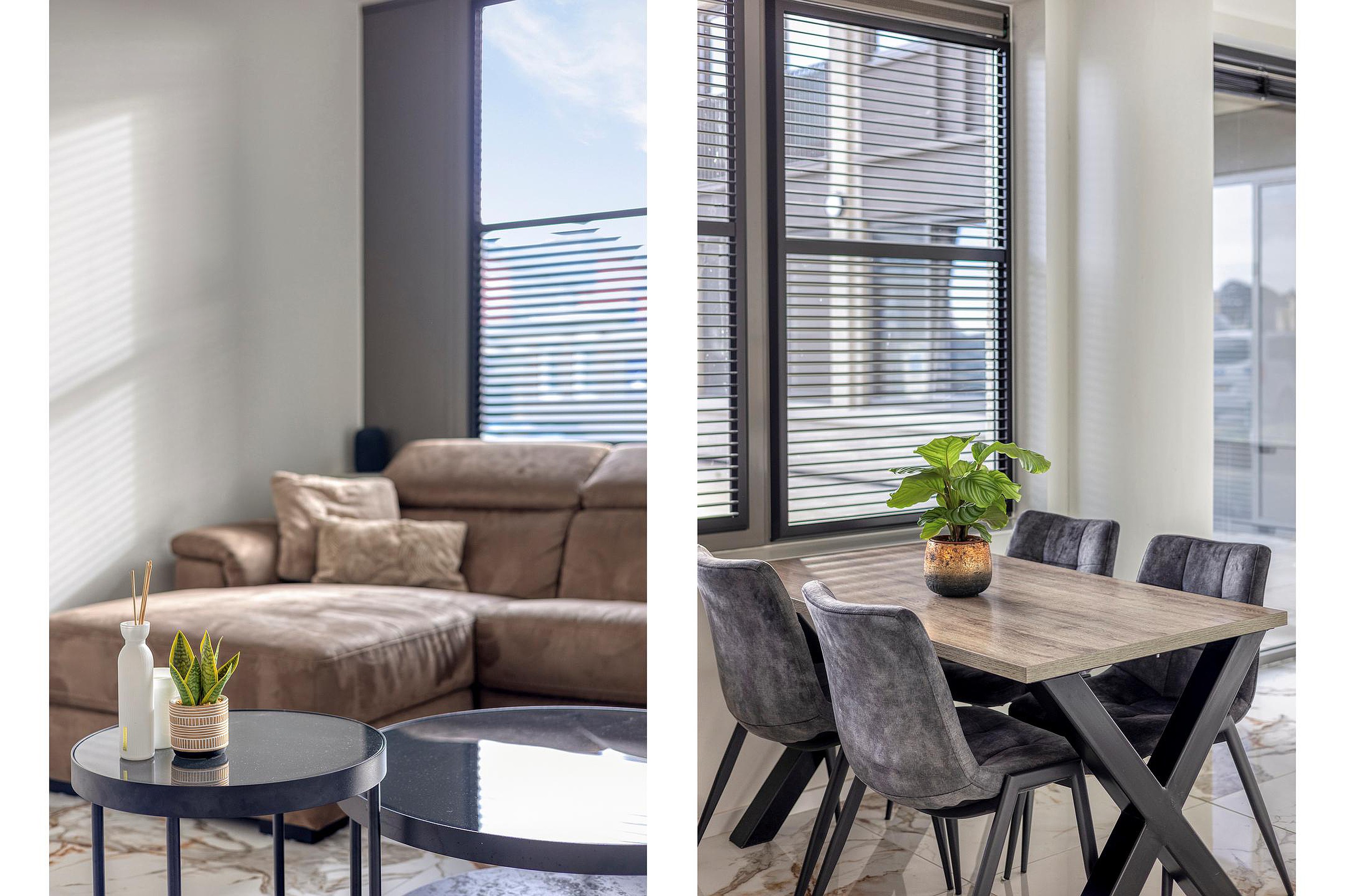 Via het trappenhuis bereik je vrijwel direct het appartement. Binnen kom je in een lichte woonkamer met open keuken, opvallend door de marmeren vloertegels en de overvloedige lichtinval. De keuken is strak en volledig uitgerust met moderne inbouwapparatuur: inductiekookplaat, combi-oven, koelkast, vaatwasser en afzuigkap. De woonkamer biedt ruimte om te ontspannen en nodigt uit tot gezellig samenkomen bij de eettafel.