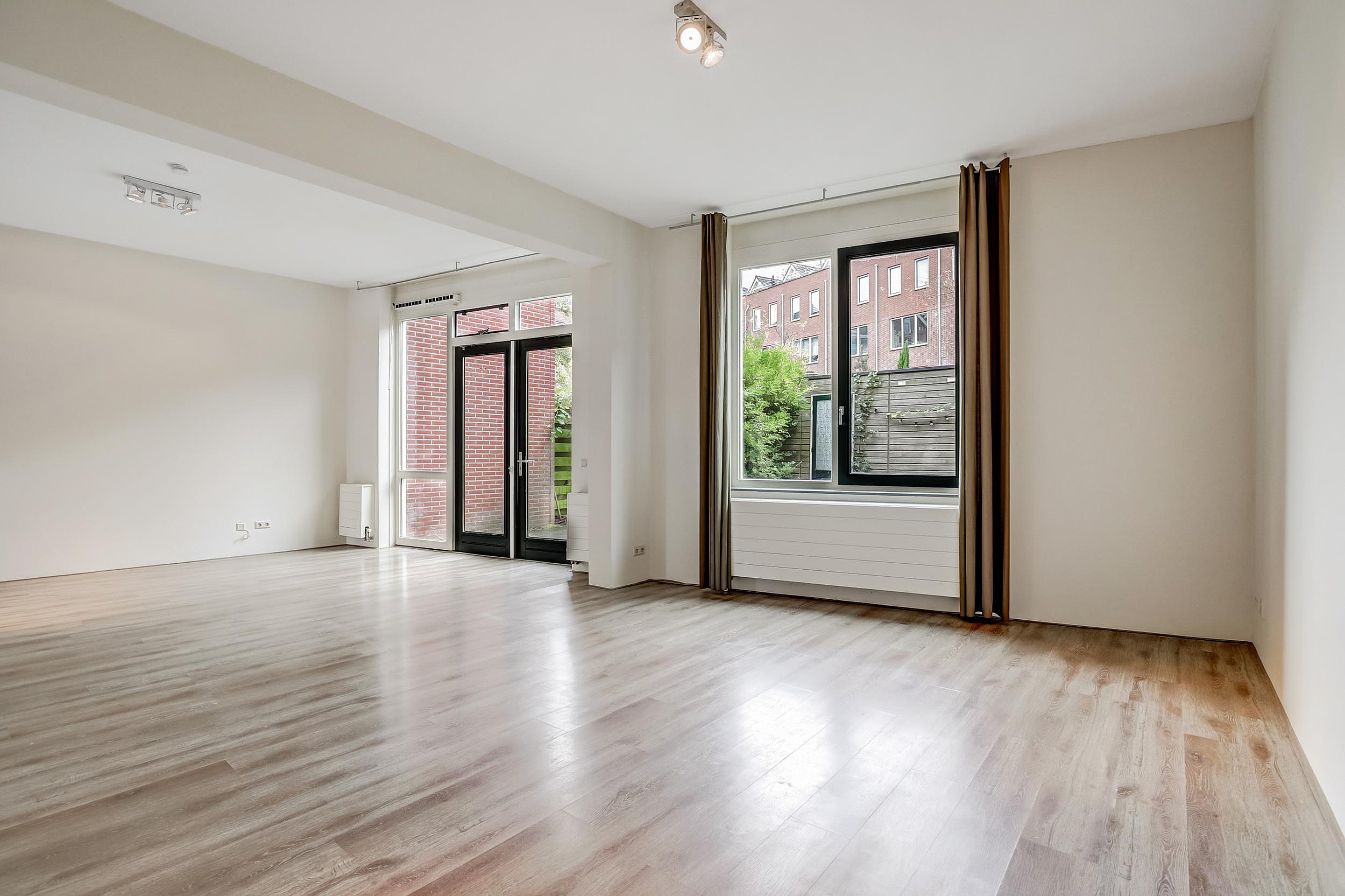 De wanden in de 65m2 grote woonkamer zijn strak afgewerkt en en een mooie eikenhouten vloer zou rust en sereniteit brengen. Het huidige laminaat is einde levensduur en aan vervanging toe dus je kunt direct je eigen smaak en sfeer in de woning brengen.