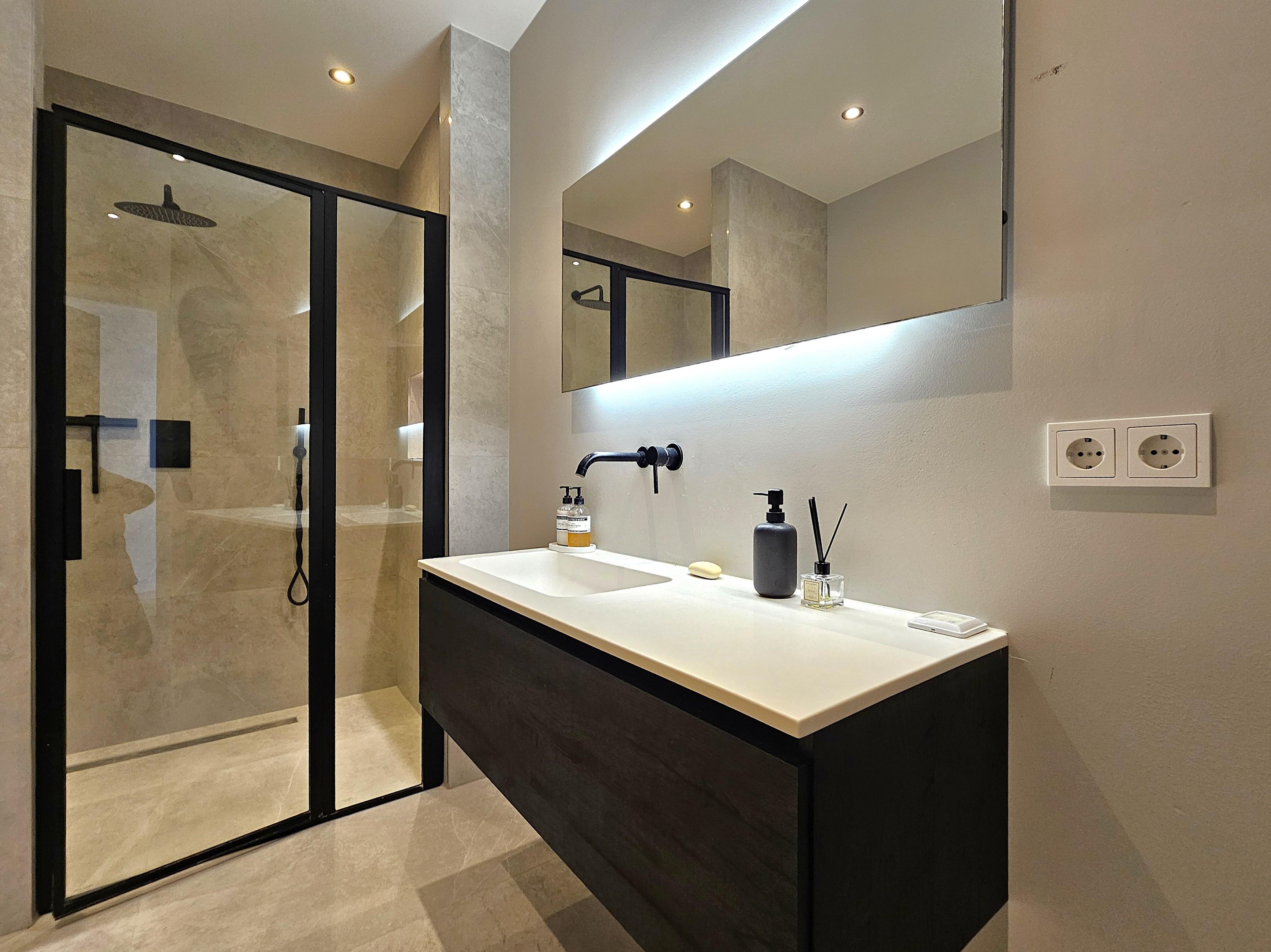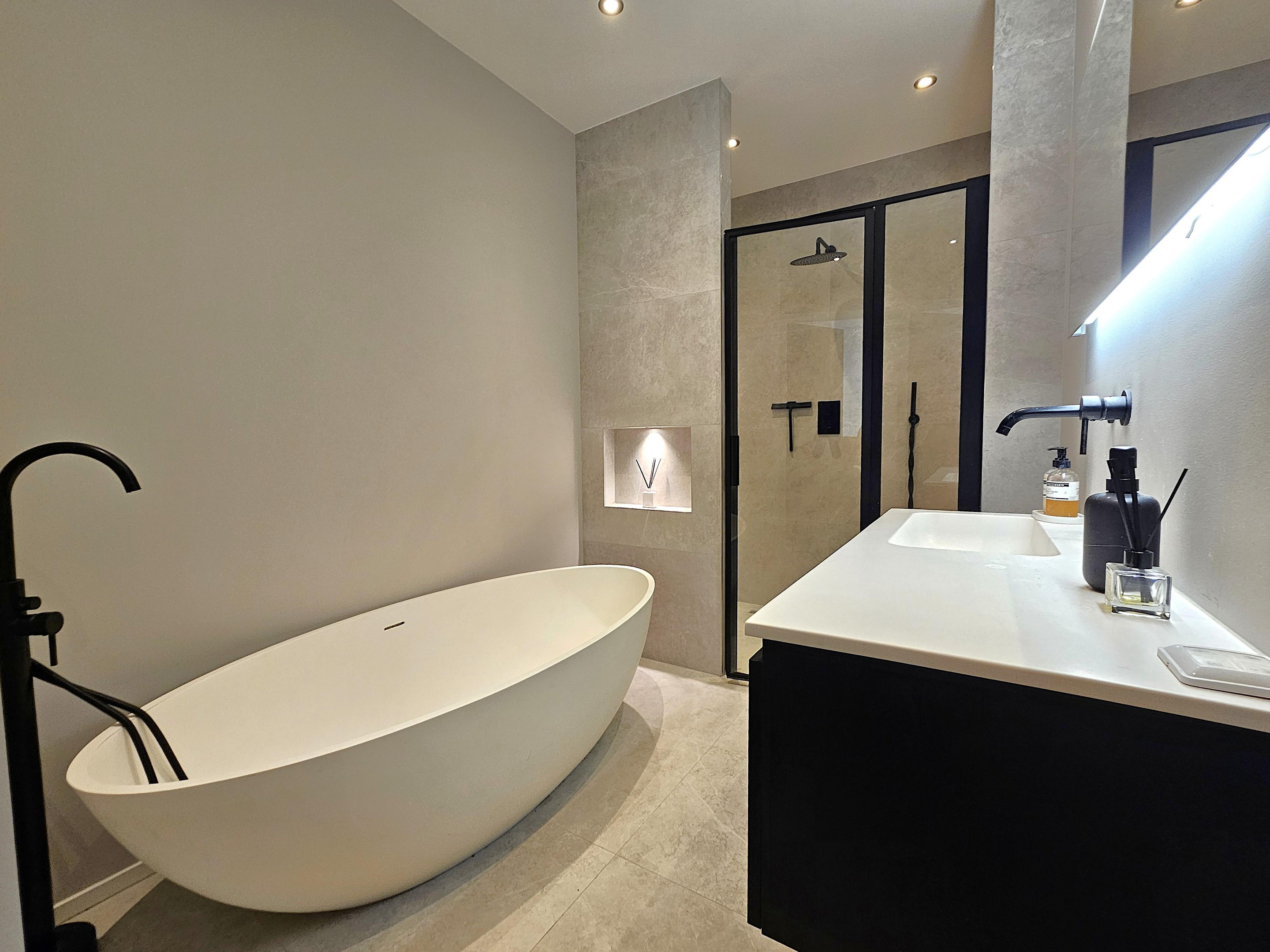 De open keuken is een droom voor elke kookliefhebber: strak design, diepe lades en topapparatuur zoals een inductiekookplaat, combi-oven en vaatwasser. De badkamer voelt als een privéspa met een inloopregendouche, design ligbad en dubbele wastafel.