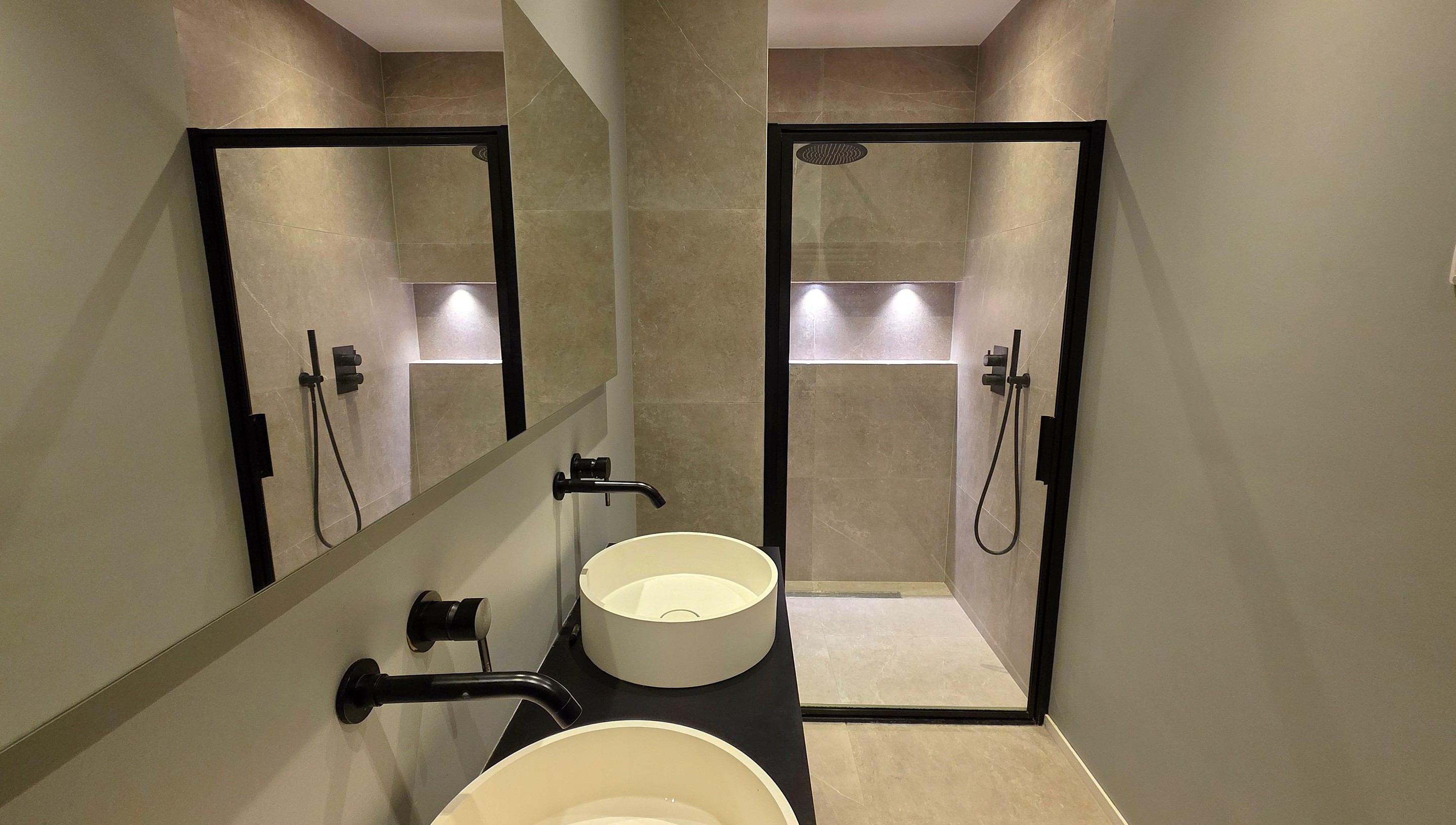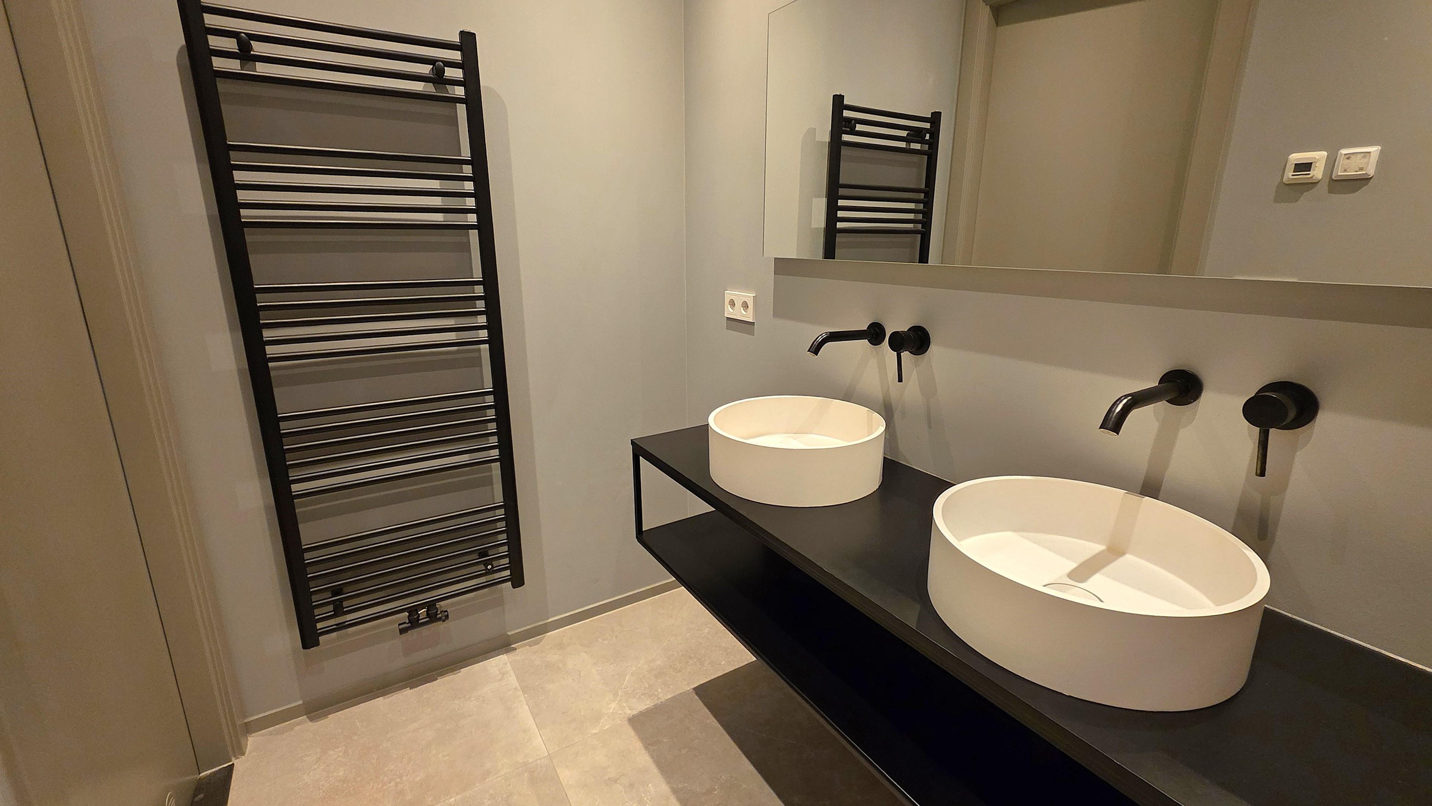 De ruime badkamer is uitgevoerd als luxe wellnessruimte en voorzien van een modern meubel met twee wastafels, een royale inloopdouche met regendouche, een designradiator én eigen vloerverwarming. Comfort op hoog niveau, elke dag opnieuw.