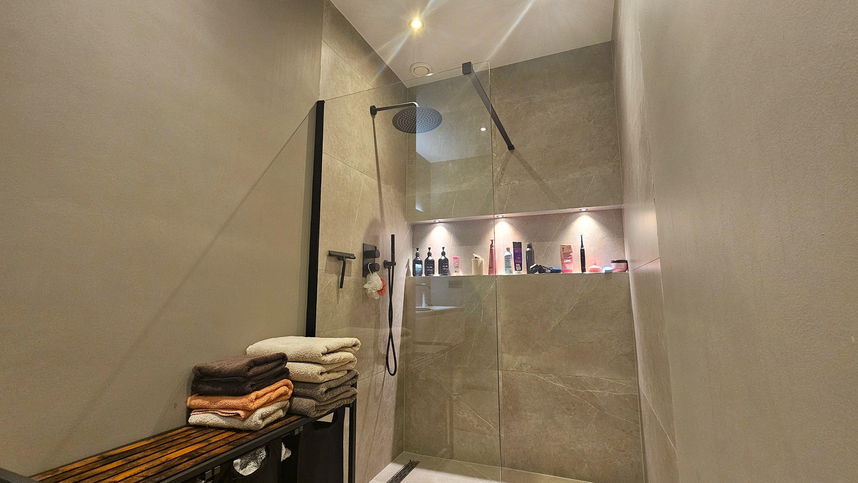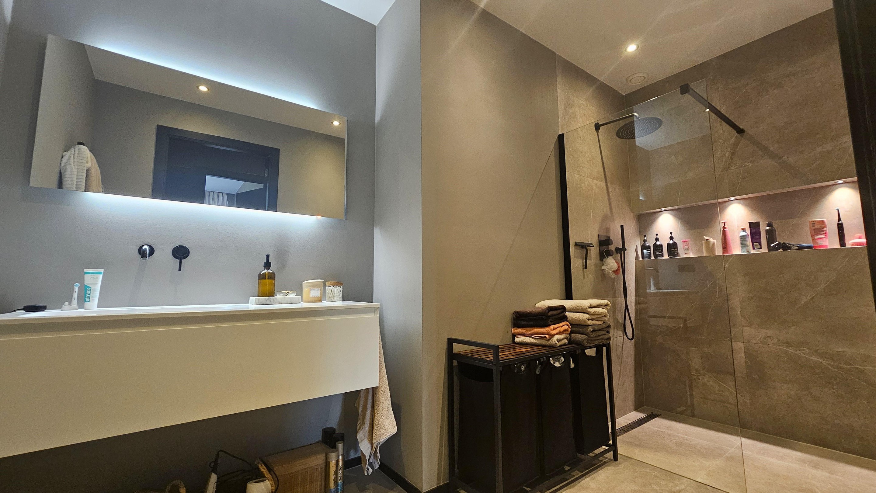 Ook de badkamer is een pareltje: modern, strak en luxe afgewerkt. Of je nu kiest voor een snelle douche of uitgebreid ontspannen, het voelt meteen als een spa-ervaring.