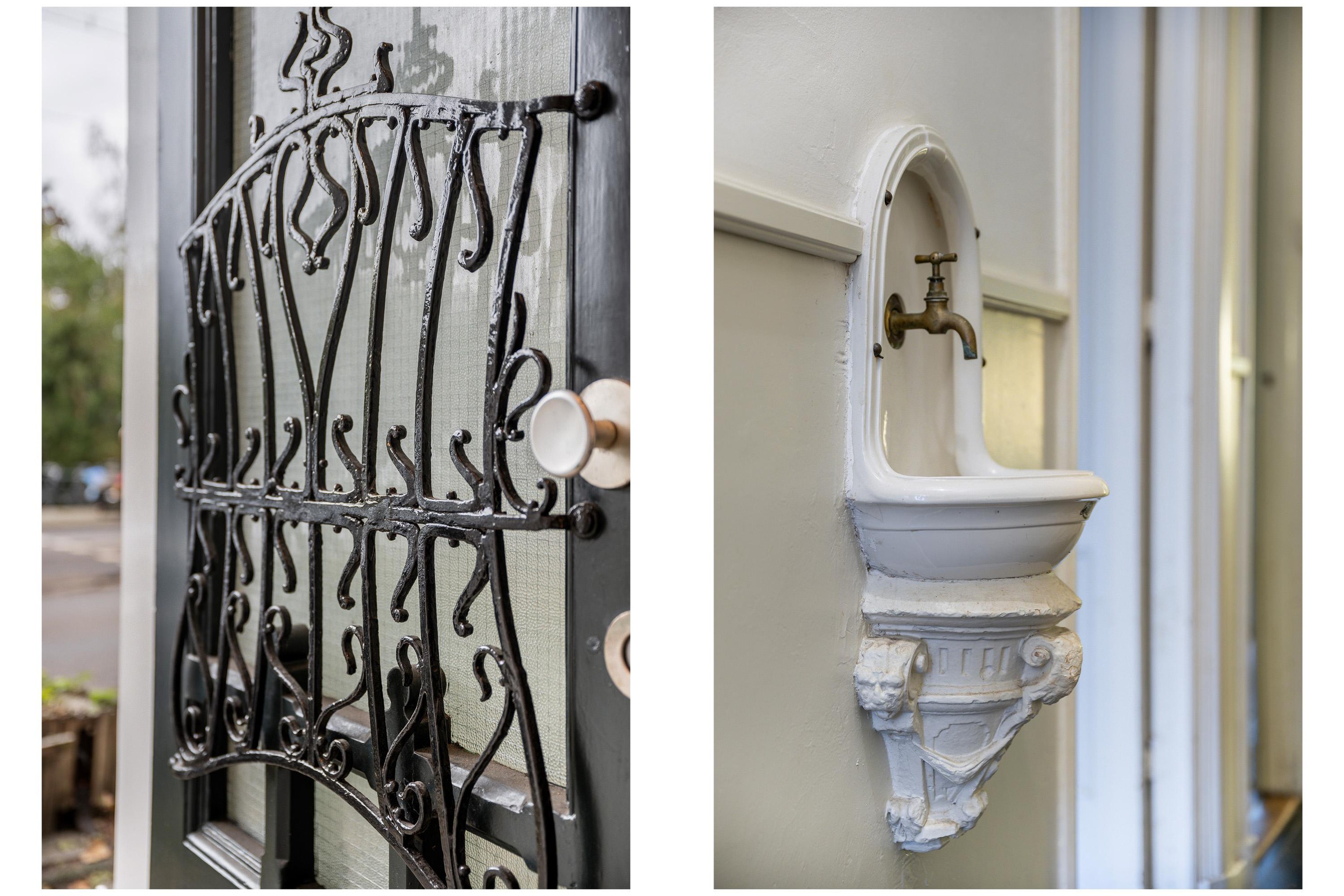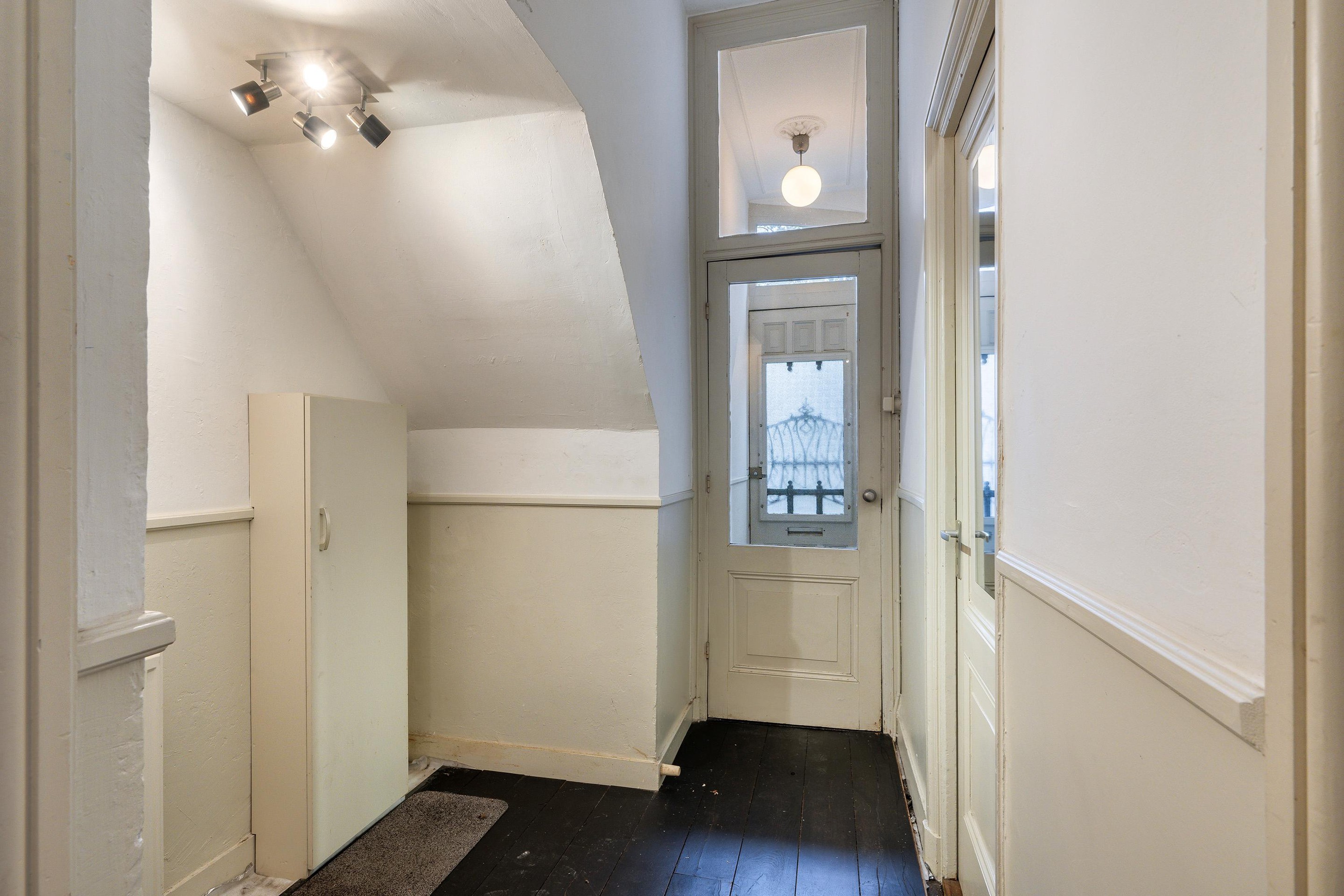 Vanaf de entree met prachtige klassieke deur, tochtportaal met originele tegels en lange gang met historisch fonteintje bereik je alle ruimtes.