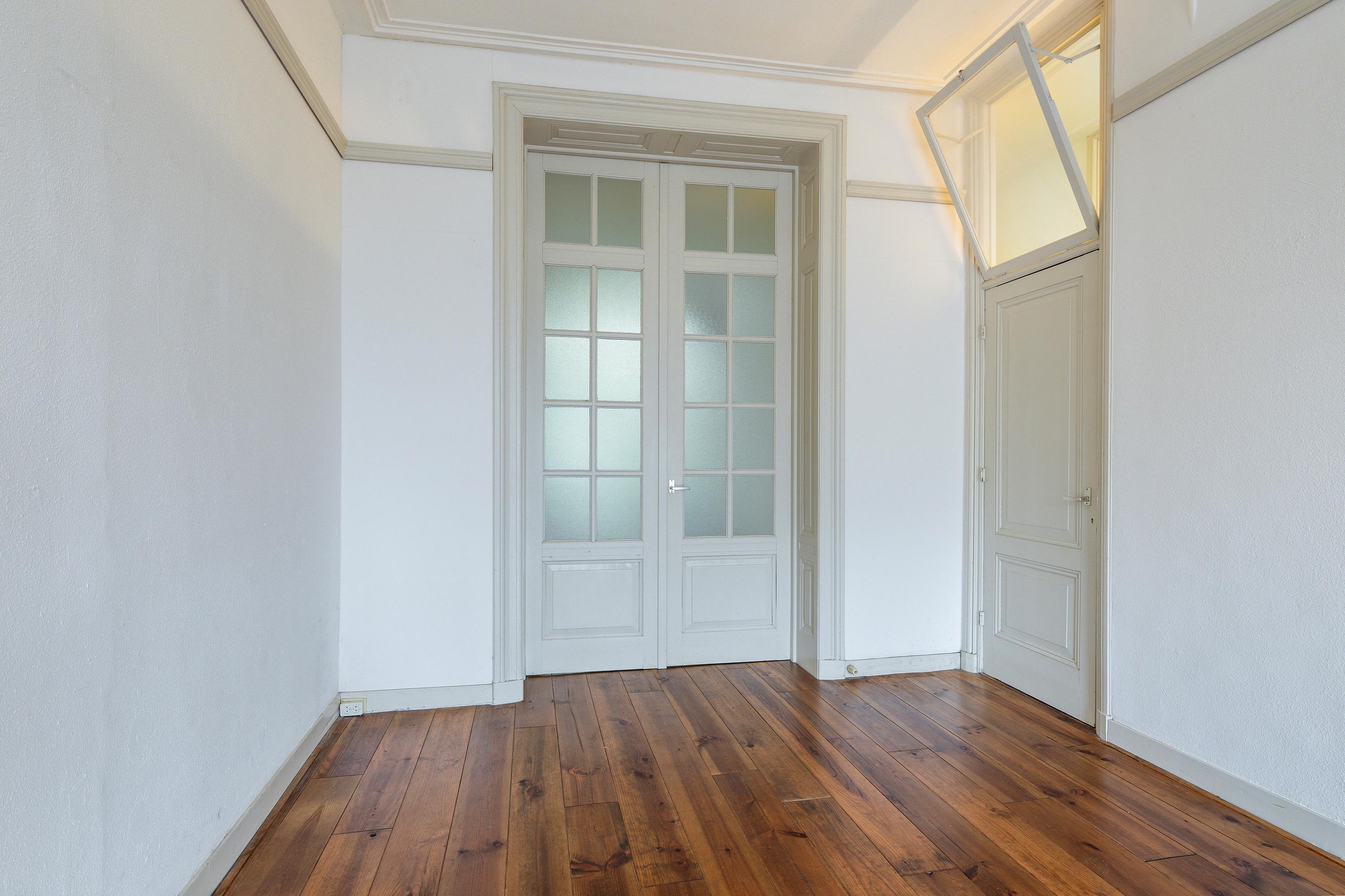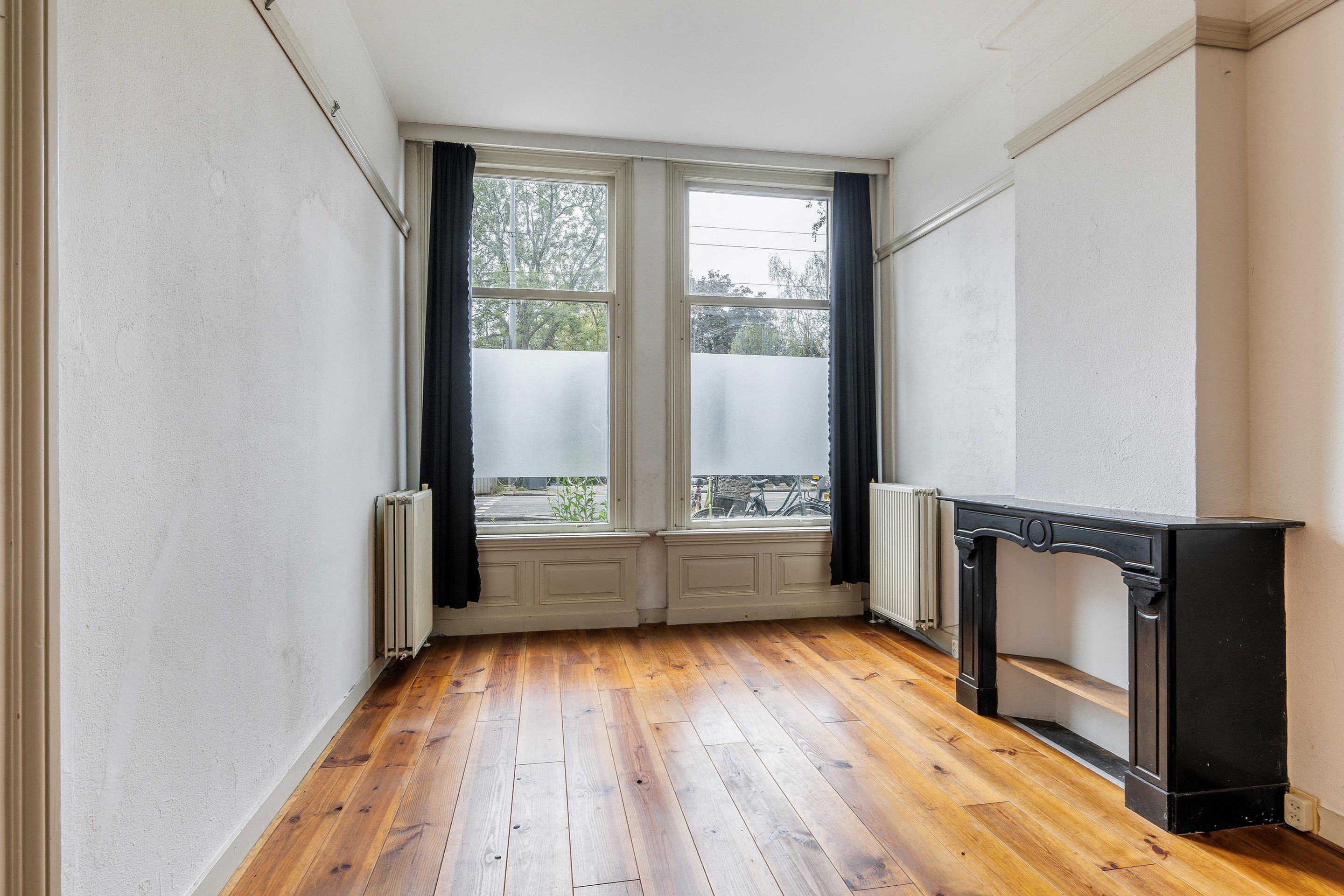 De ruime woonkamer (voorheen kamer-en-suite) biedt volop ruimte en licht, ideaal om zowel een gezellig zitgedeelte als een eethoek te creëren. Door de hoge ramen ervaar je een zee van licht en ruimte en heb je een fijn contact met de straat.