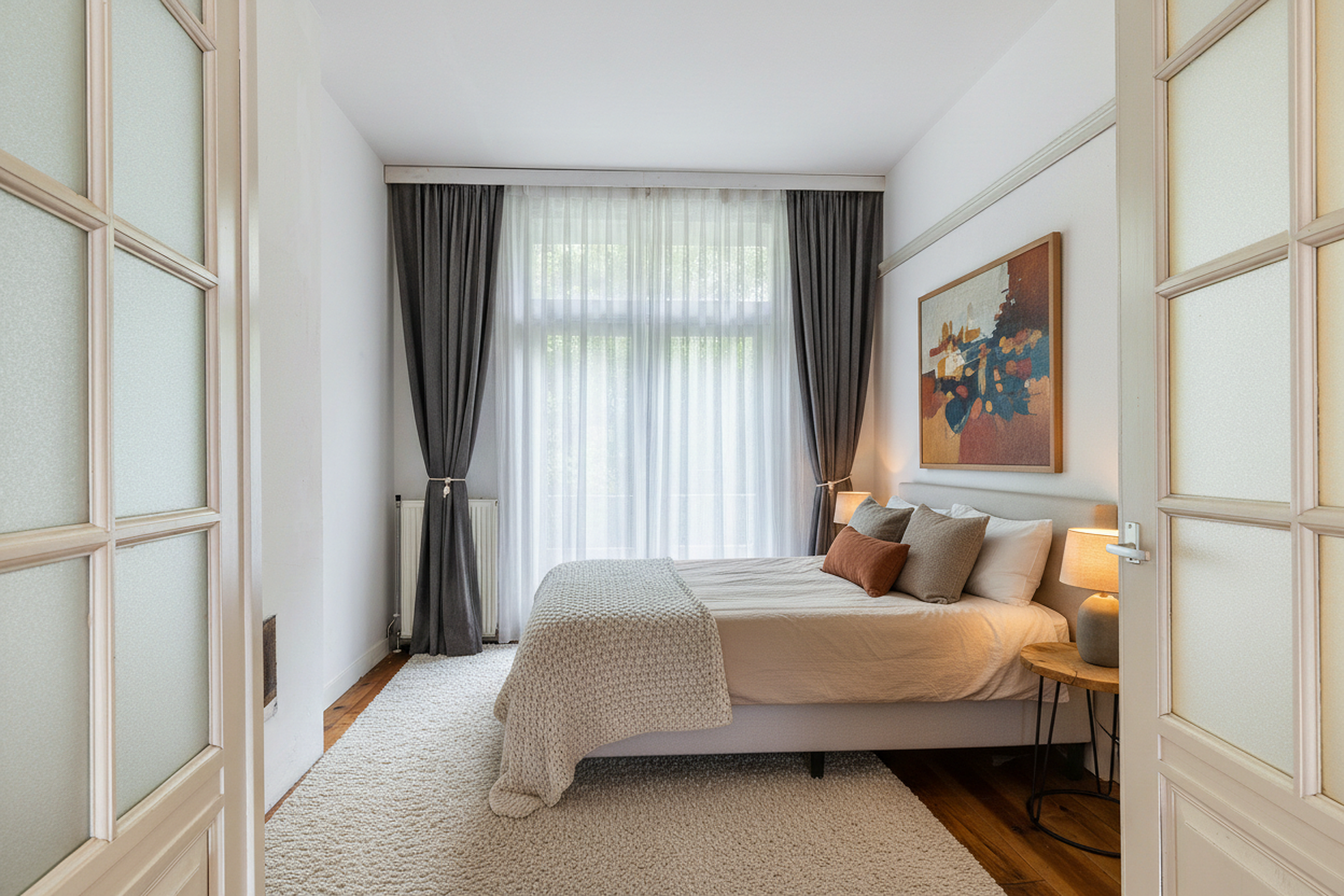 De grote slaapkamer aan de achterzijde zorgt voor rust en privacy. Een mooie eye catcher zijn de plafondhoge openslaande deuren tussen de woonkamer en de slaapkamer. Door eveneens openslaande deuren aan de achterzijde van de slaapkamer, bereik je de veranda die een gevoel van Southern Comfort uitstraalt door de hoge houten pilaren en sfeervolle houten vloerdelen.