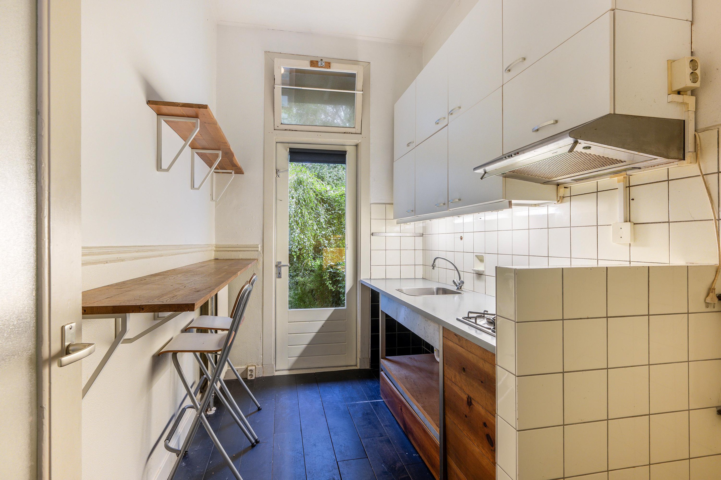 De dichte keuken is praktisch ingedeeld en biedt voldoende ruimte voor een gezellige bartafel en veel opbergruimte. Vanuit de keuken is er toegang tot de veranda en de zonnige achtertuin op het zuidwesten; een heerlijke plek om te ontspannen, te tuinieren of te genieten van lange zomeravonden.